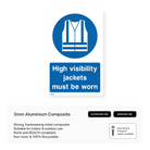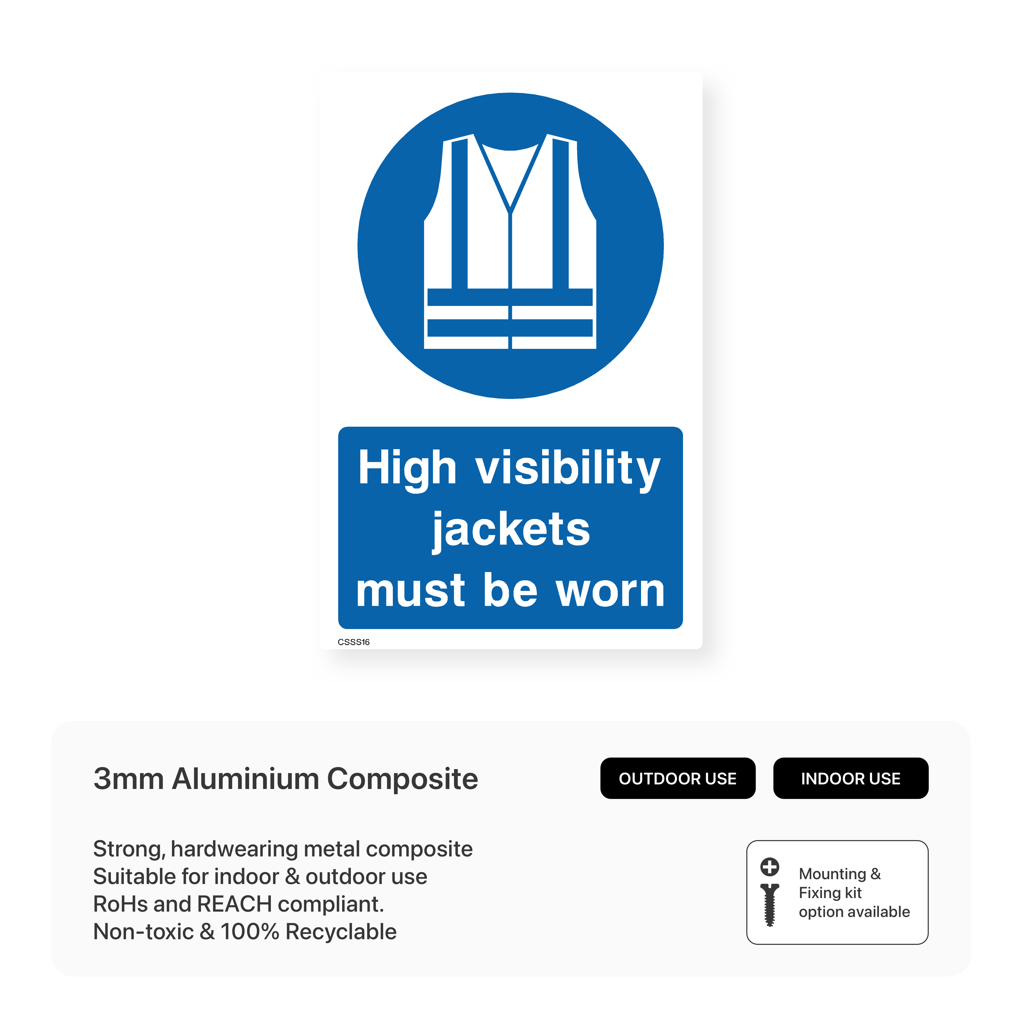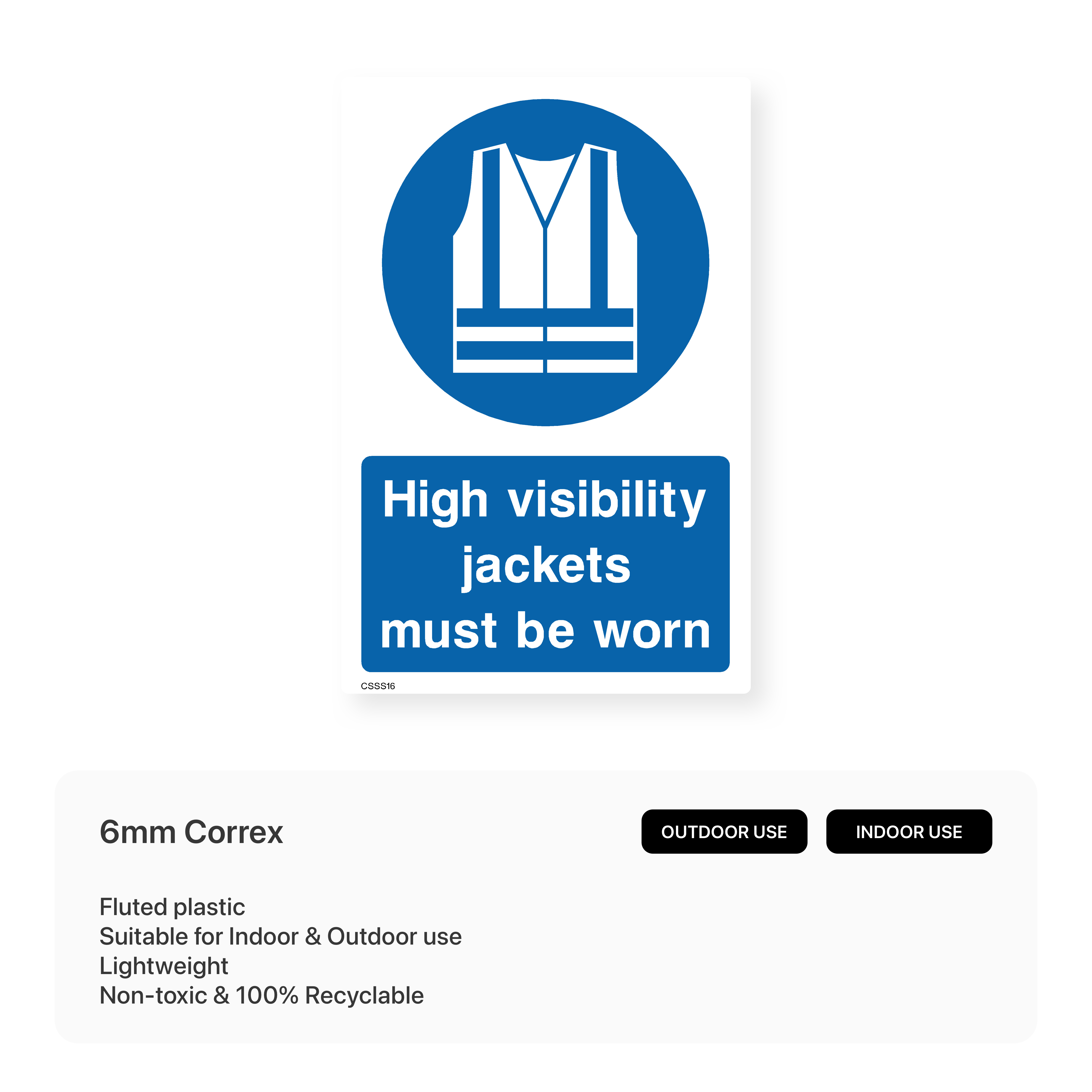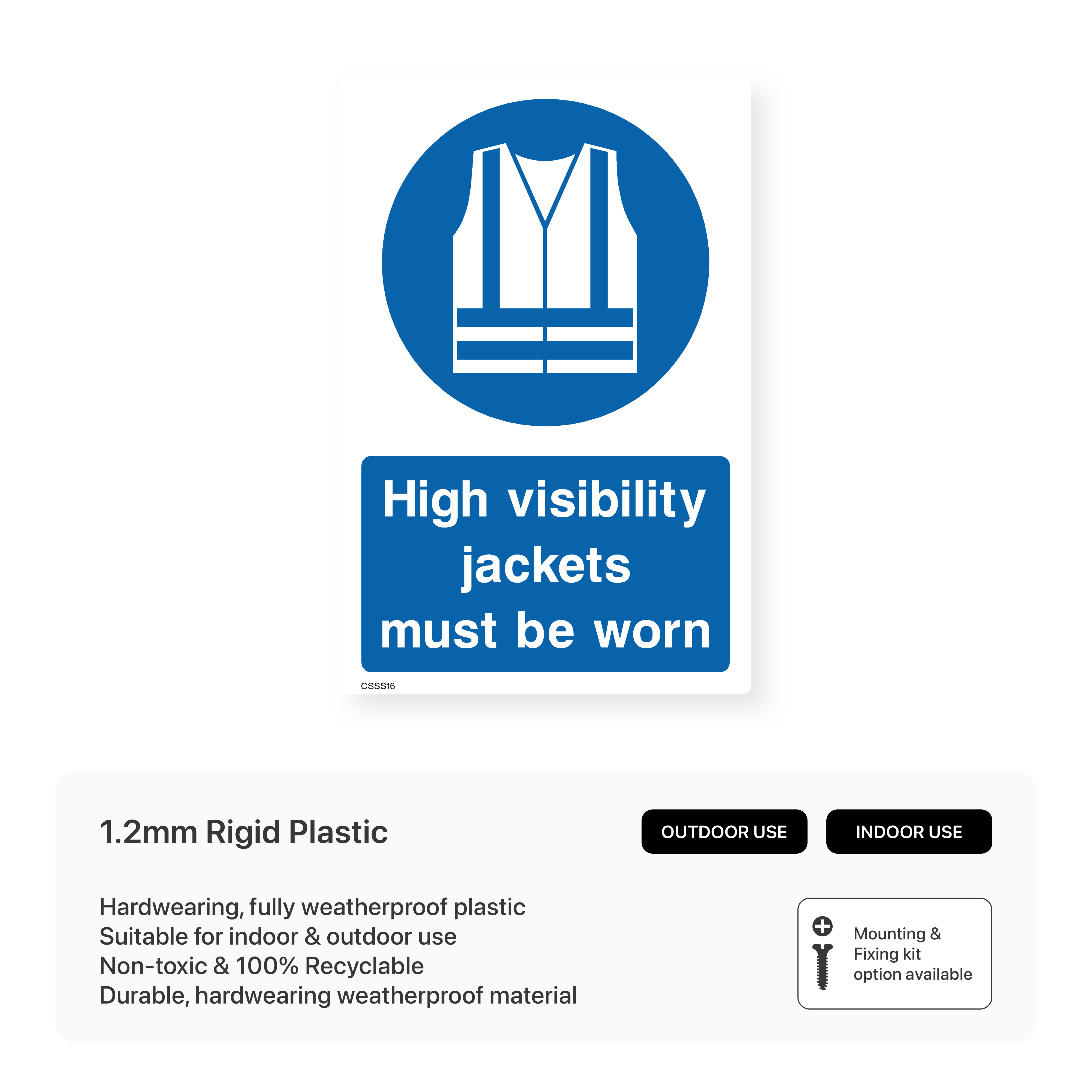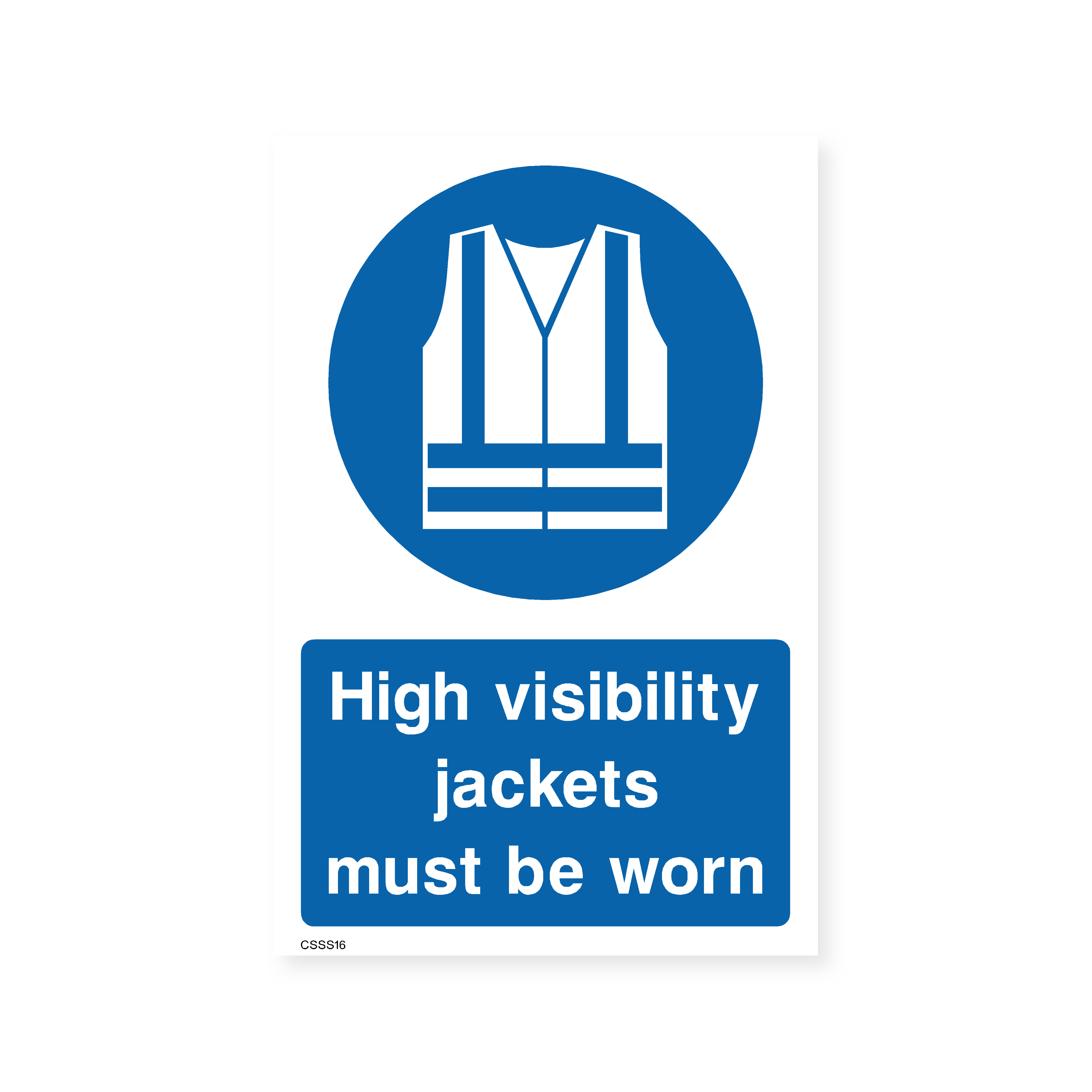 Ensure worker visibility and safety with our "High visibility jackets must be worn" sign. This sign clearly communicates the mandatory use of high-visibility clothing in designated areas to reduce the risk of accidents and enhance worker safety on your construction site.
