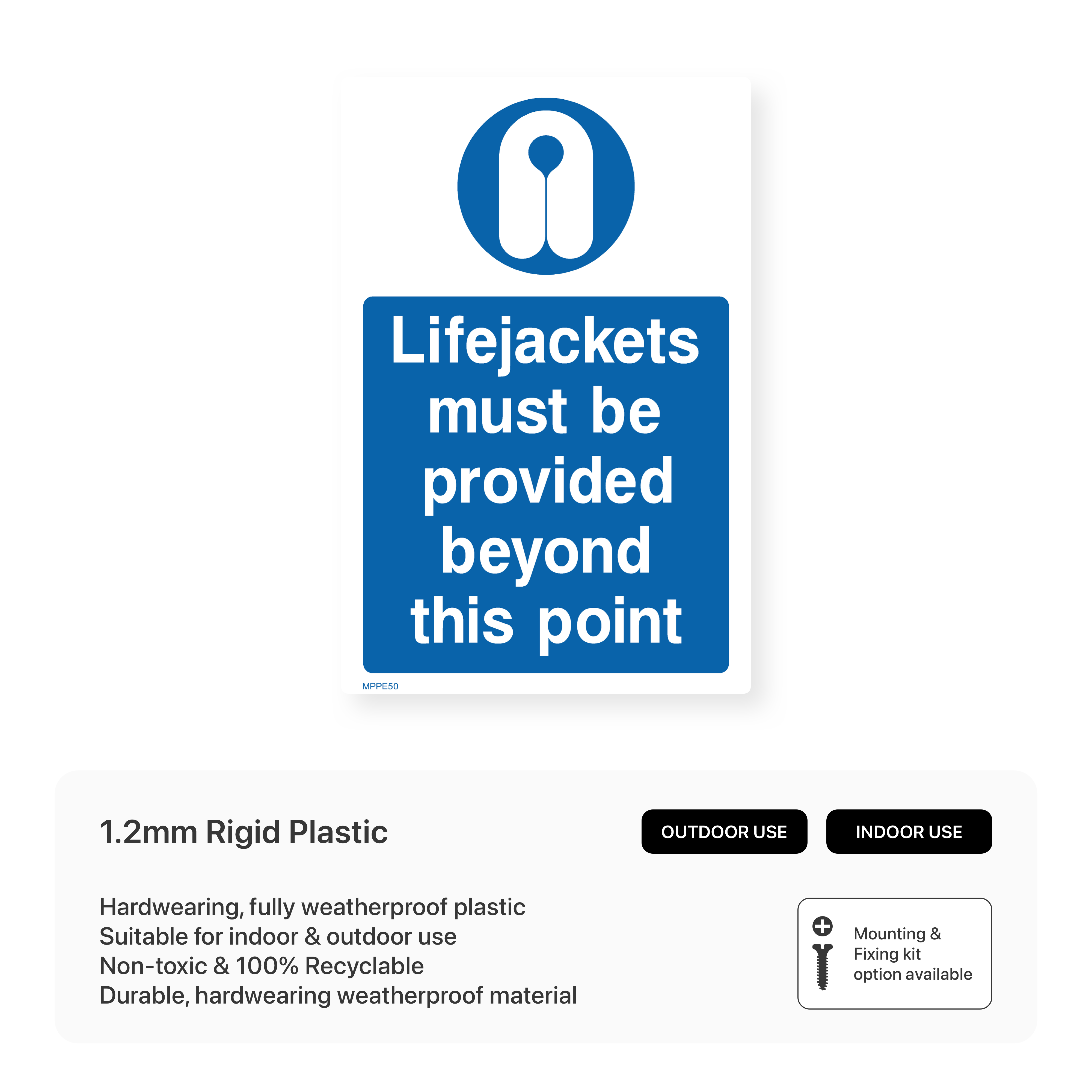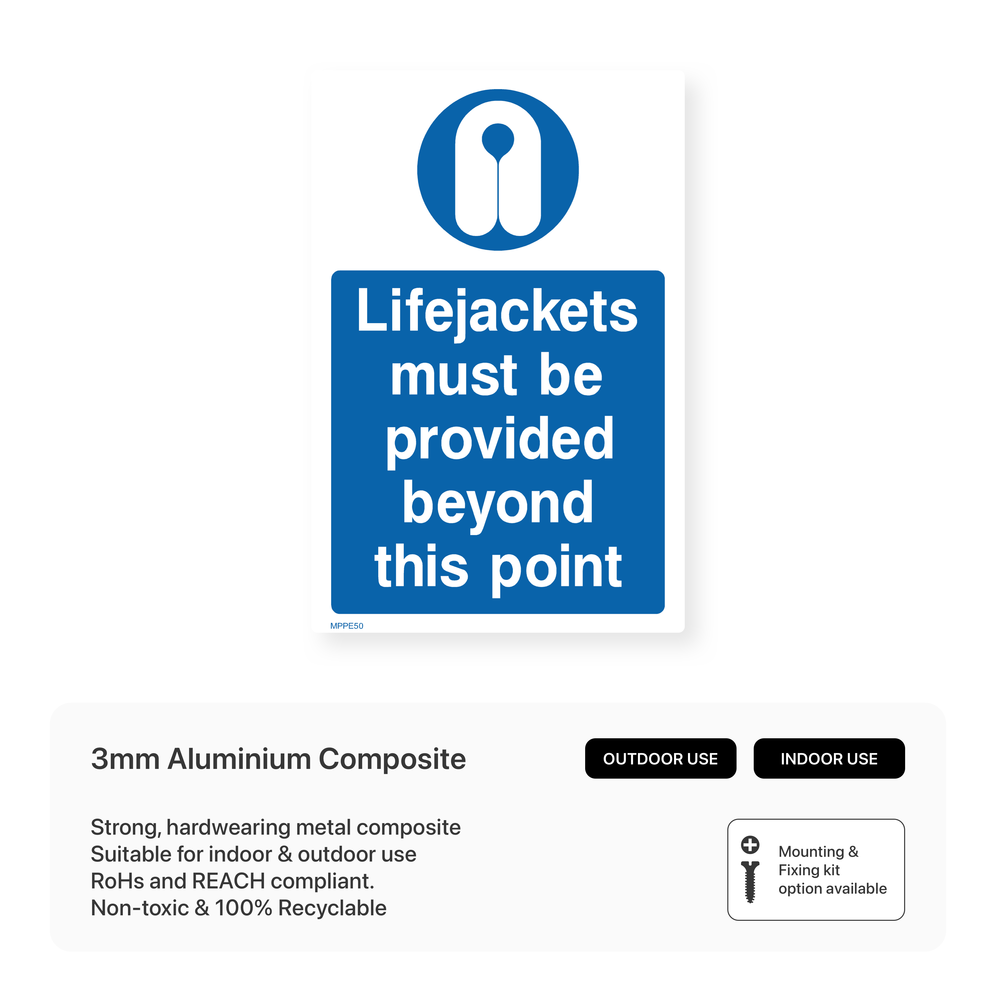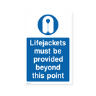 Enhance water safety and ensure compliance with regulations with our "Lifejackets Must Be Provided Beyond This Point" portrait sign. Clearly mark areas where lifejackets are mandatory to prevent drowning and accidents. Choose from various sizes and materials to suit your specific needs and create a safer environment for all.