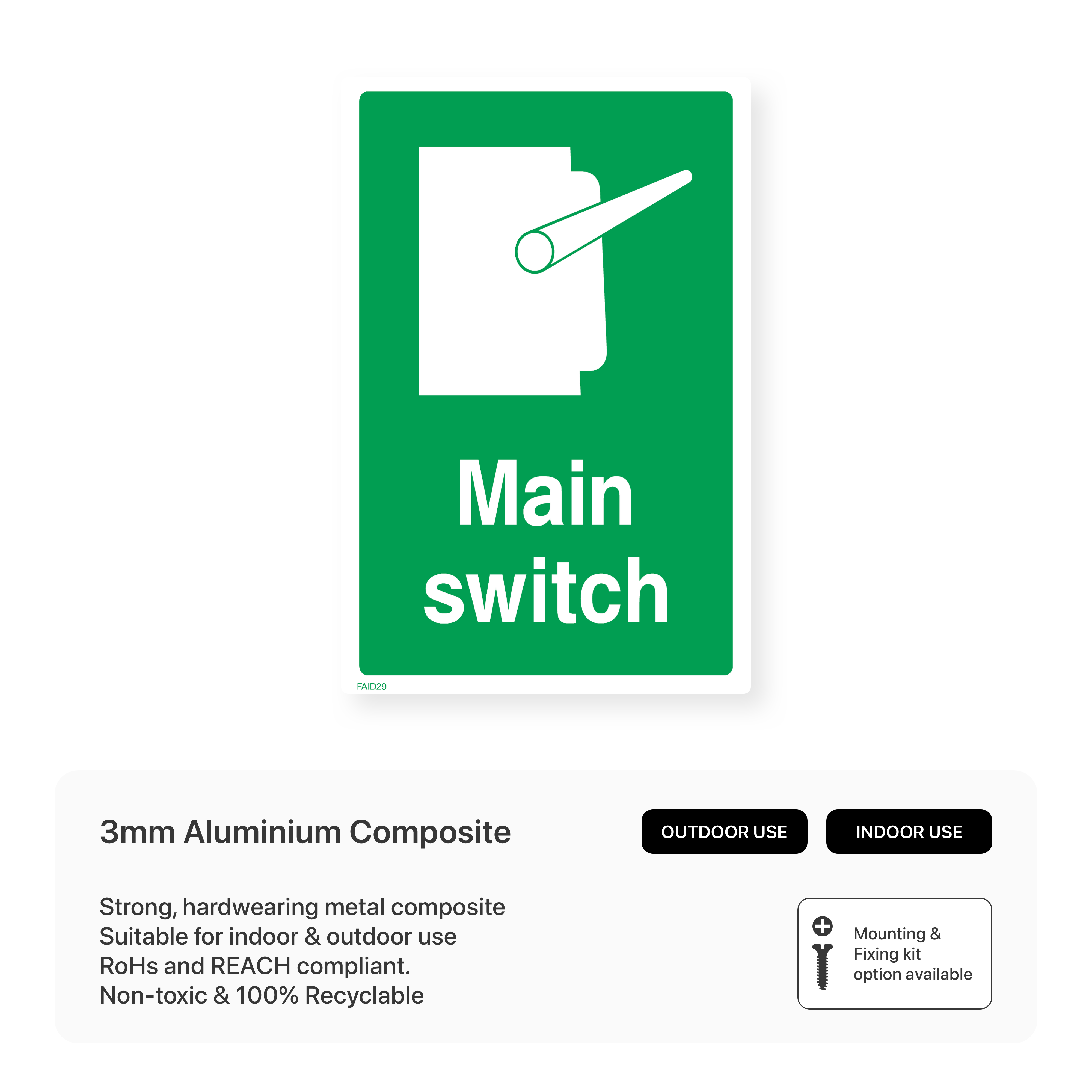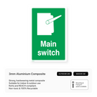 Clearly mark the location of the main electrical switch with our "Main switch" sign. This sign helps personnel quickly locate and shut off the main power supply in case of electrical emergencies, preventing further damage and ensuring safety.