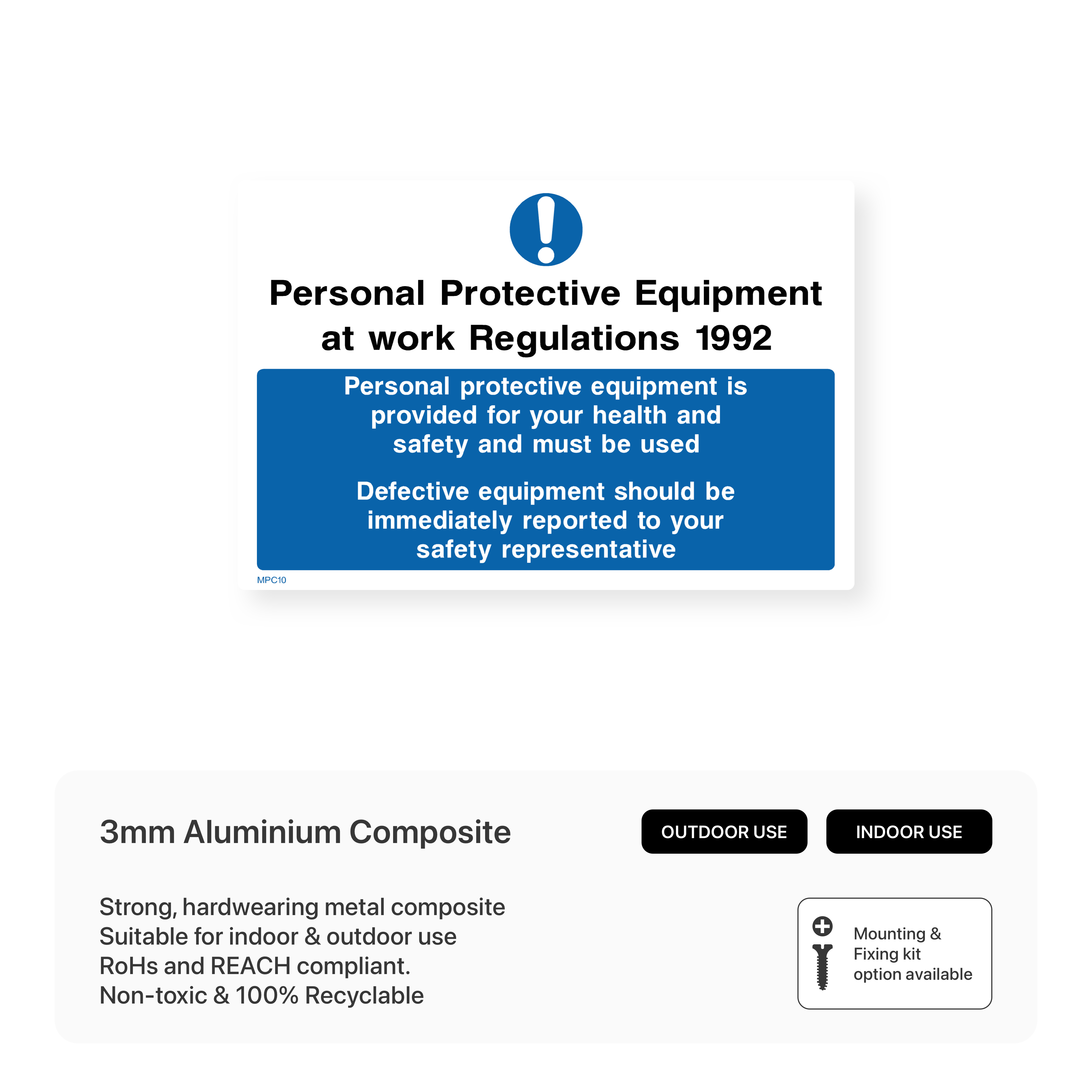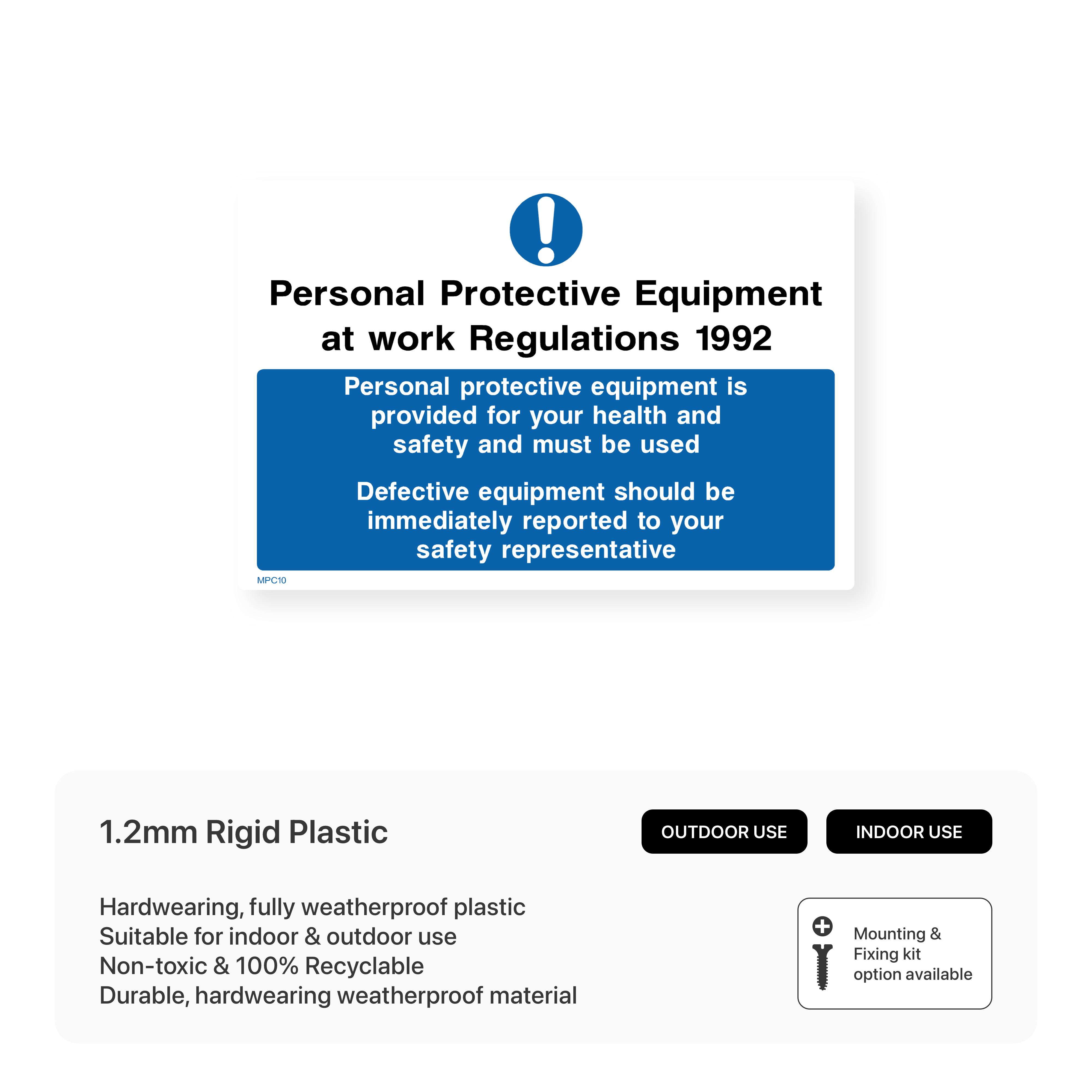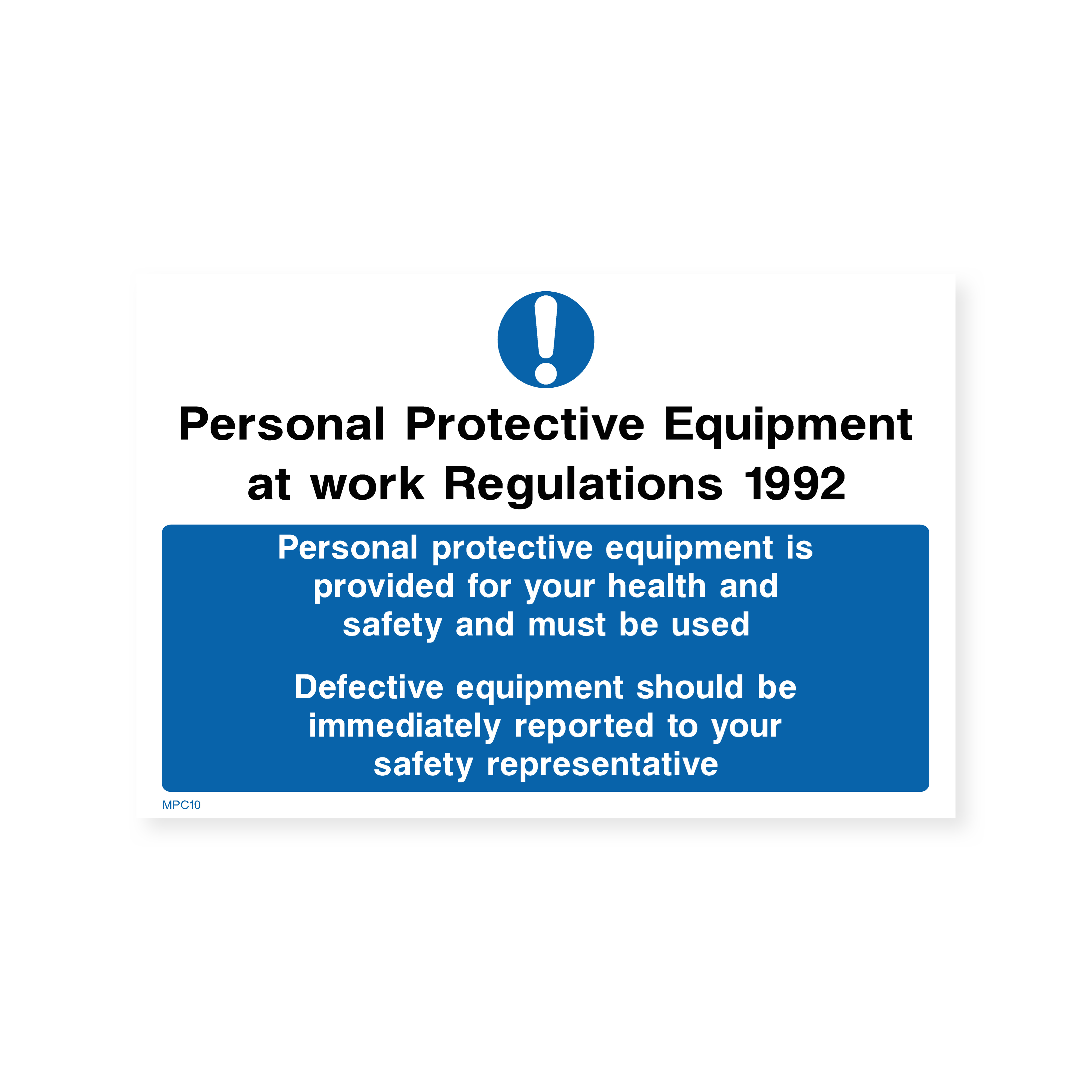 Raise awareness of the Personal Protective Equipment at Work Regulations 1992 with our informative safety sign. This sign clearly outlines the legal requirements for using PPE in the workplace, promoting a safe and compliant environment for all employees.