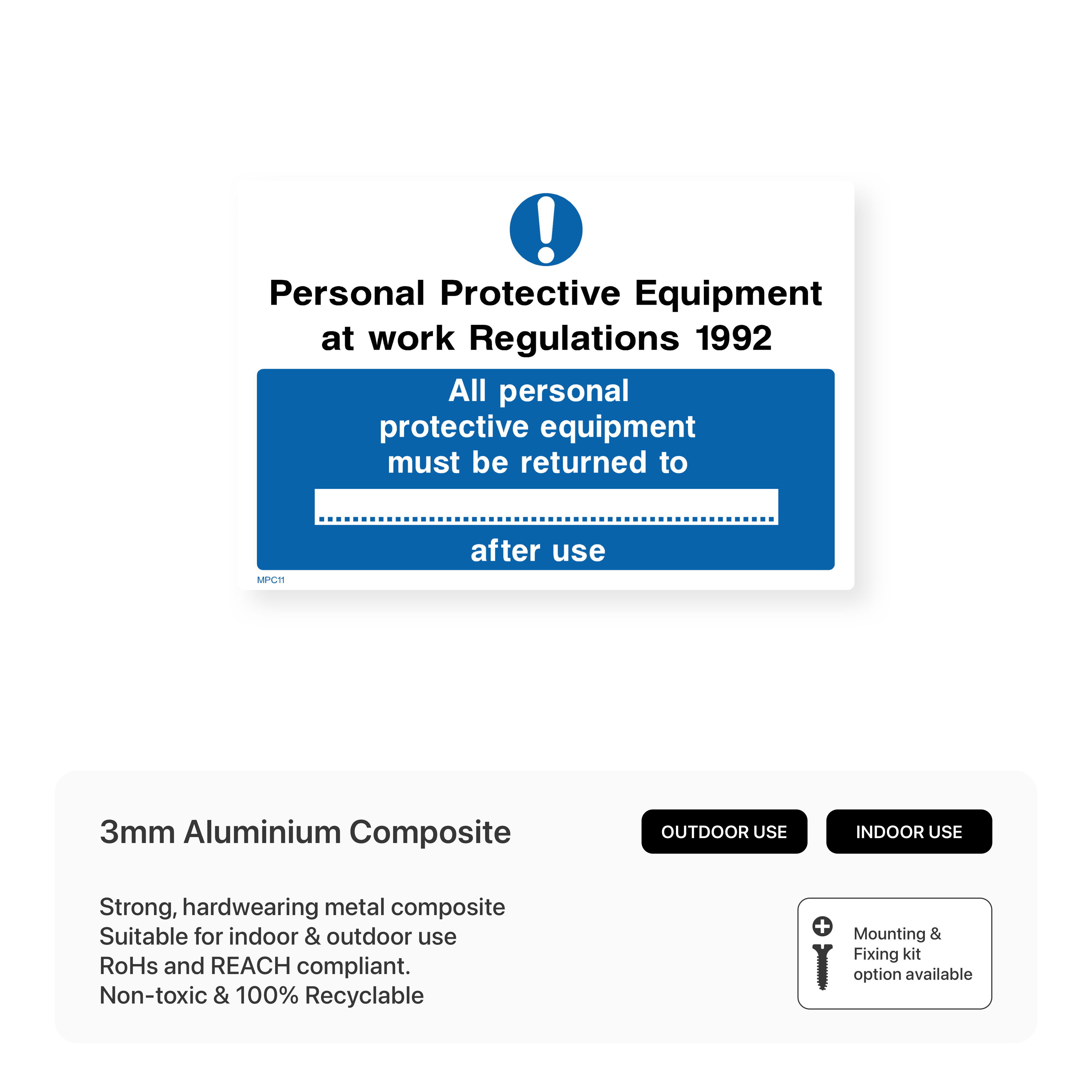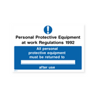 Ensure the proper handling and storage of personal protective equipment (PPE) with our clear and concise safety sign. This sign reinforces the requirement to return all used PPE to the designated location, ensuring a hygienic and organized workplace. Choose from various sizes and materials to suit your specific needs.