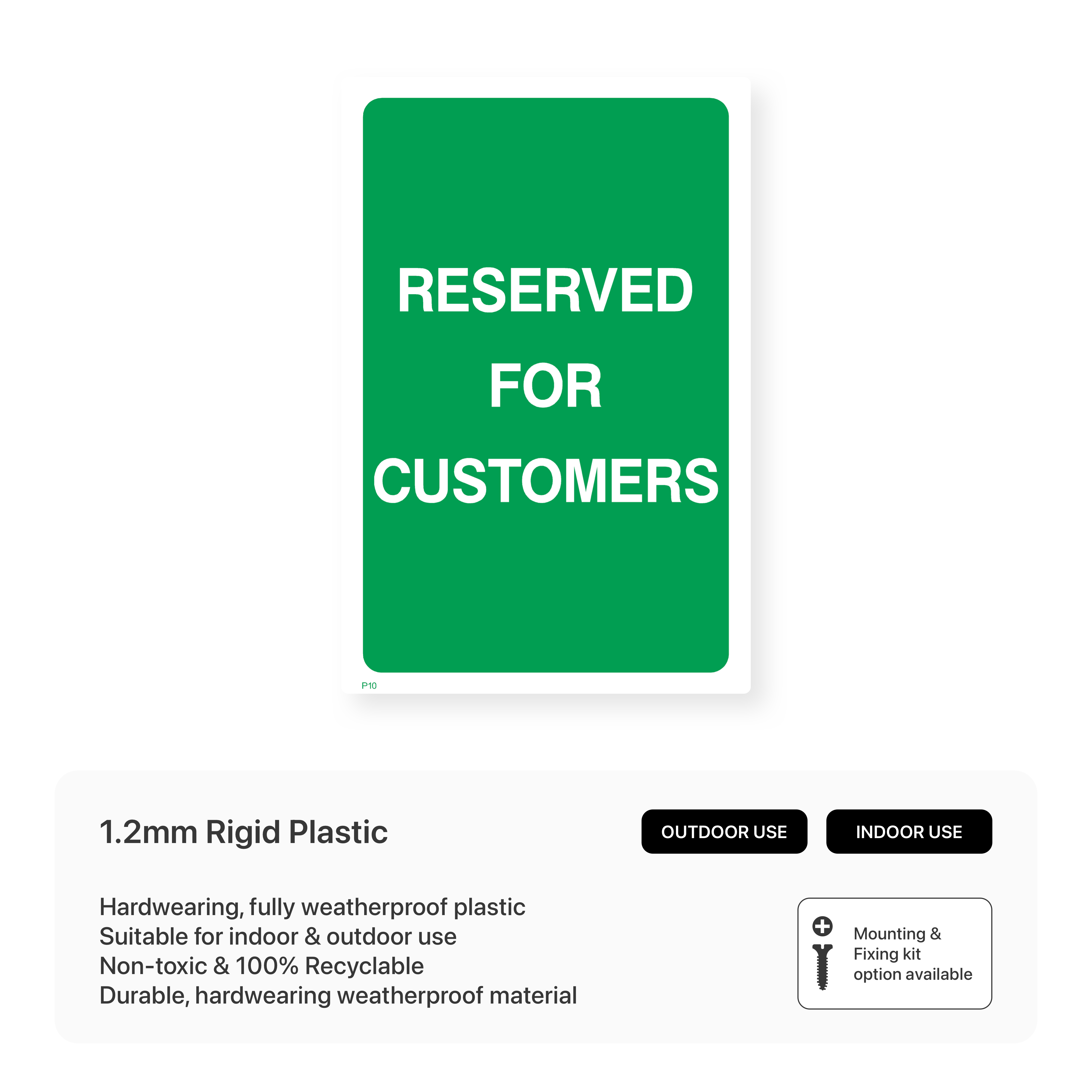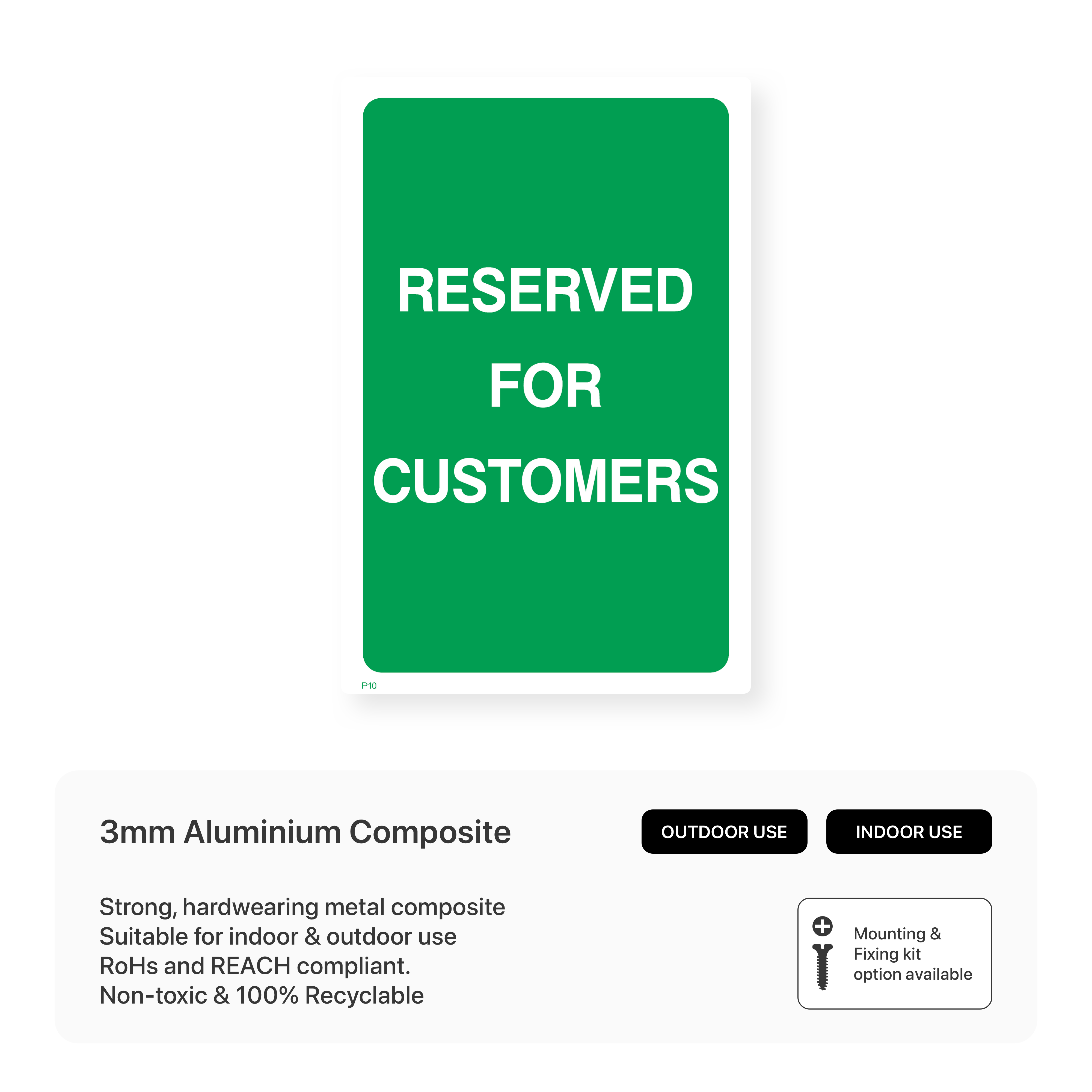 Clearly designate parking spaces for your valued customers with our "Reserved For Customers" sign. This sign helps ensure parking availability for your clientele, enhancing their experience and promoting customer loyalty. Choose from various sizes and materials to suit your specific needs and maintain a customer-friendly parking environment.