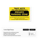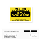 Protect your private parking spaces with our "Take Note - You are parked in a - Private Parking Zone..." sign. This sign warns drivers parked without authorisation that their vehicle registration has been recorded and may be clamped or towed away. It serves as a strong deterrent and helps maintain order in your car park.