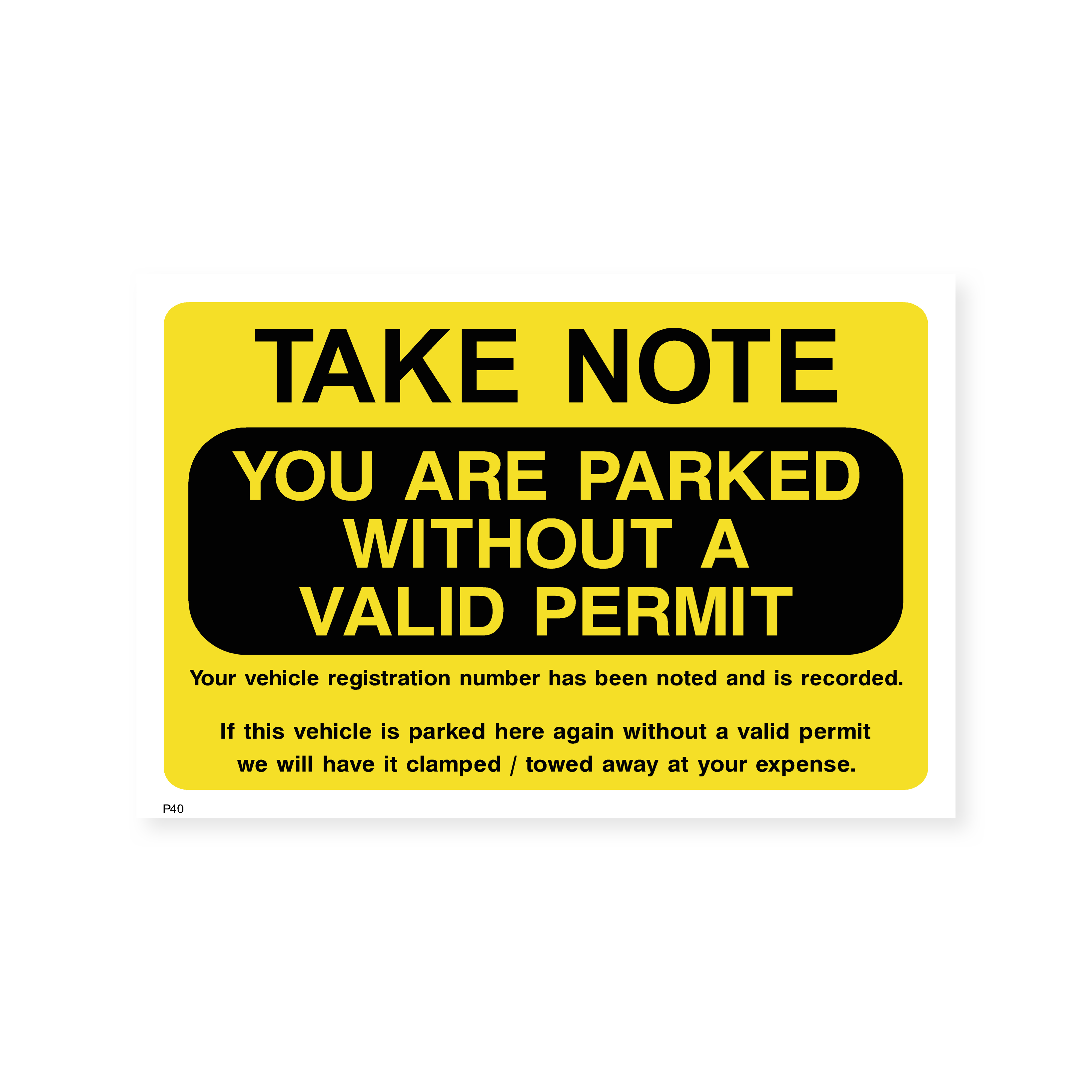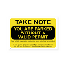 Take Note - You are parked without a valid permit - your vehicle registration number has been noted and is recorded. - If this vehicle is parked here again without a valid permit we will have it clamped / towed away at your expense