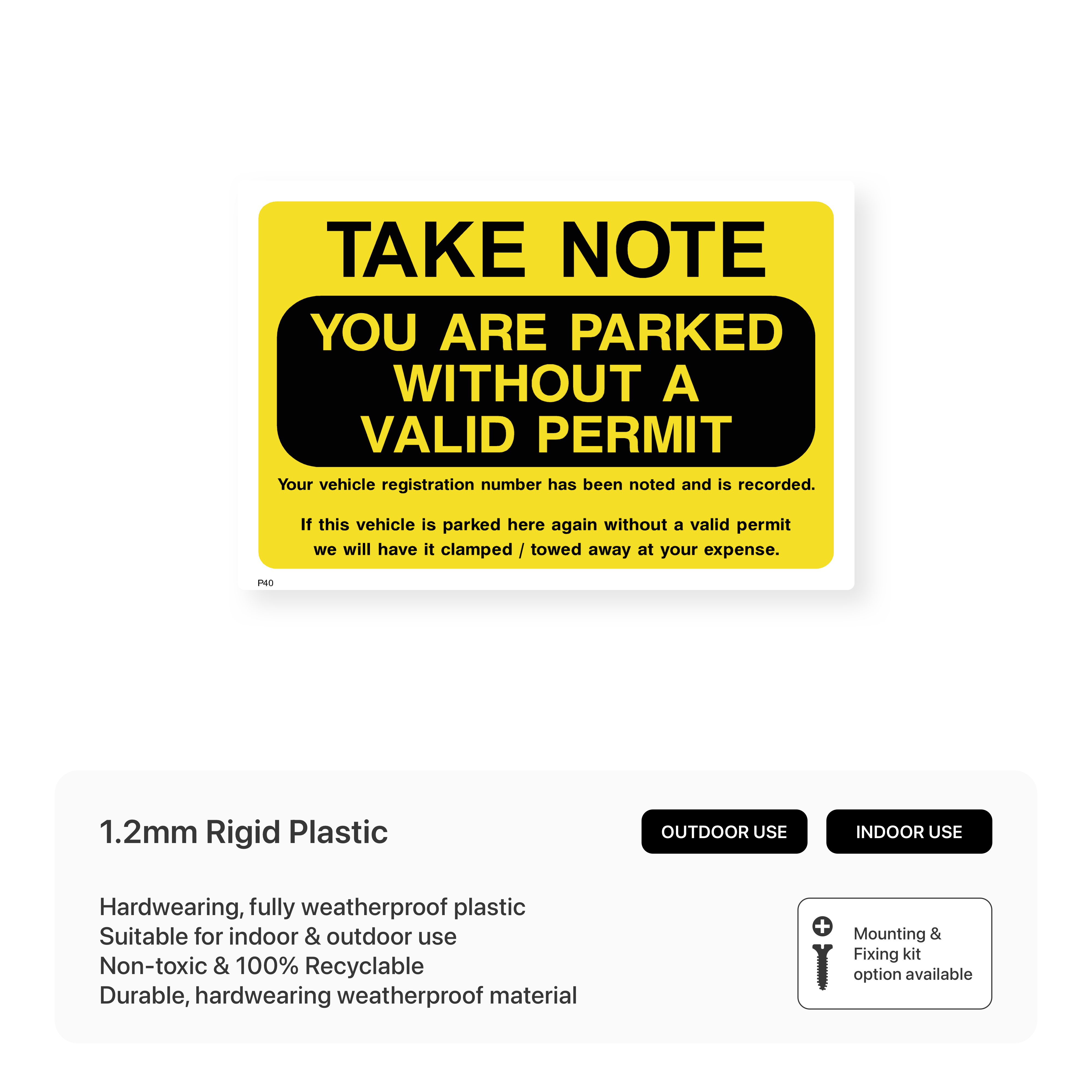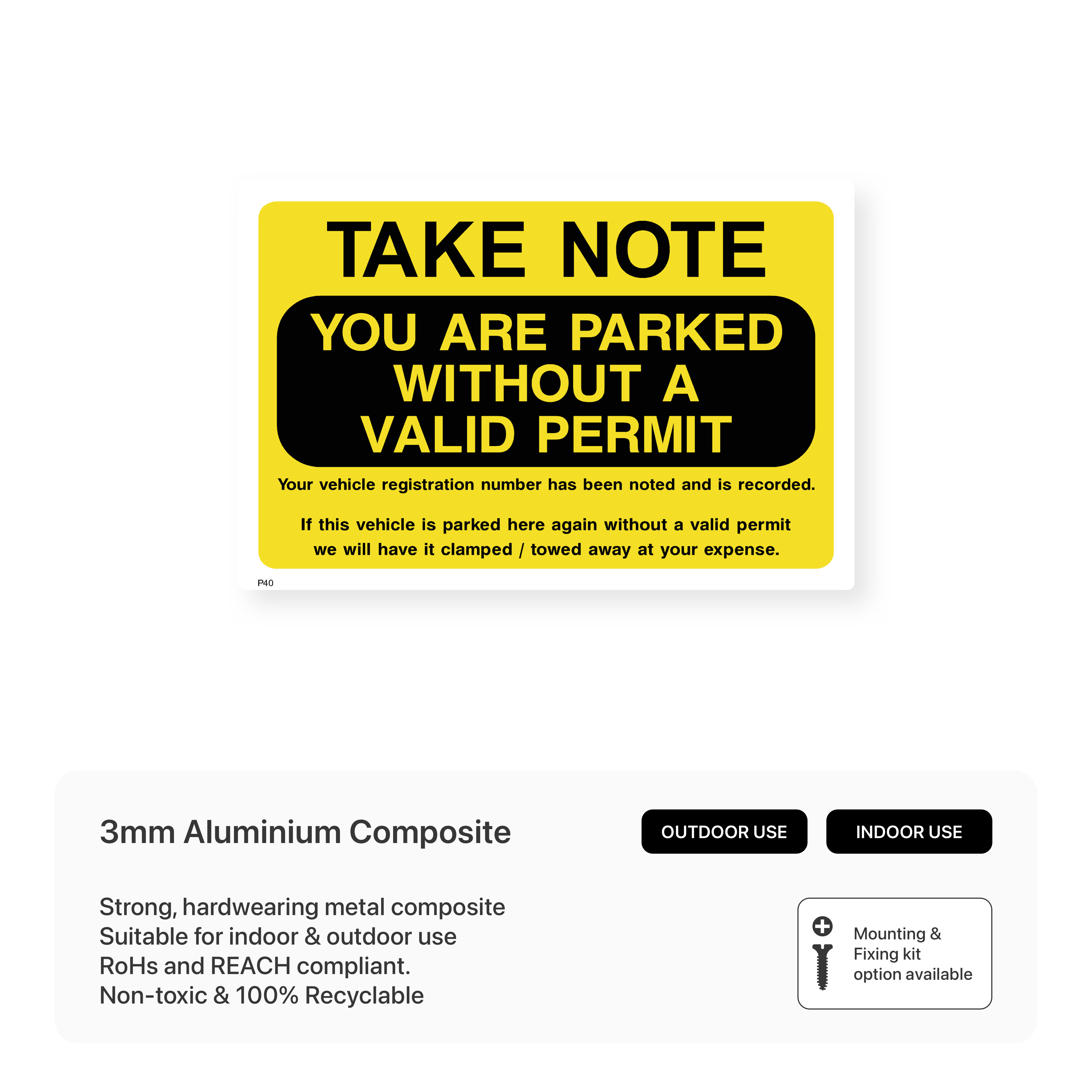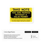 Enforce parking regulations with our "Take Note - You are parked without a valid permit..." sign. This sign warns drivers parked without authorisation that their vehicle registration has been recorded and may be clamped or towed away. It serves as a strong deterrent and helps maintain order in your car park.