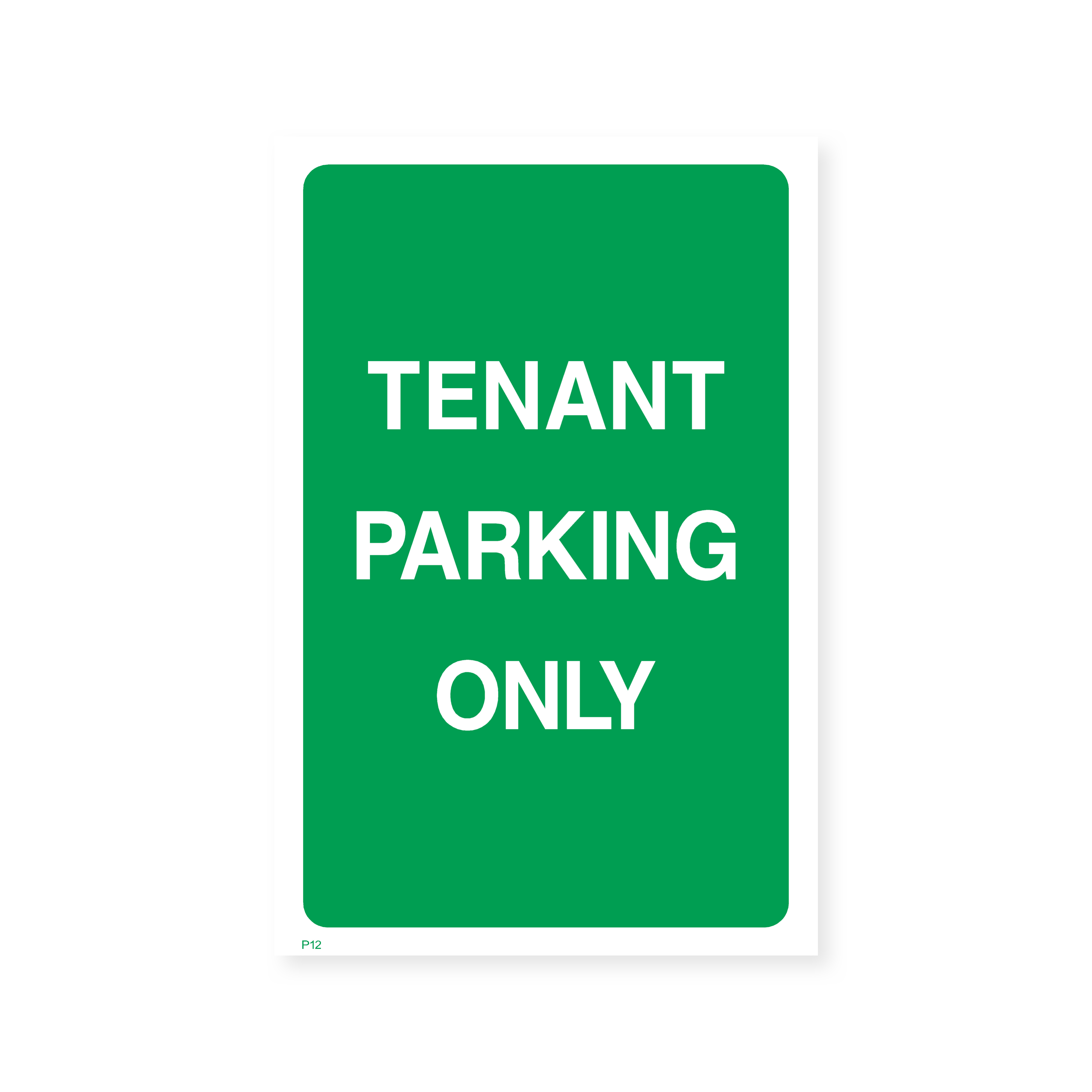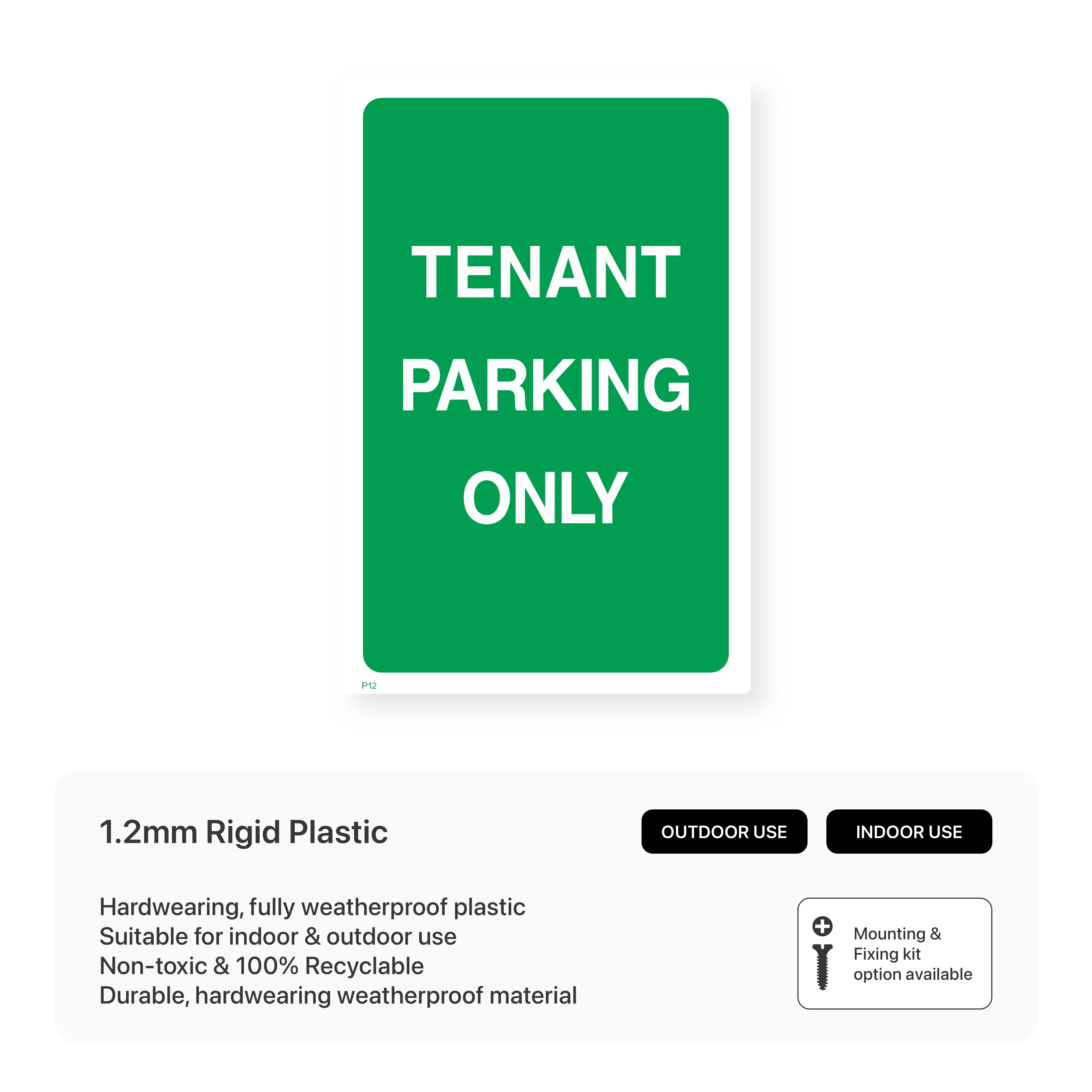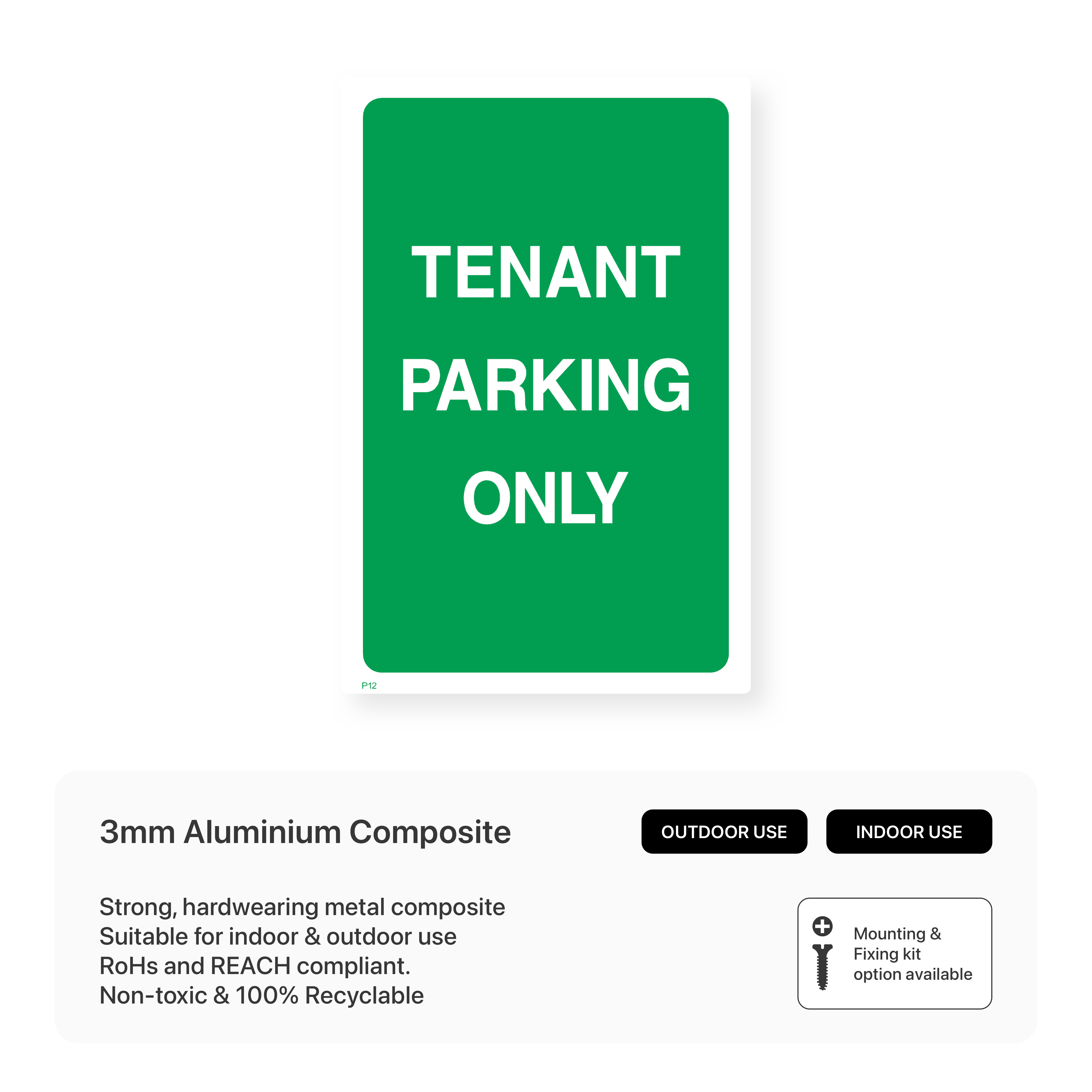 Clearly designate parking spaces for tenants with our "Tenant Parking Only" sign. This sign ensures that parking is reserved for authorised tenants, preventing unauthorised use and maintaining order in your car park. Choose from various sizes and materials to suit your specific needs and create a well-organised parking environment.
