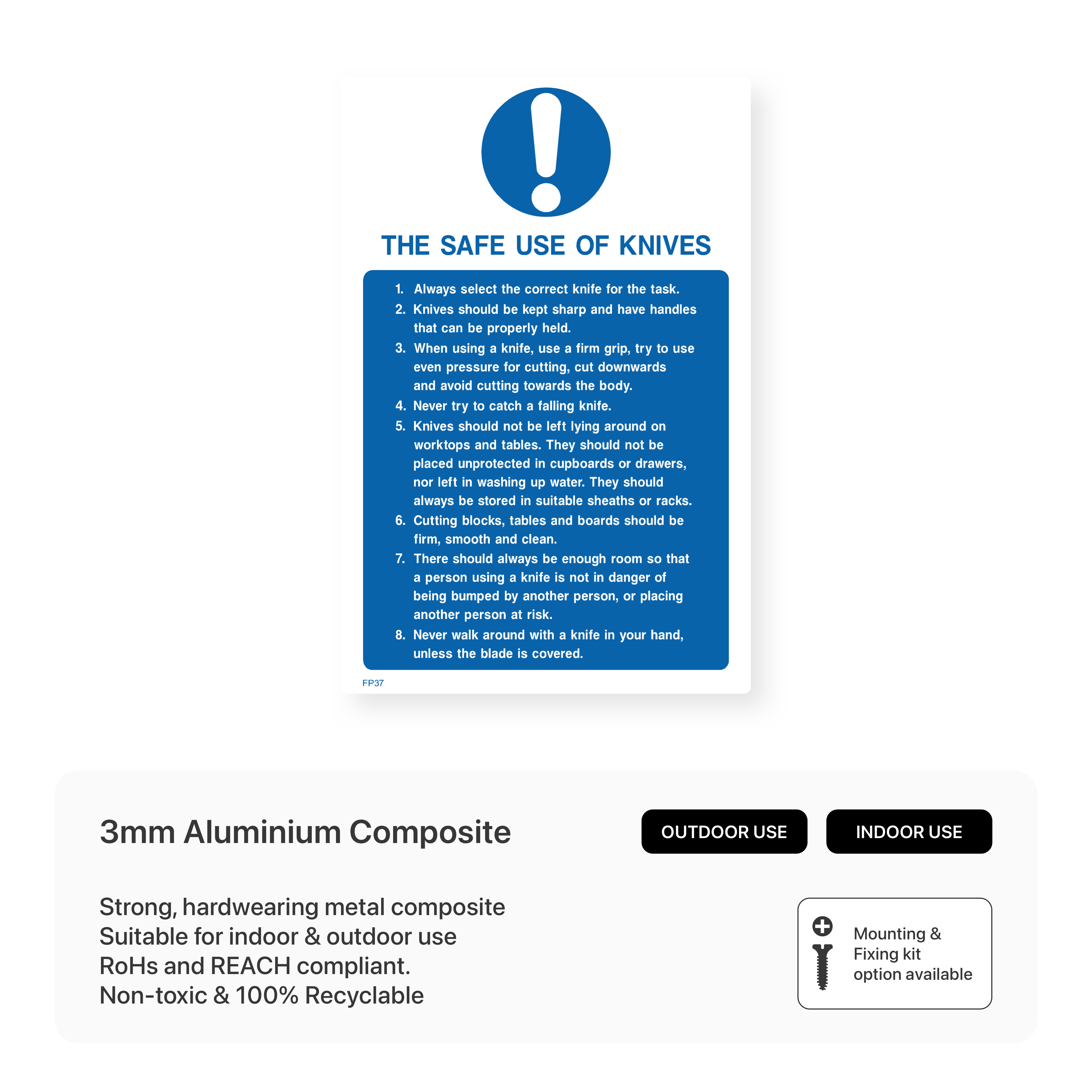 Promote kitchen safety with our "The safe use of knives" sign. This sign reminds employees to always select the appropriate knife for the task at hand, reducing the risk of accidents and injuries.
