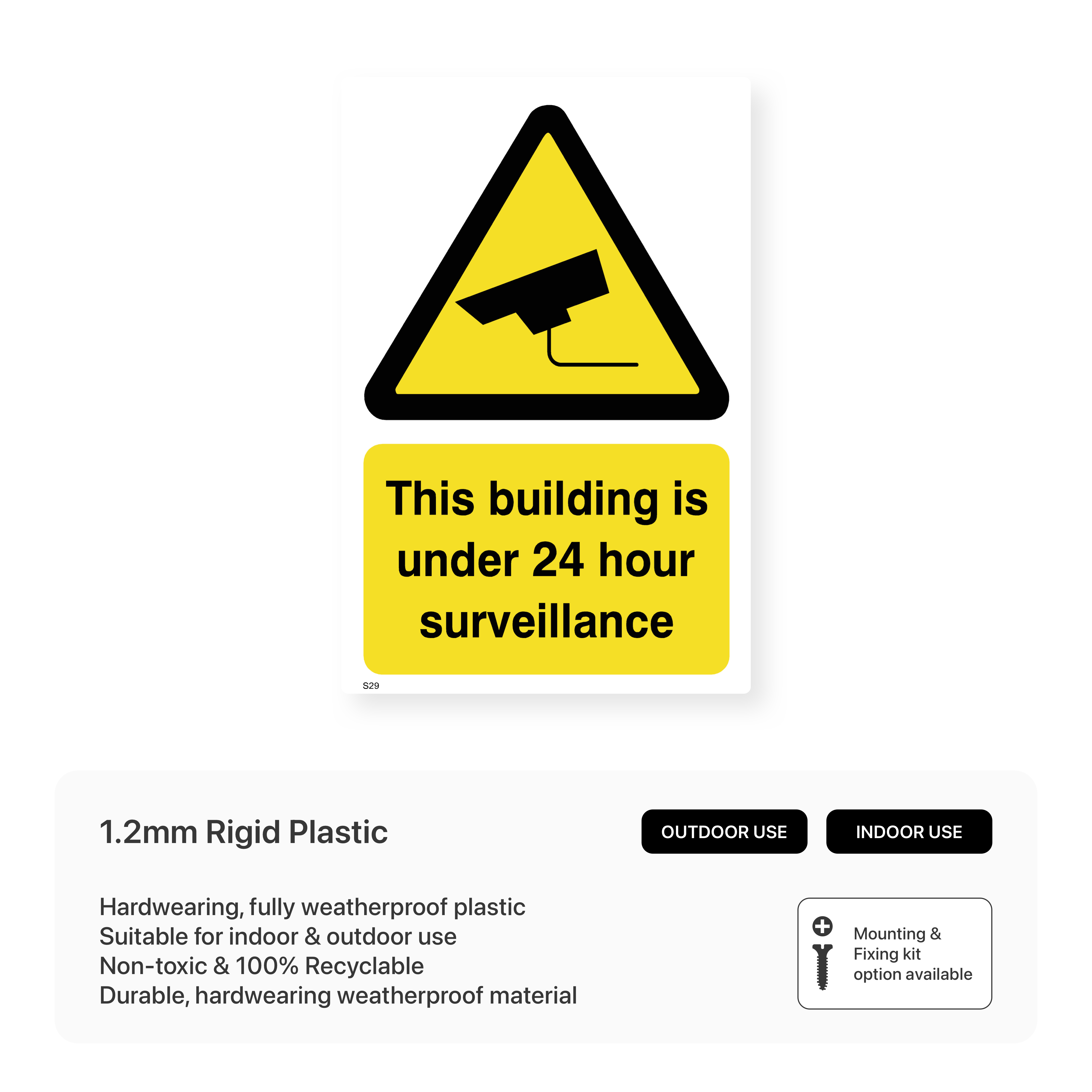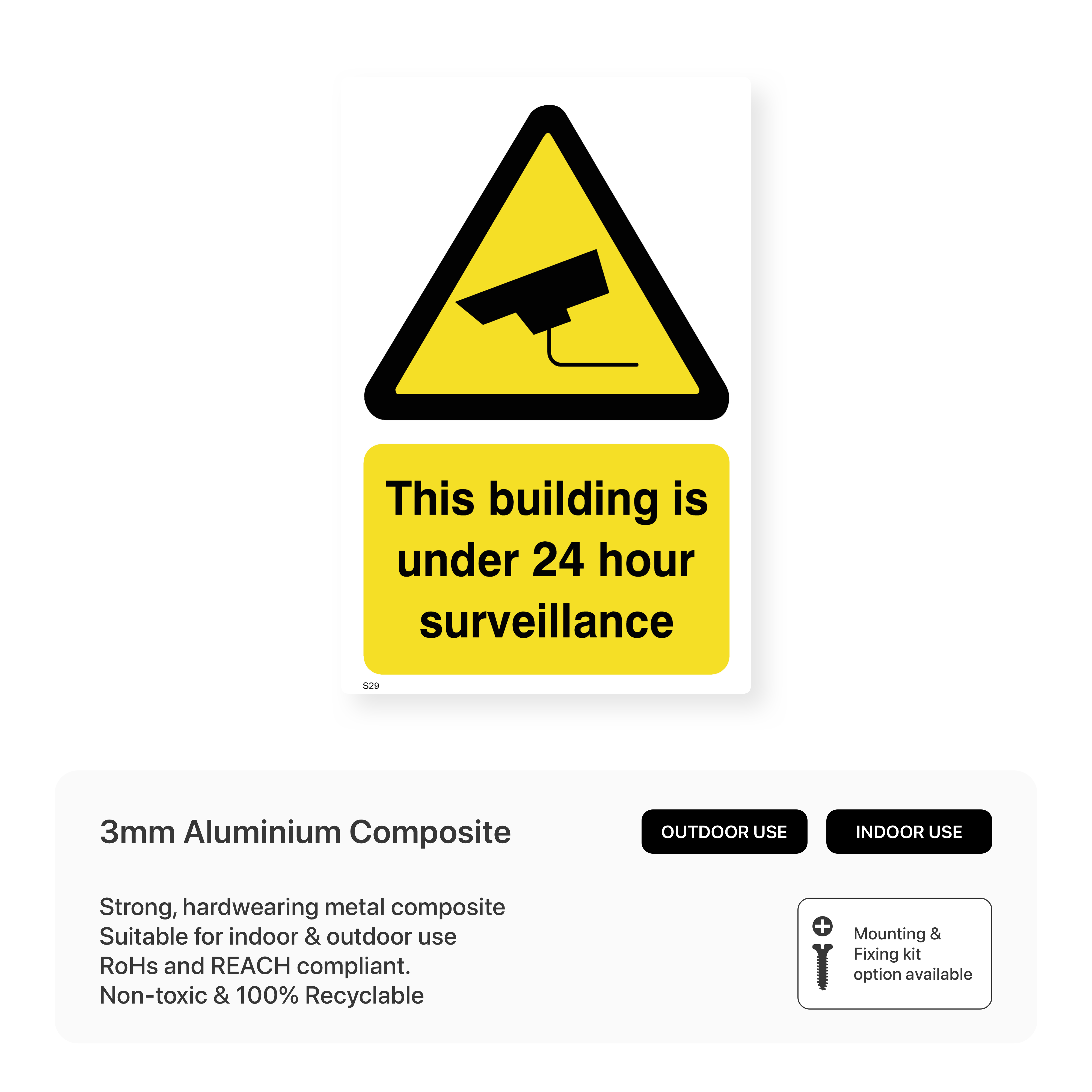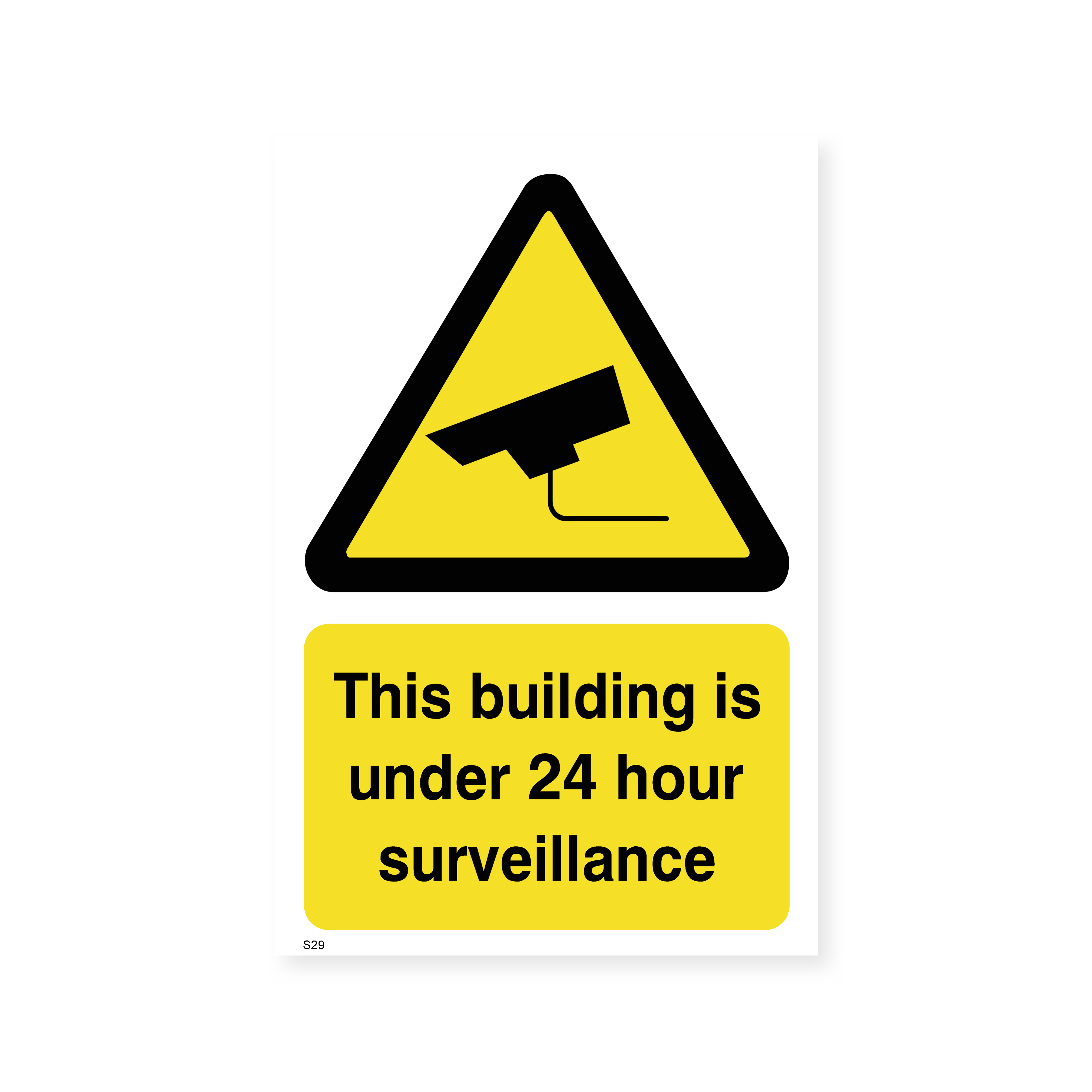 Enhance the security of your building with this clear and concise sign, informing visitors and potential intruders that the premises are under 24-hour surveillance. This versatile sign is suitable for a wide range of buildings and locations.