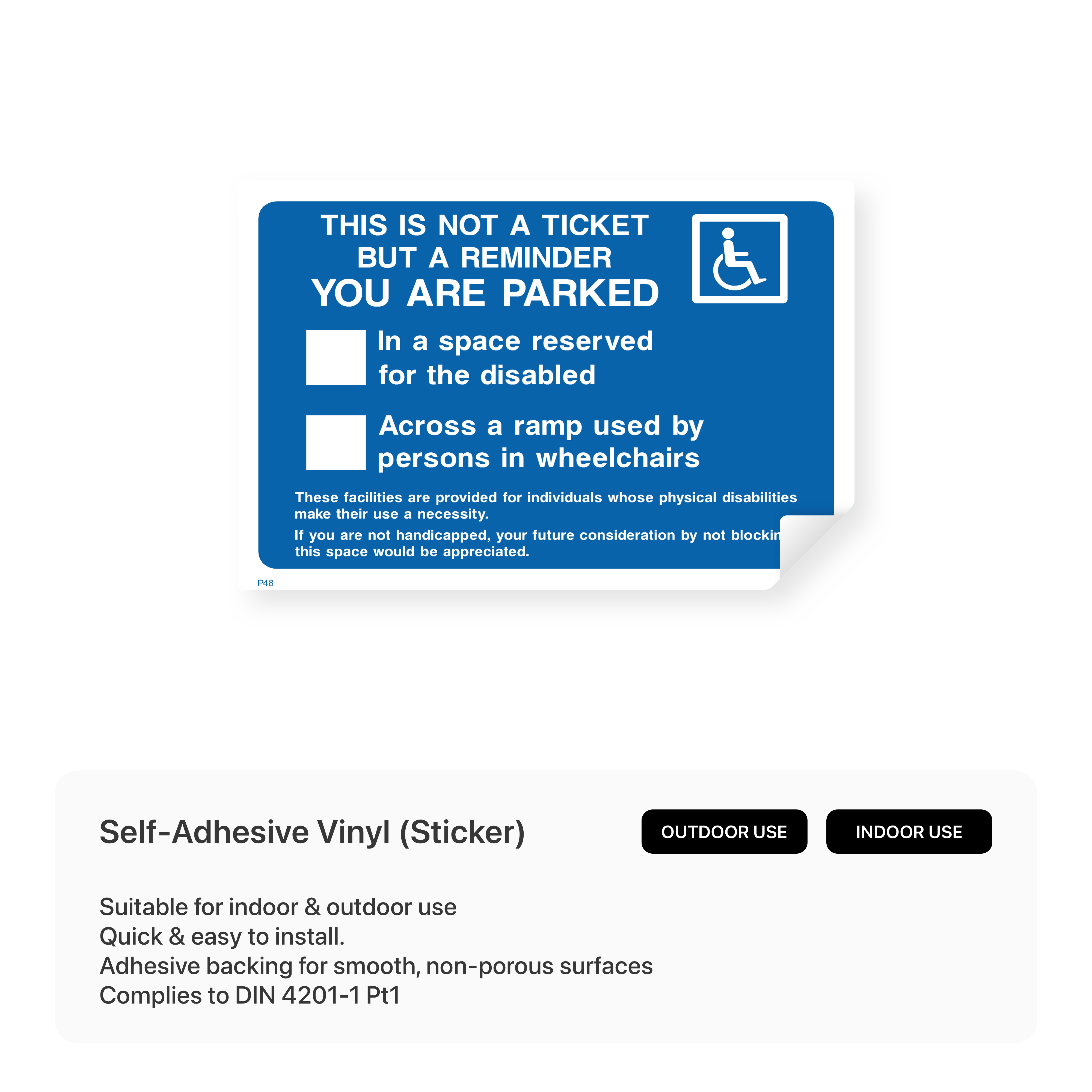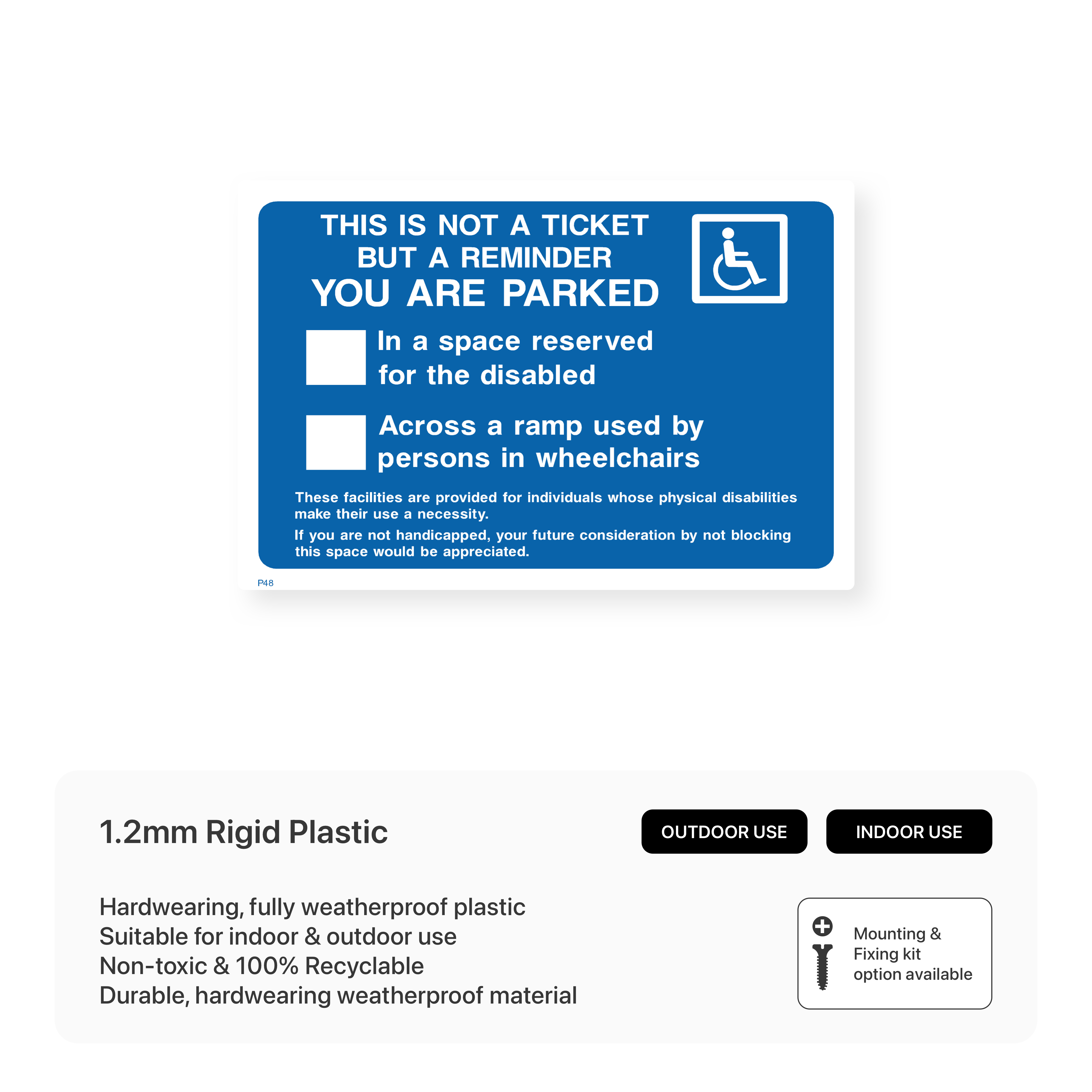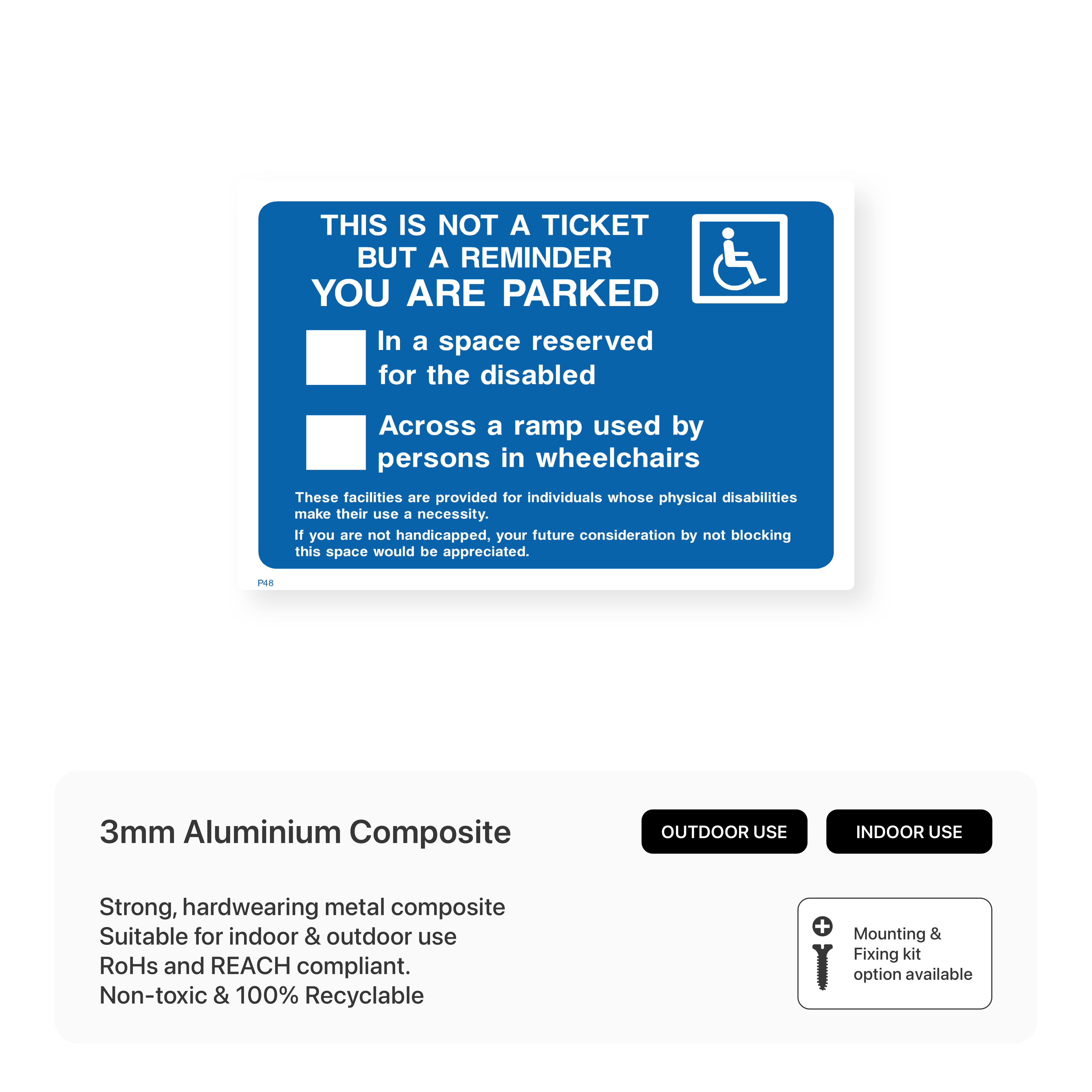 Politely remind drivers to respect disabled parking spaces with our "THIS IS NOT A TICKET BUT A REMINDER - YOU ARE PARKED - In a space reserved for the disabled..." sign. This sign encourages considerate parking practices and raises awareness of the importance of accessibility. Choose from various sizes and materials to promote inclusivity in your car park.