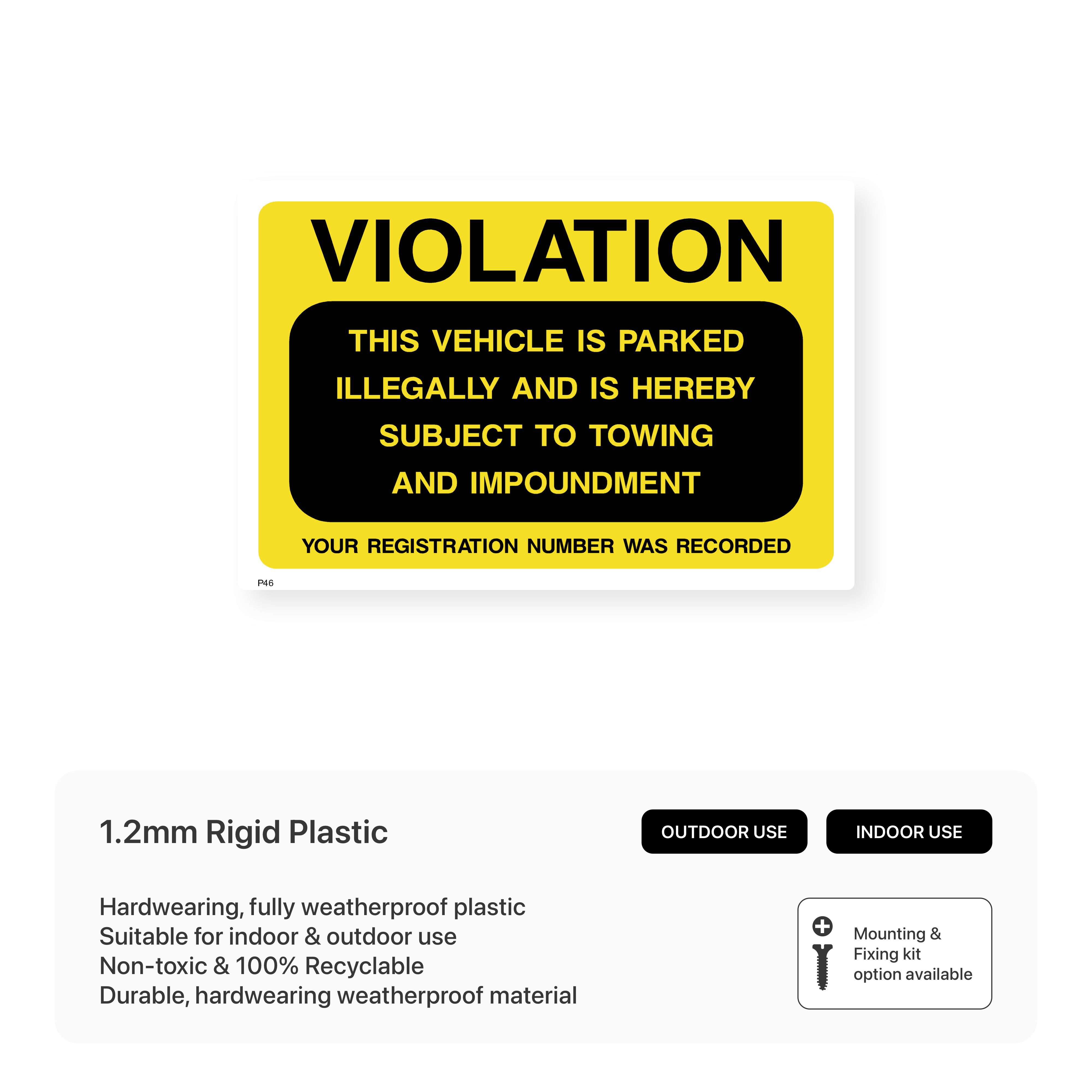 Deter illegal parking with our "VIOLATION - THIS VEHICLE IS PARKED ILLEGALLY..." sign. This sign clearly communicates the serious consequences of illegal parking, including towing and impoundment. It serves as a strong deterrent and helps maintain order in your car park.