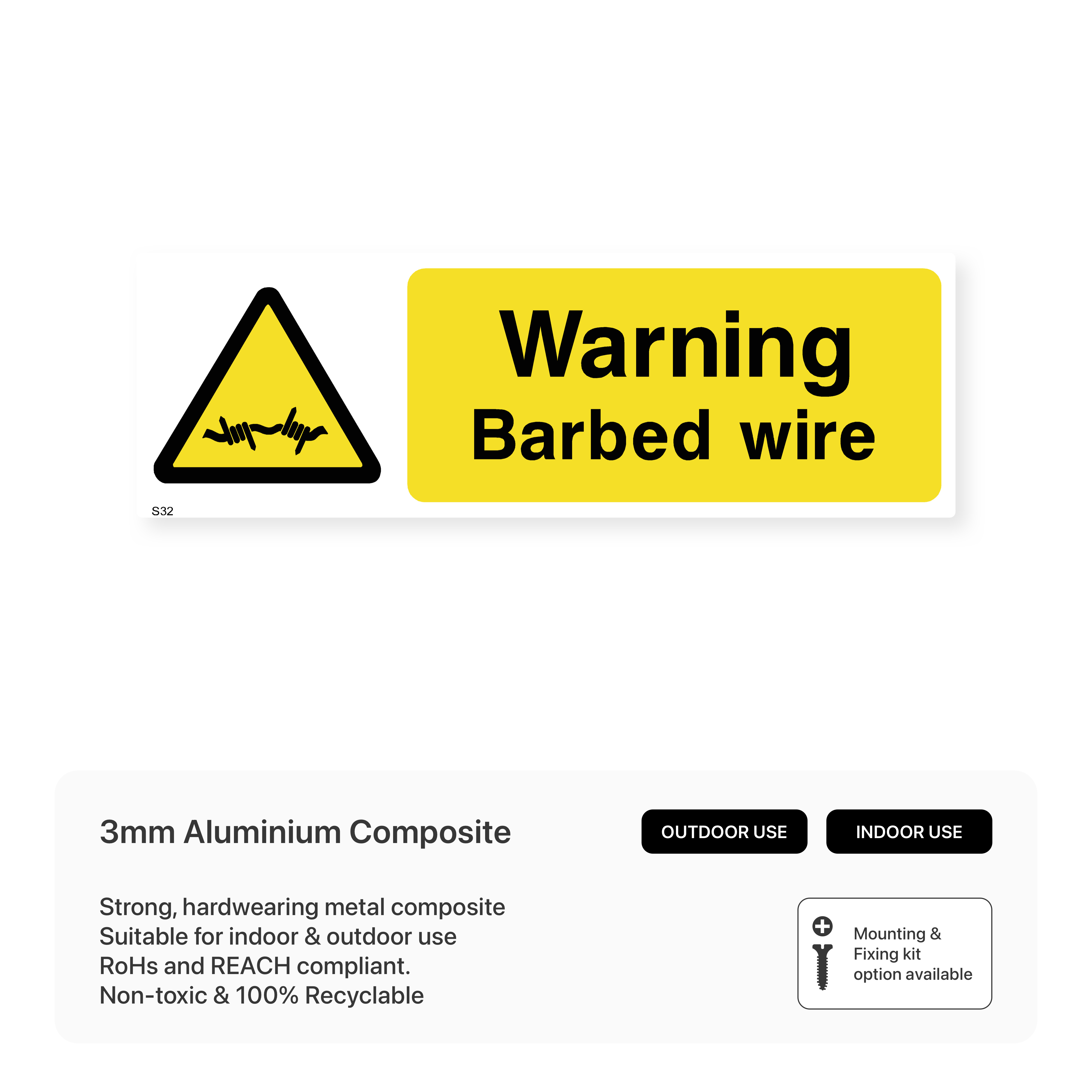 This sign warns of the presence of barbed wire, helping to prevent accidents and deter unauthorised access. Choose from a variety of sizes and materials to suit your specific needs.
