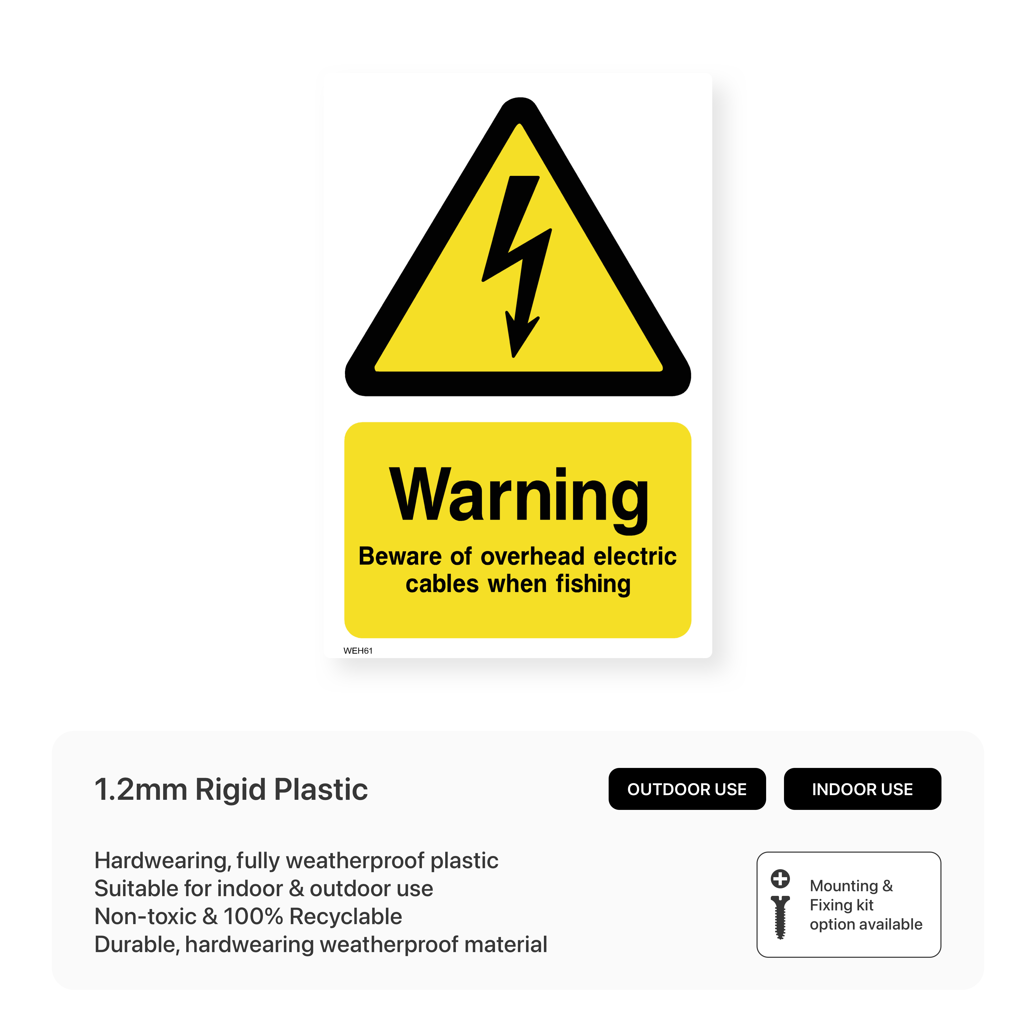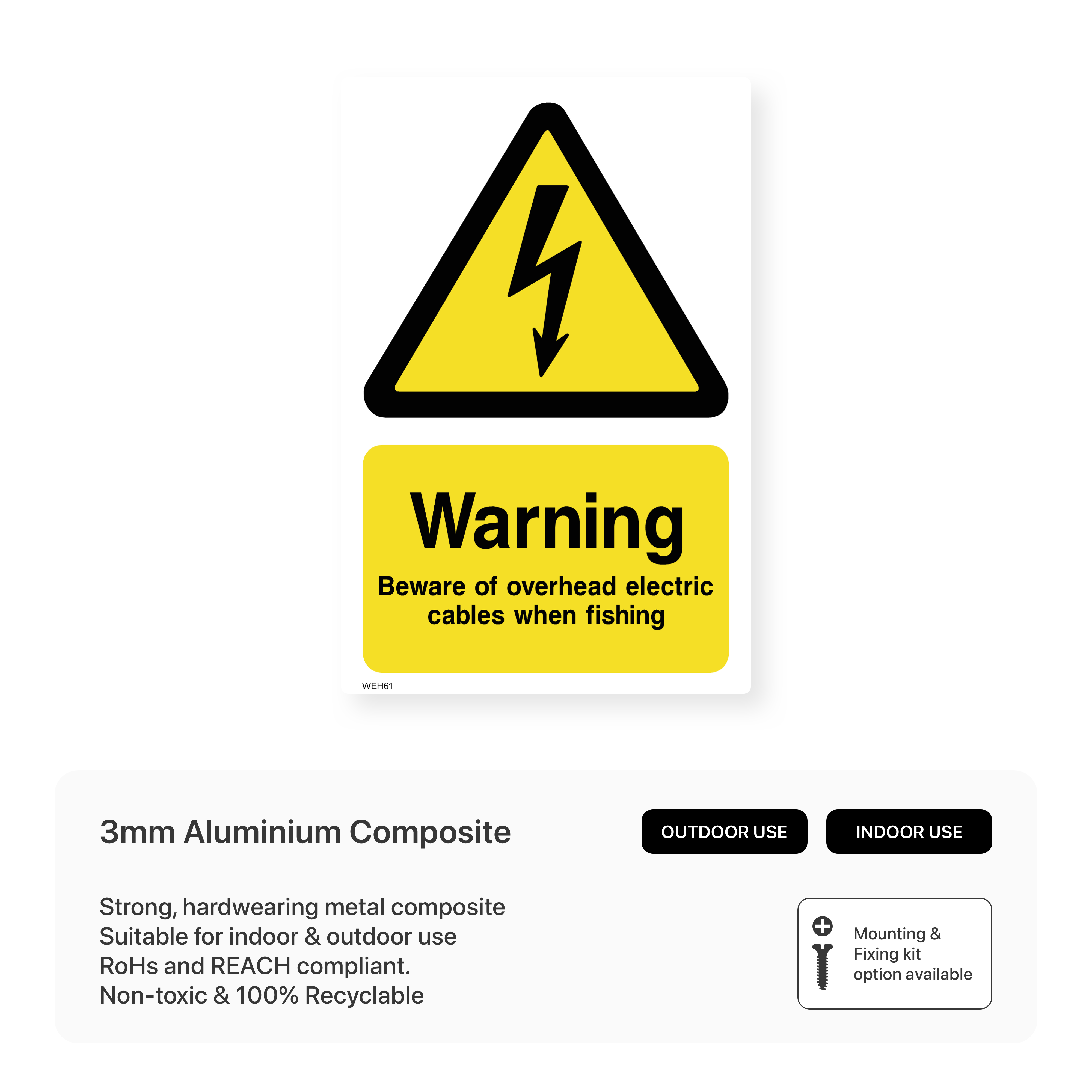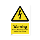 This portrait-oriented sign warns anglers of the dangers of overhead electric cables. It helps to prevent accidents and injuries while fishing near power lines.