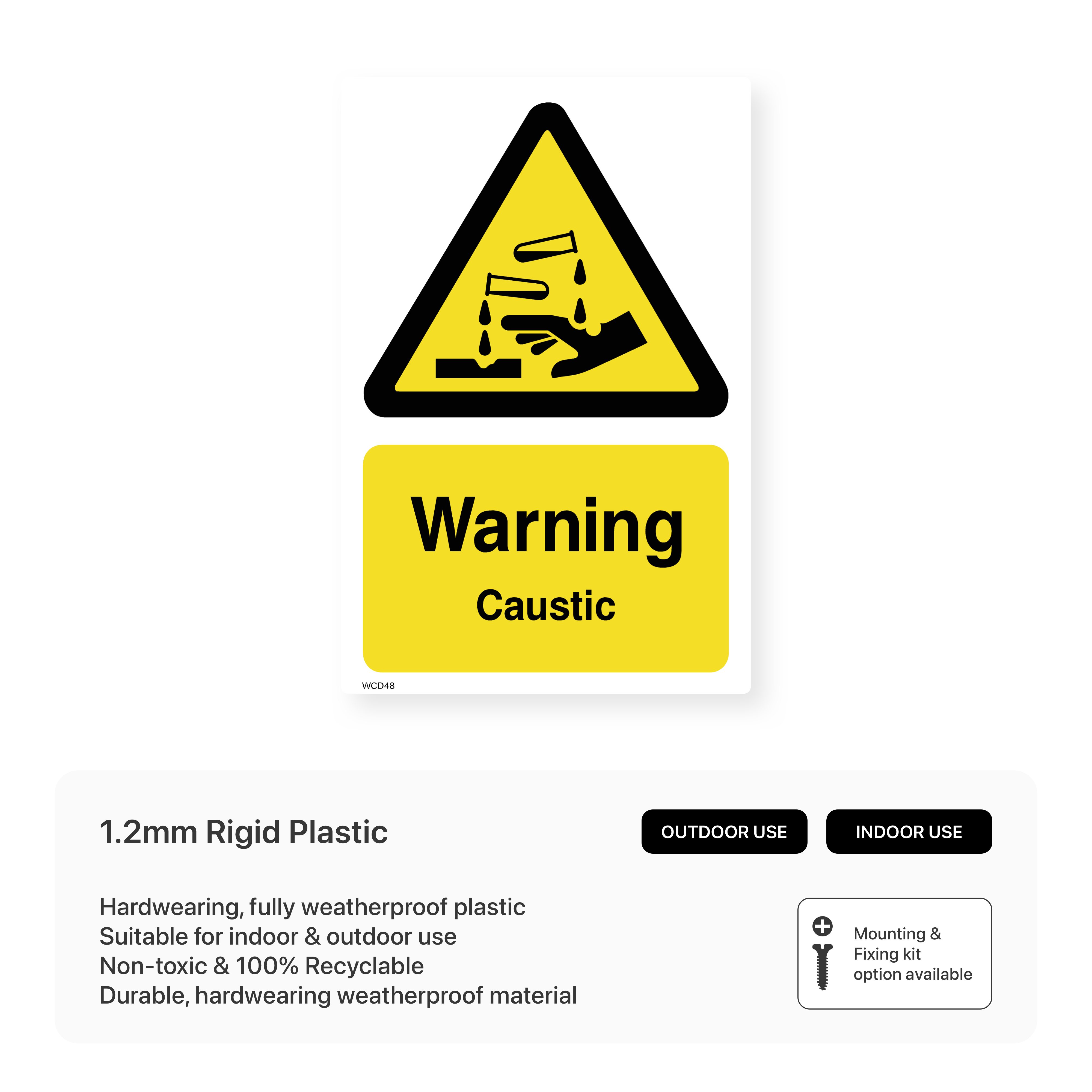 Alert employees and visitors to the presence of caustic substances with this clear warning sign. This portrait-oriented sign helps to prevent accidental exposure and encourages the use of appropriate protective equipment.