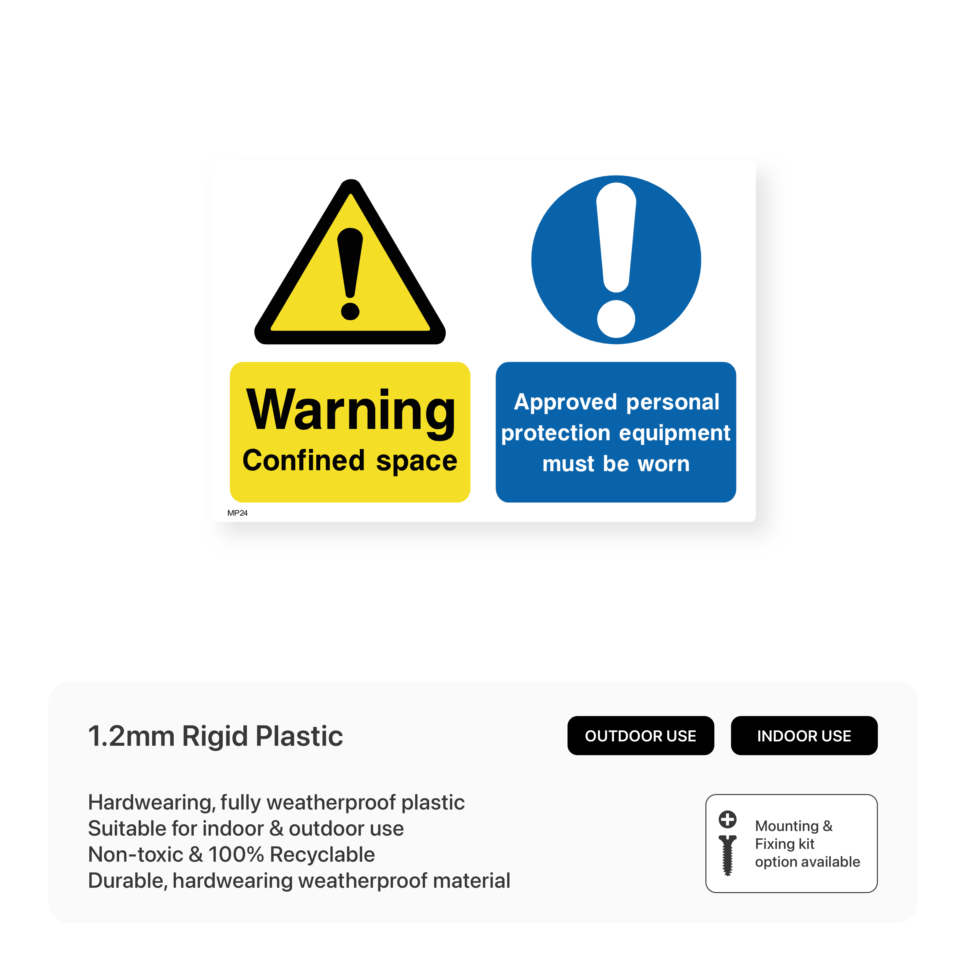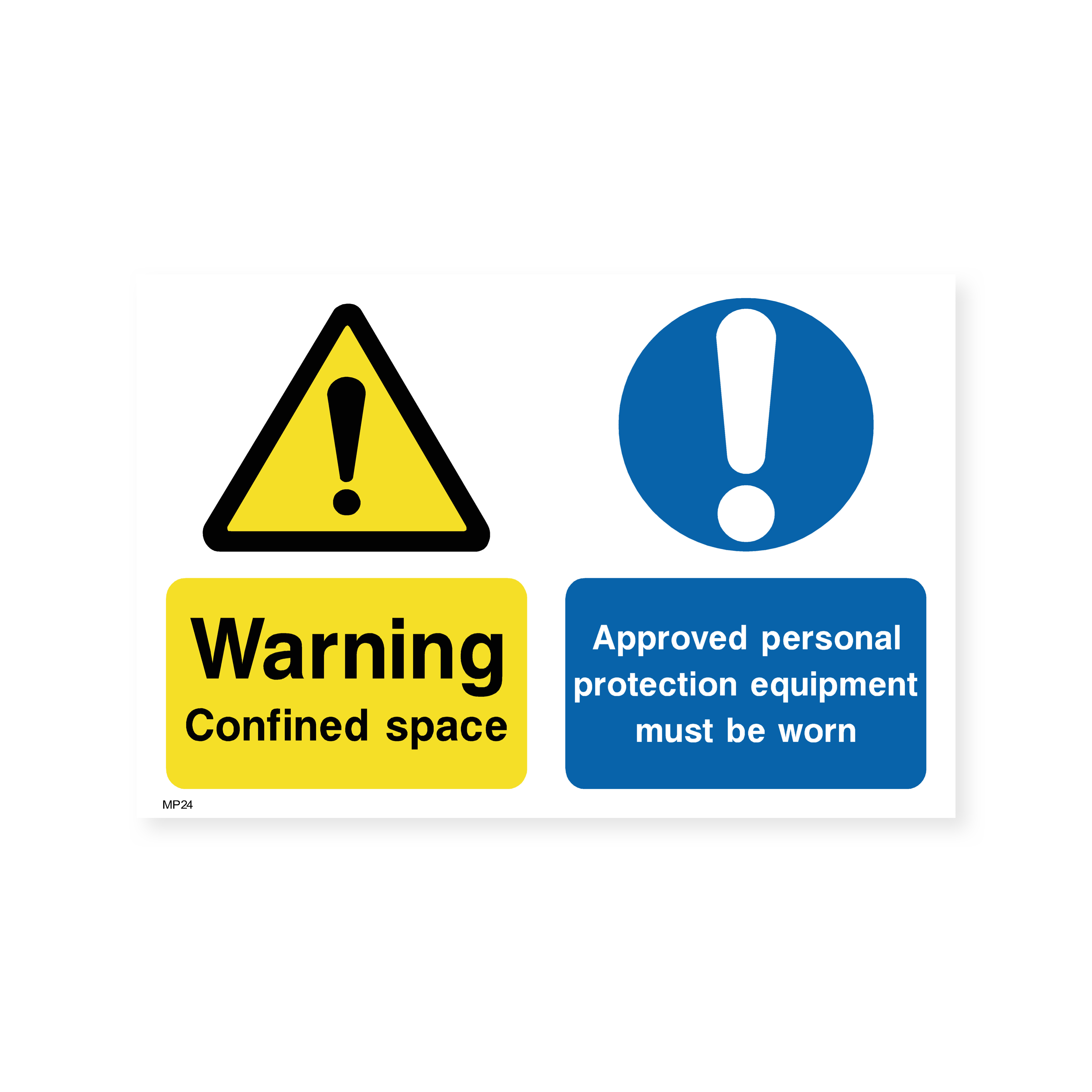 Ensure safety in confined spaces with this clear and durable warning sign. It reminds personnel of the mandatory use of approved personal protection equipment (PPE). Ideal for industrial settings, construction sites, and any area where confined spaces pose potential hazards.