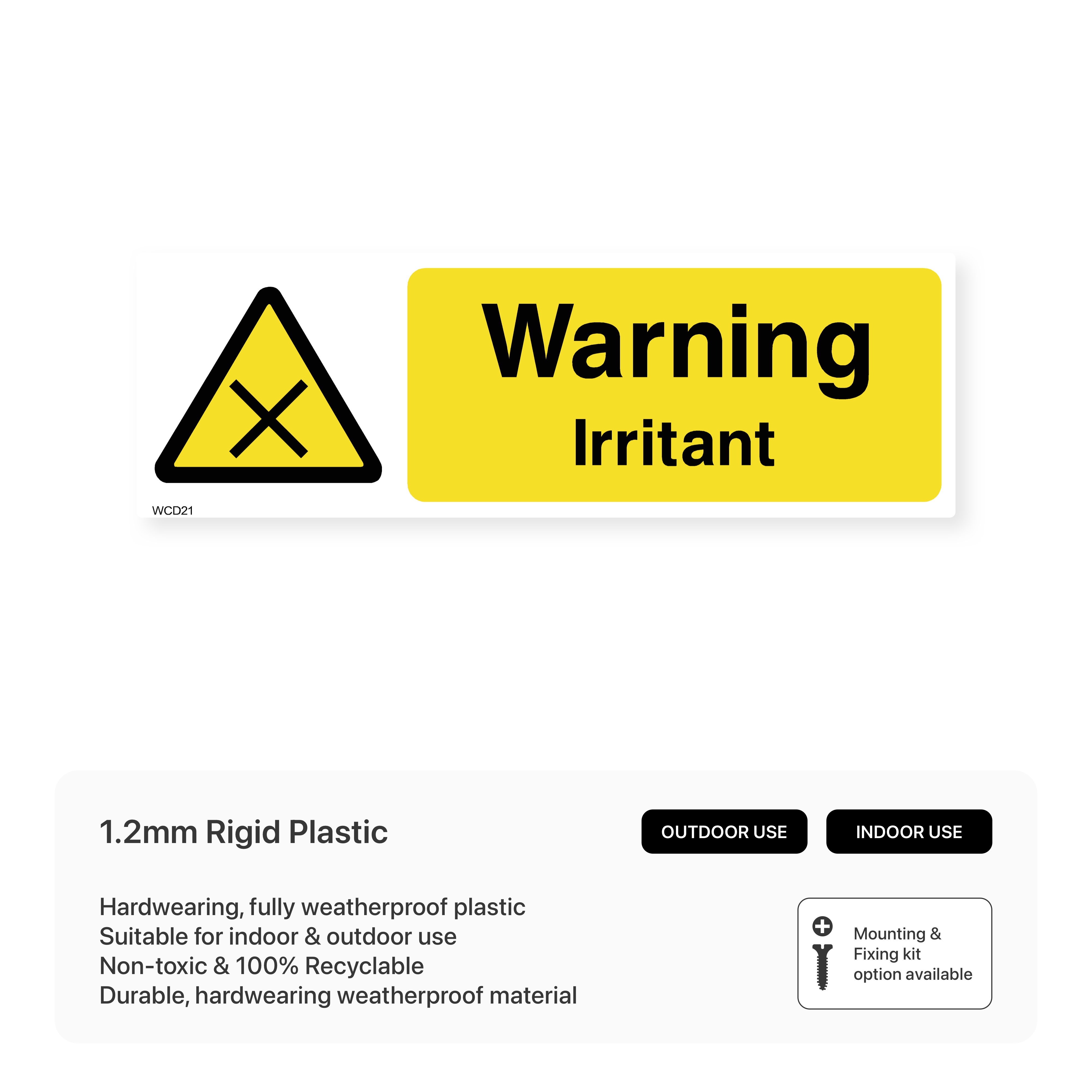 Alert employees and visitors to the presence of irritant substances with this clear warning sign. This sign helps to prevent accidental exposure and encourages the use of appropriate protective equipment.