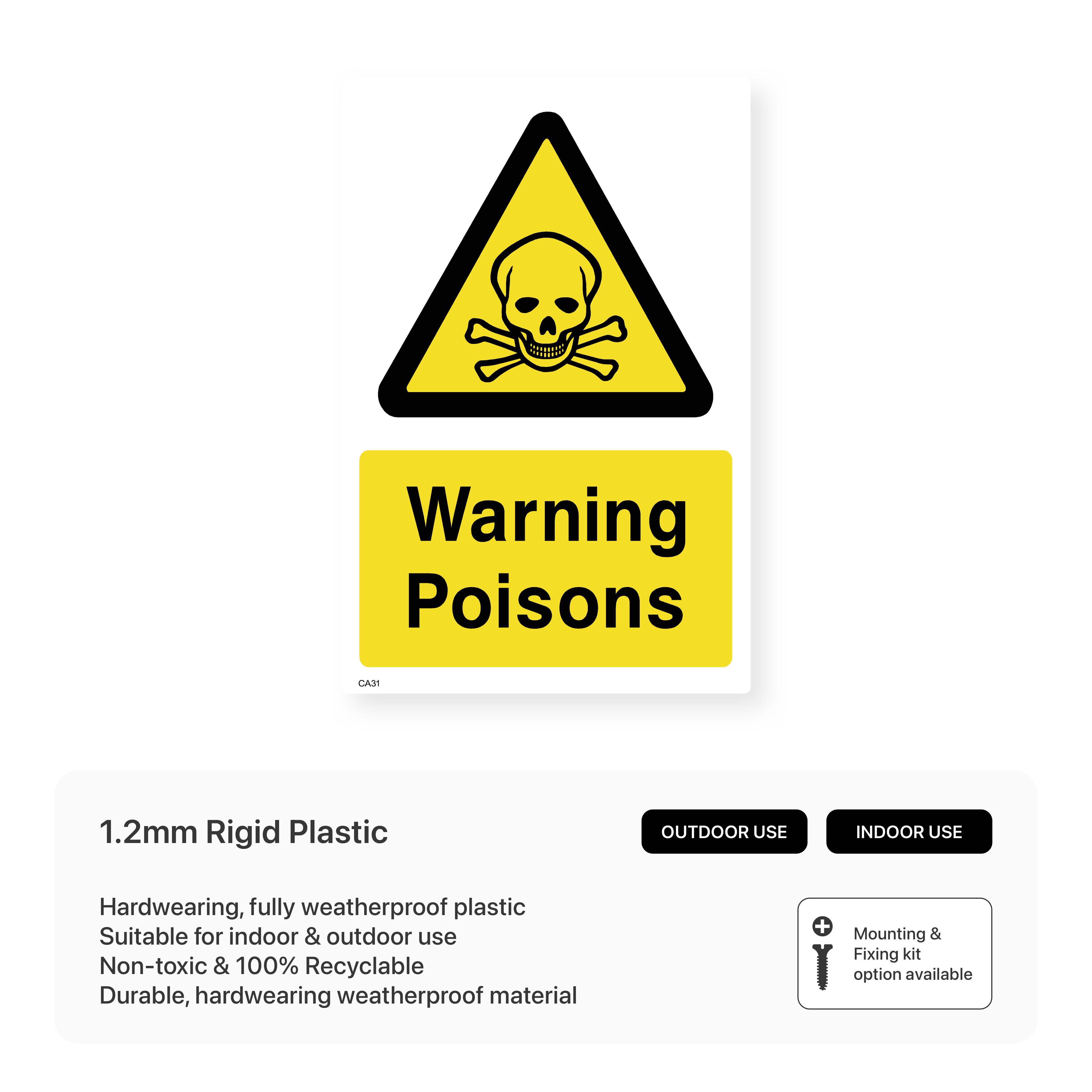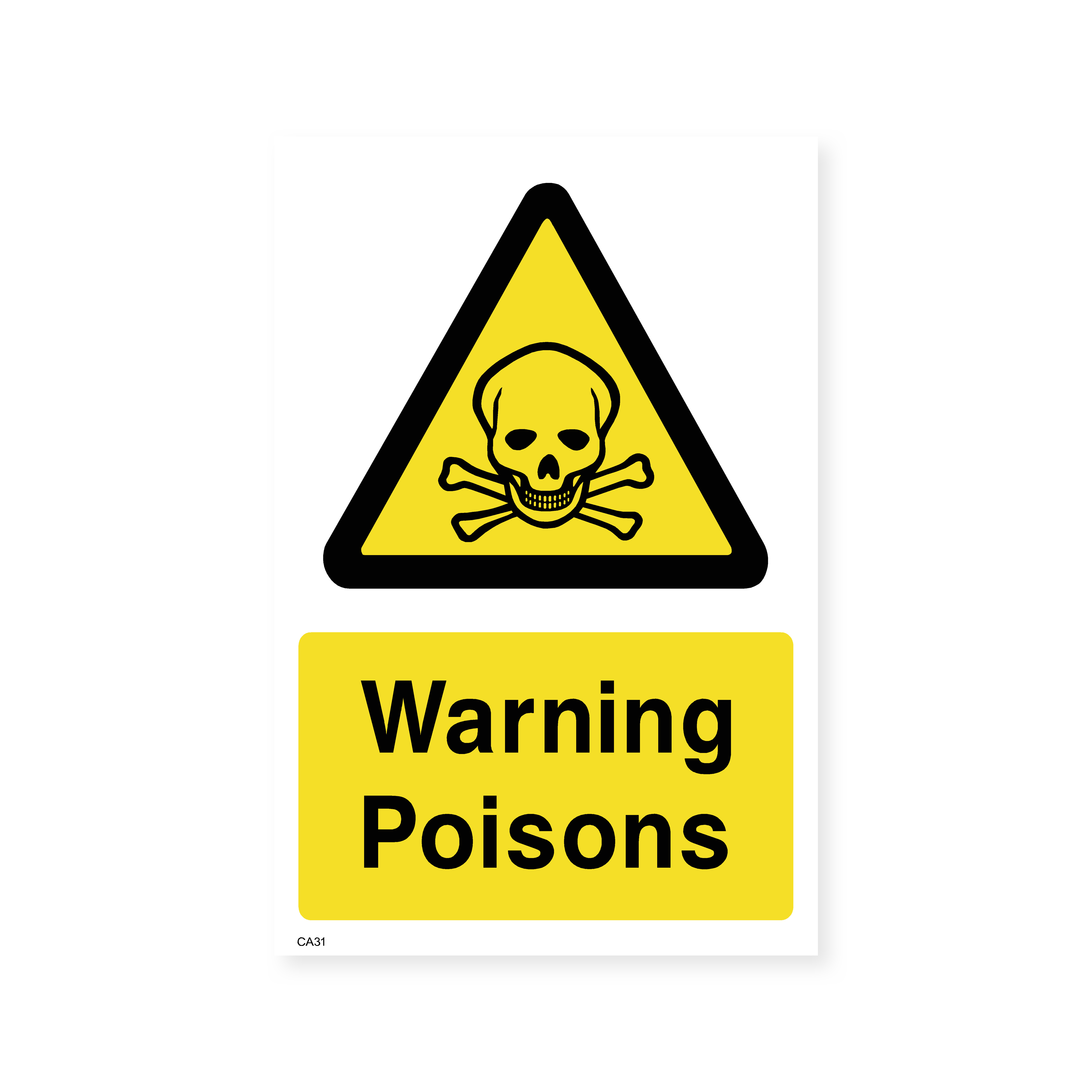 Clearly identify areas where poisons are stored or used. Available in various sizes and materials, these signs help prevent accidental exposure and ensure the safe handling and storage of poisonous substances.