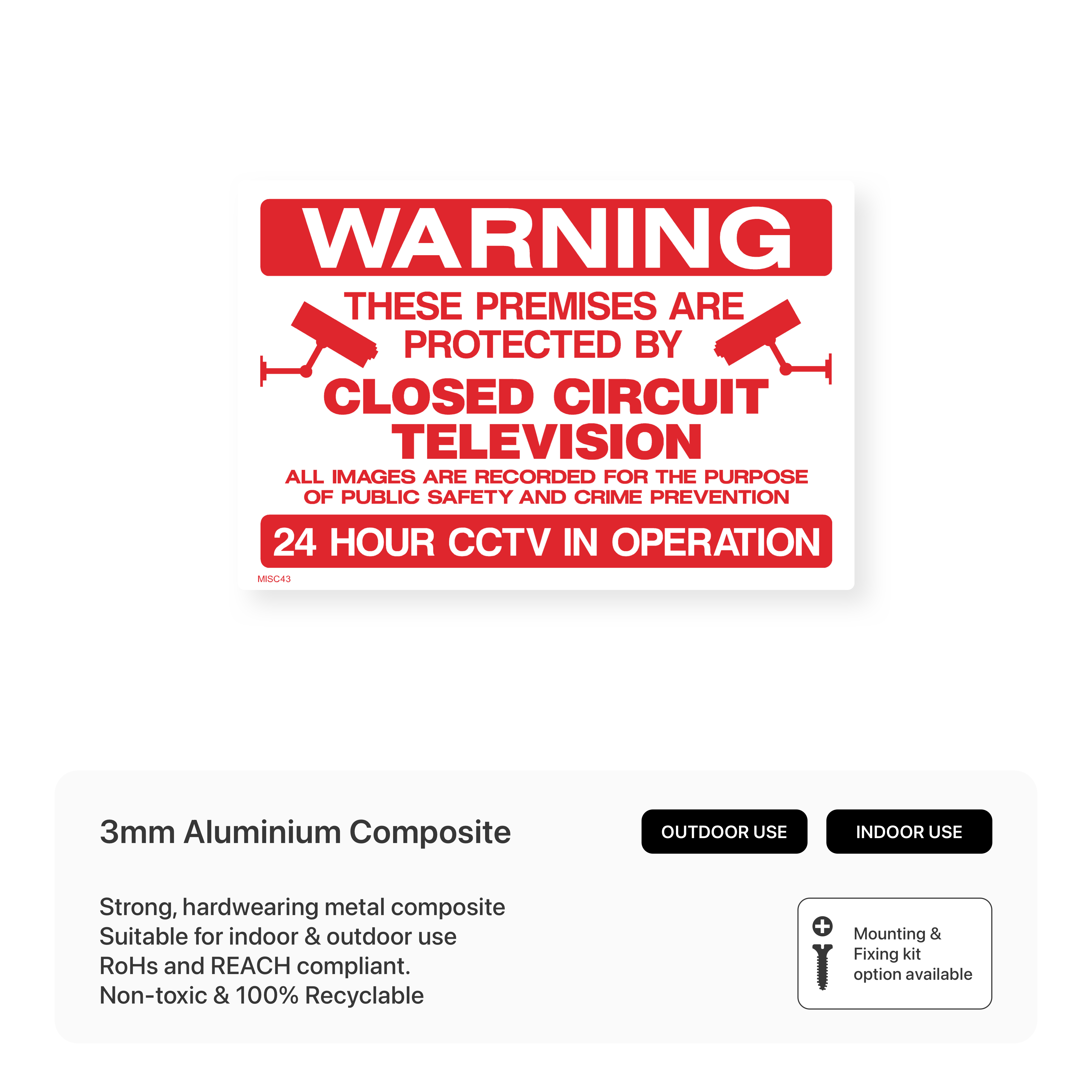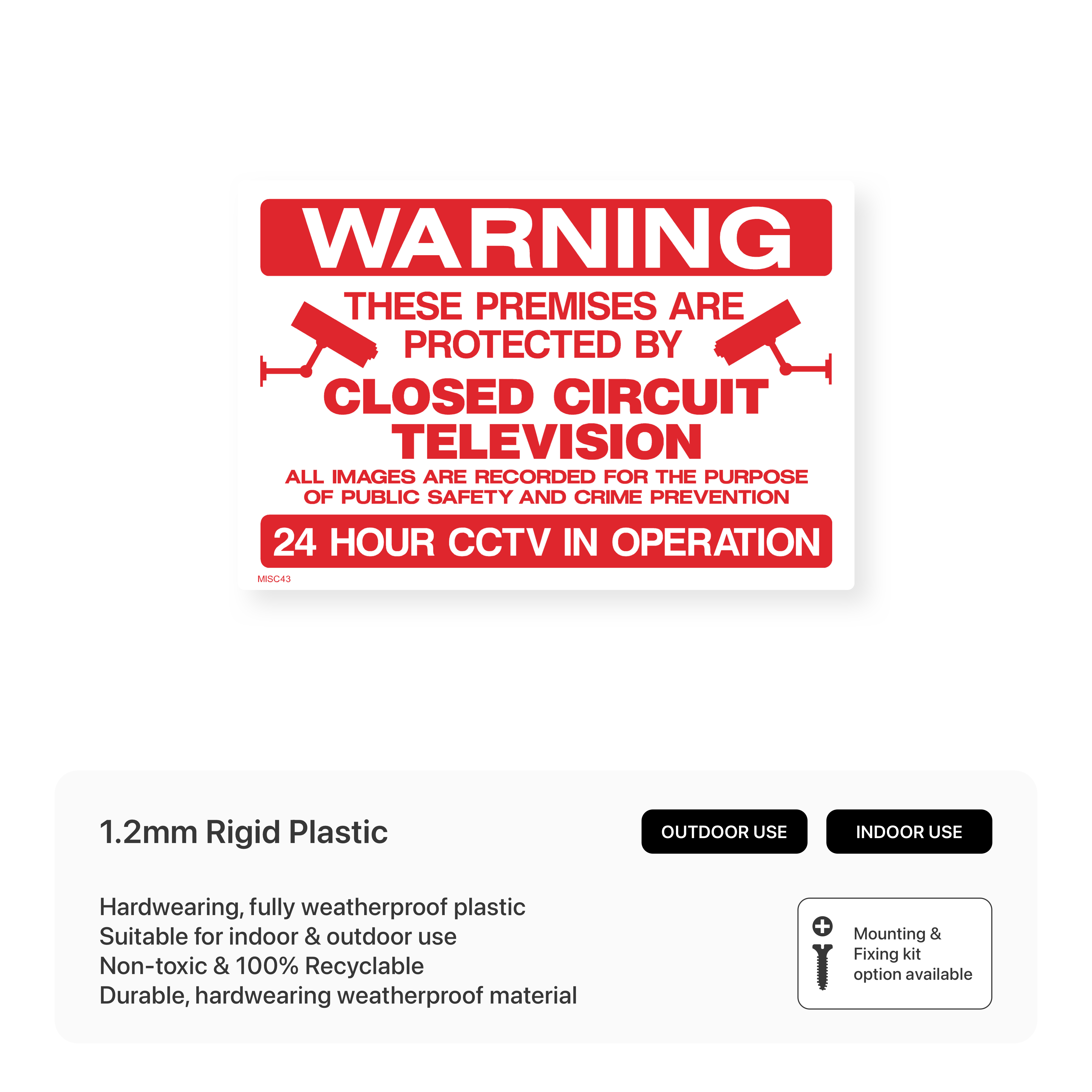 Deter potential intruders with our clear and durable CCTV warning signs. Available in various sizes and materials, these signs effectively communicate 24/7 surveillance for enhanced security and crime prevention.