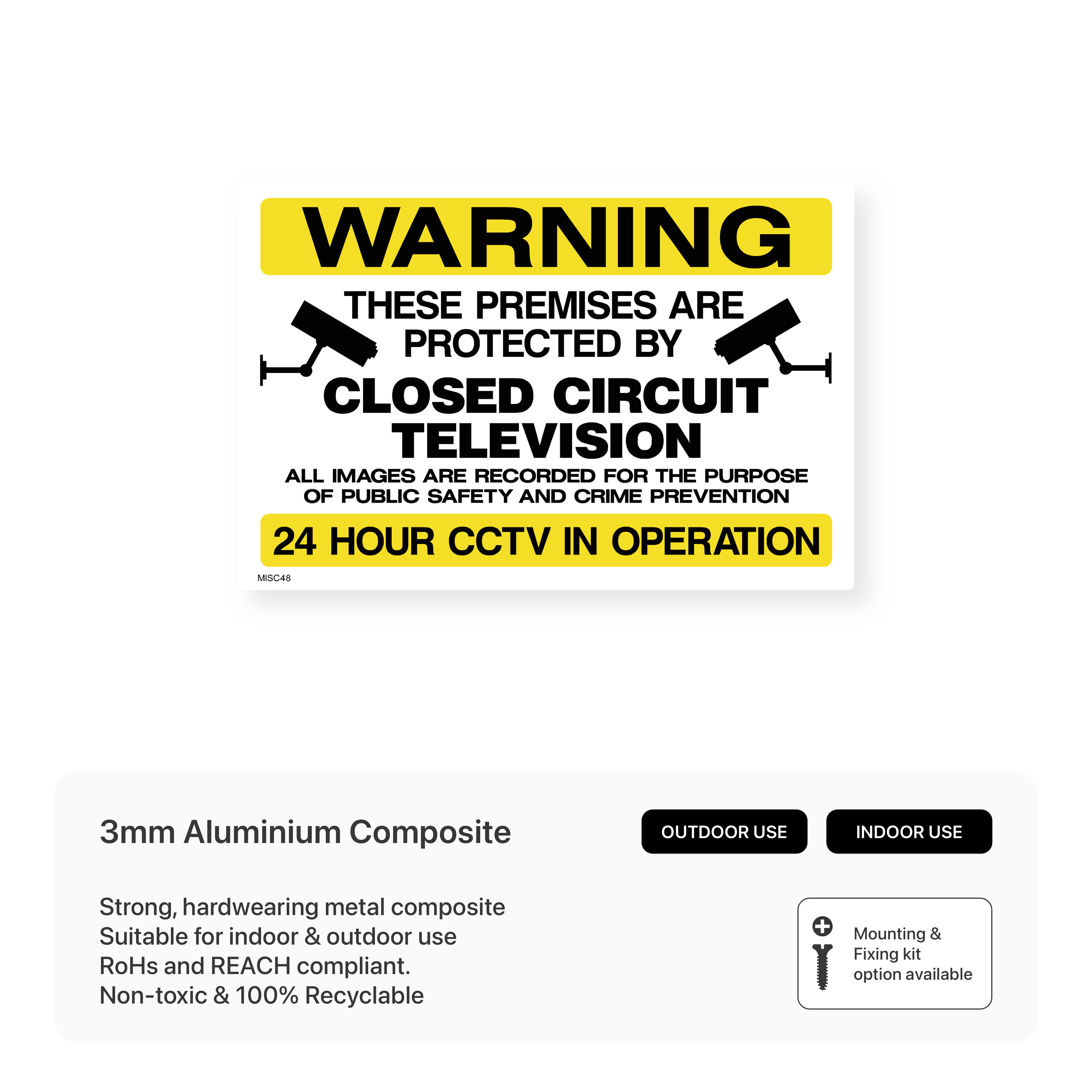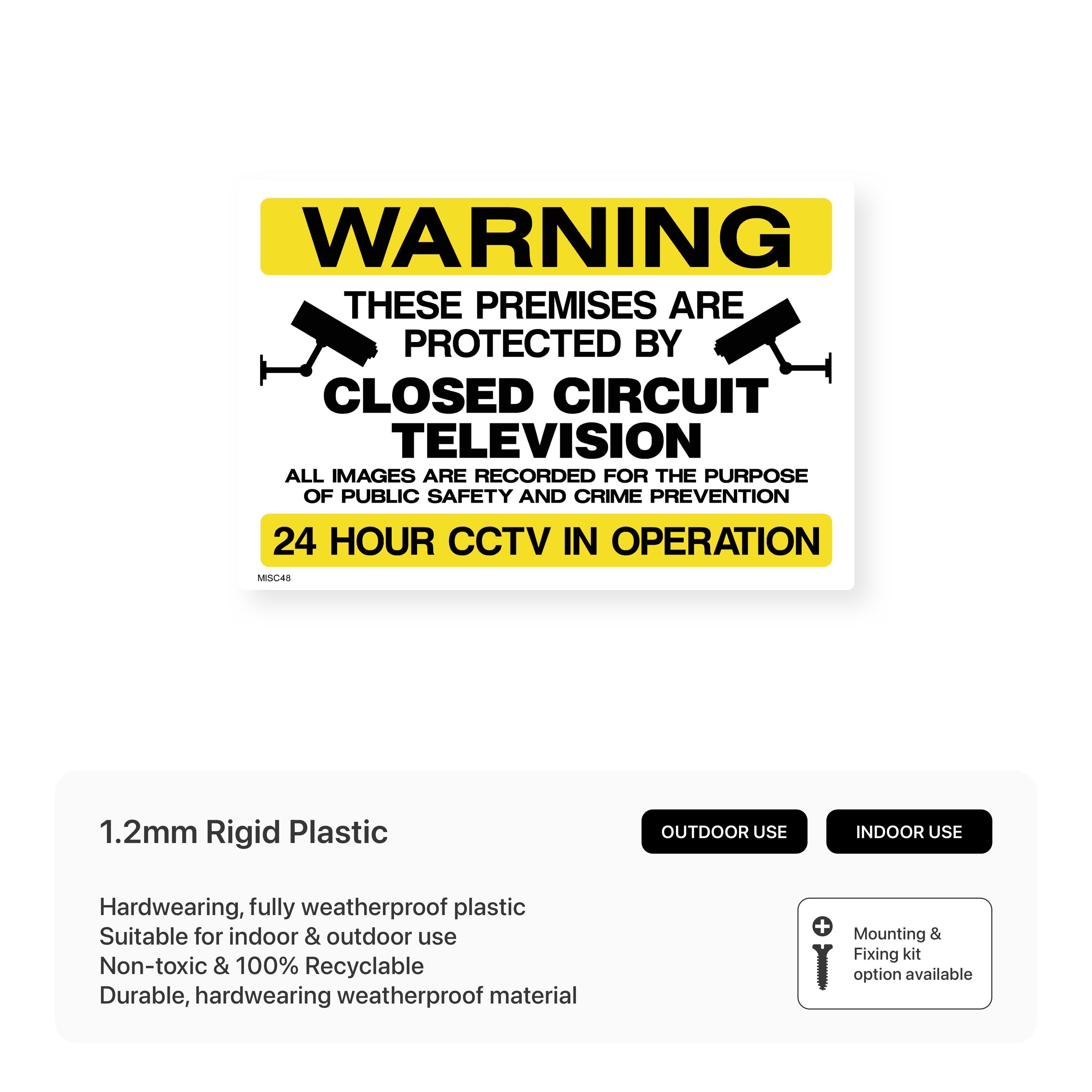 Enhance security and deter crime with our highly visible "CCTV Warning" signs. Clearly communicate that your premises are under 24/7 surveillance, recording all activity for public safety and crime prevention. Available in various sizes and materials to suit your needs.
