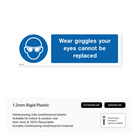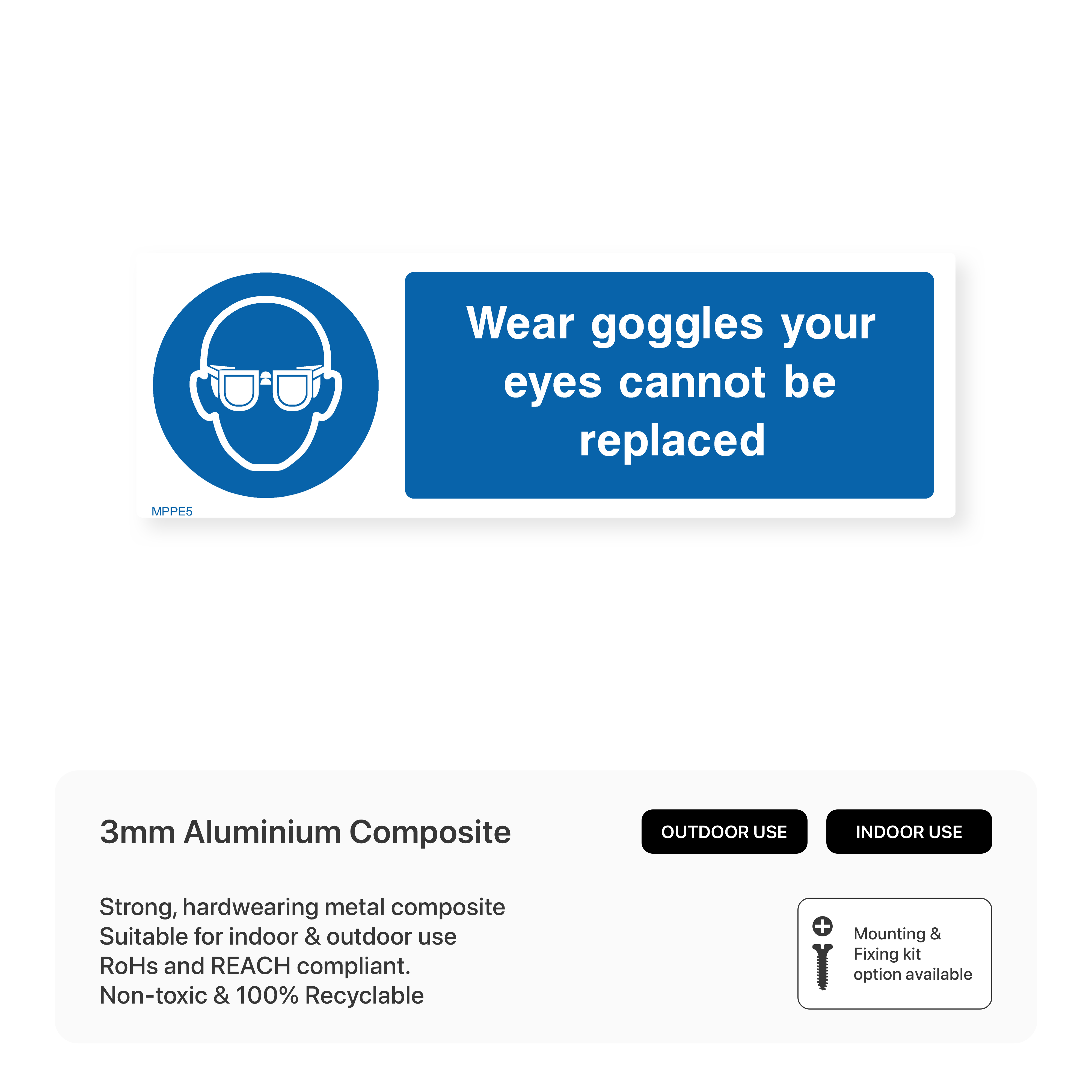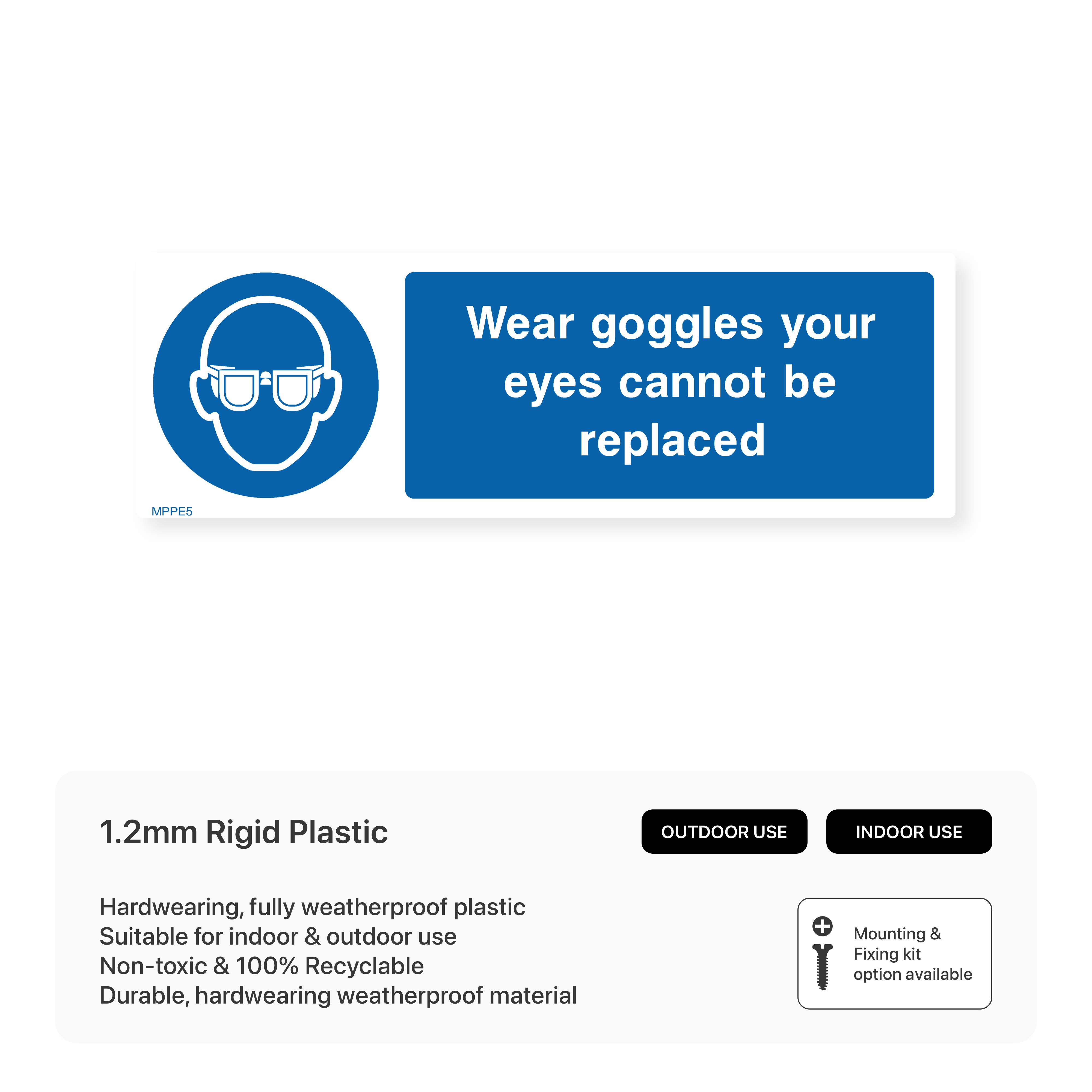 Emphasize the importance of eye protection with our impactful "Wear Goggles - Your Eyes Cannot Be Replaced" sign. This sign serves as a powerful reminder of the irreversible consequences of eye injuries and encourages the consistent use of goggles in hazardous environments. Choose from various sizes and materials to prioritize safety and protect your most valuable asset – your eyesight.