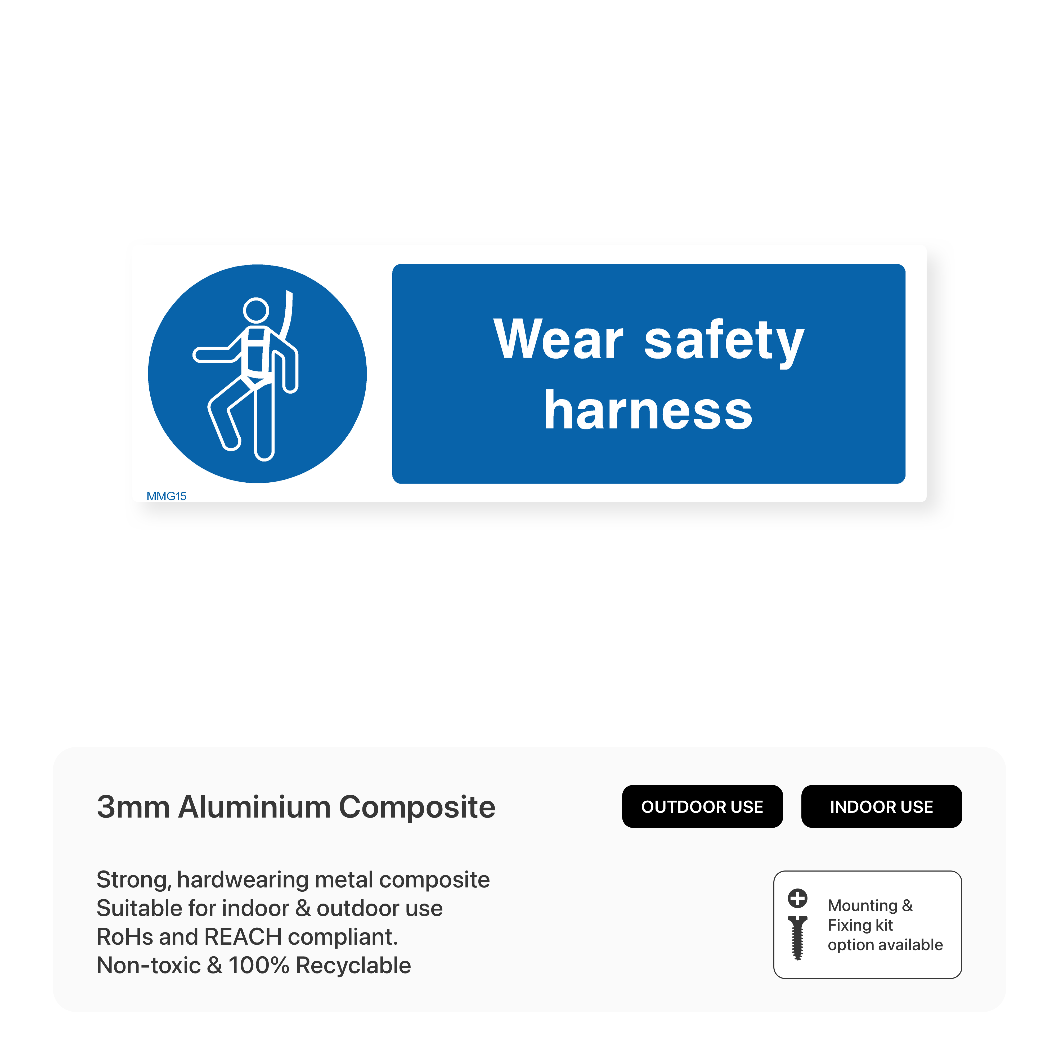 Ensure worker safety at heights with our "Wear Safety Harness" signs. Clearly communicate the mandatory use of safety harnesses in elevated work areas. Available in various sizes and materials for high visibility on construction sites and industrial settings.