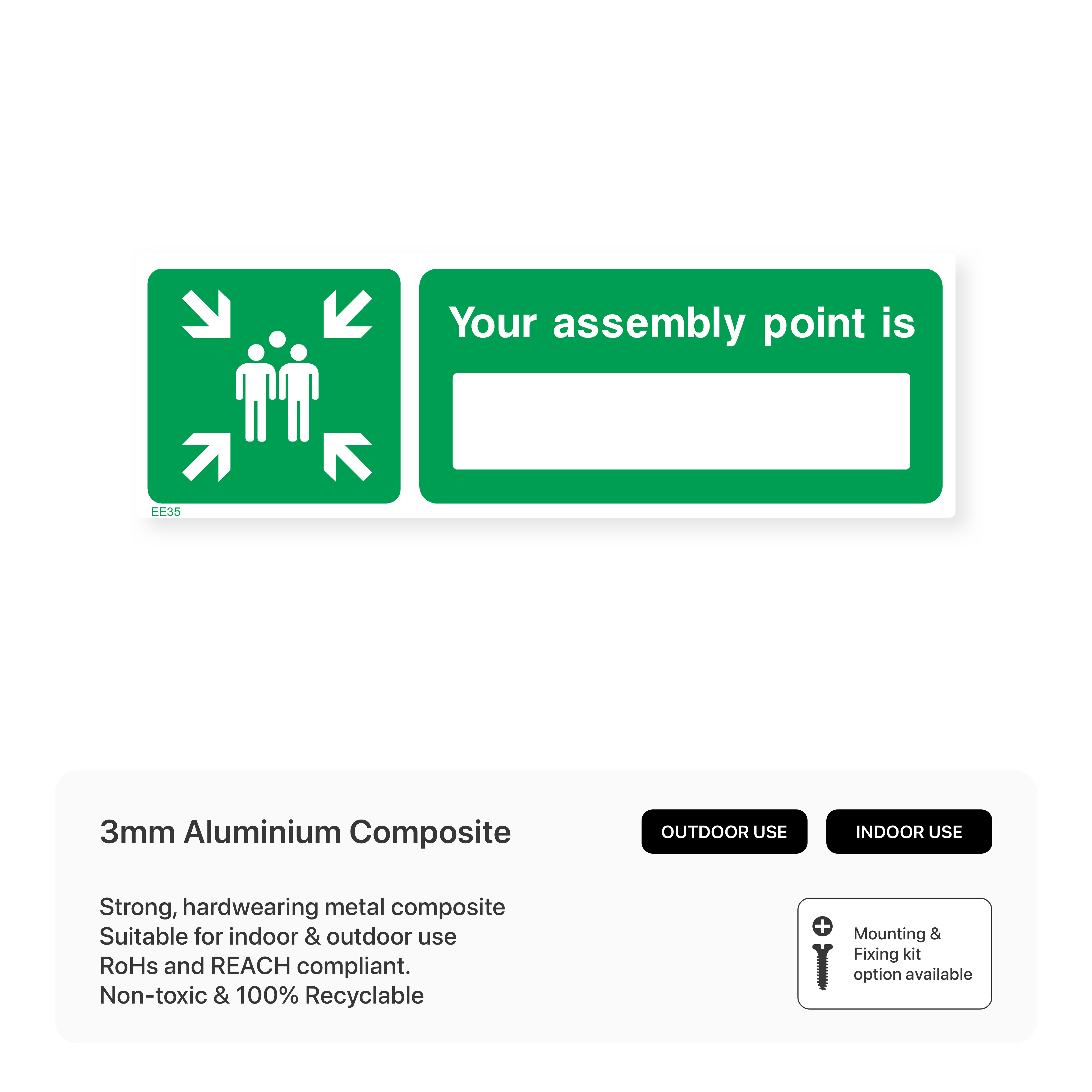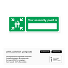 Clearly mark the designated assembly point with our "Your assembly point is..." sign. This sign helps individuals quickly gather at a safe location during emergencies or evacuations, ensuring their safety and facilitating an organized response.