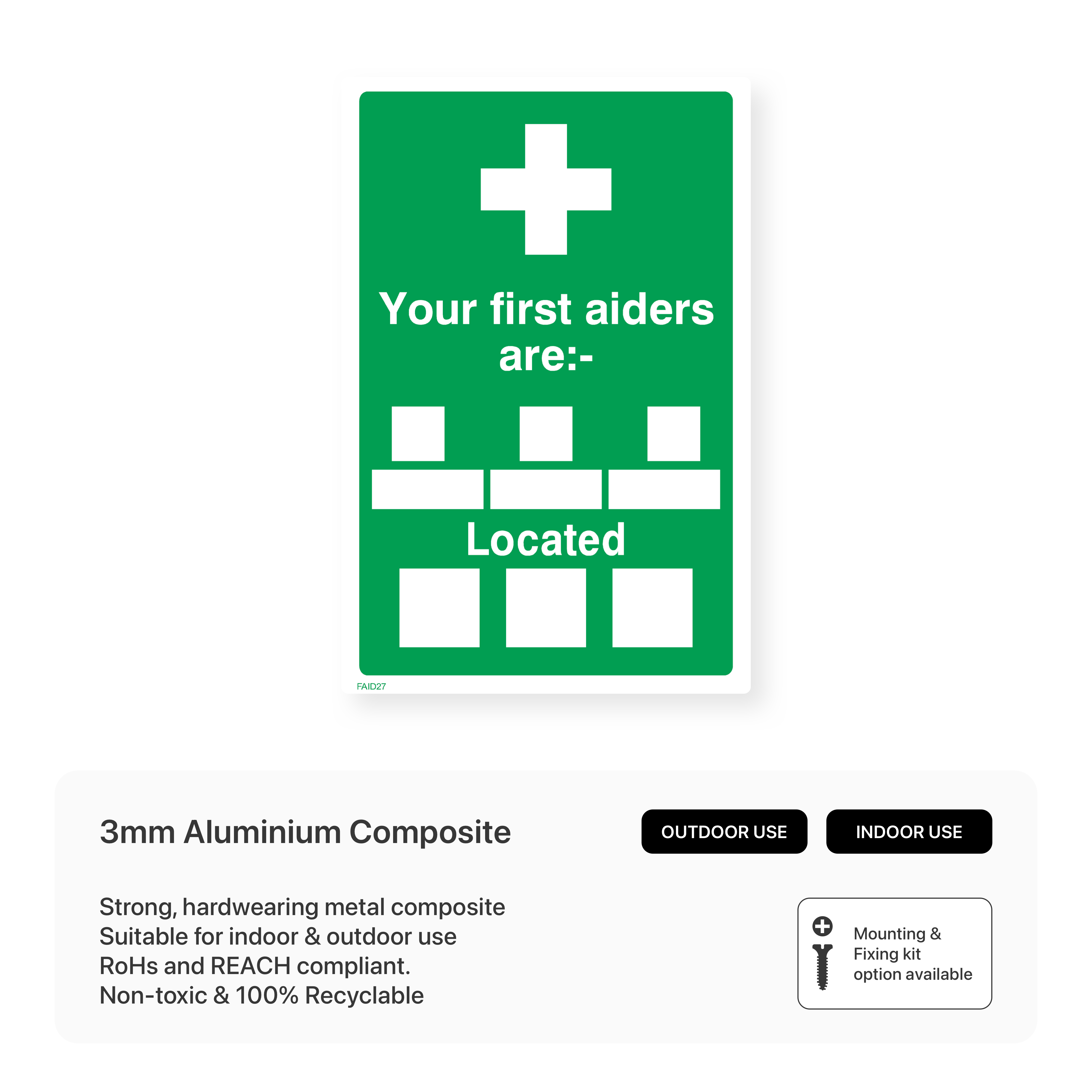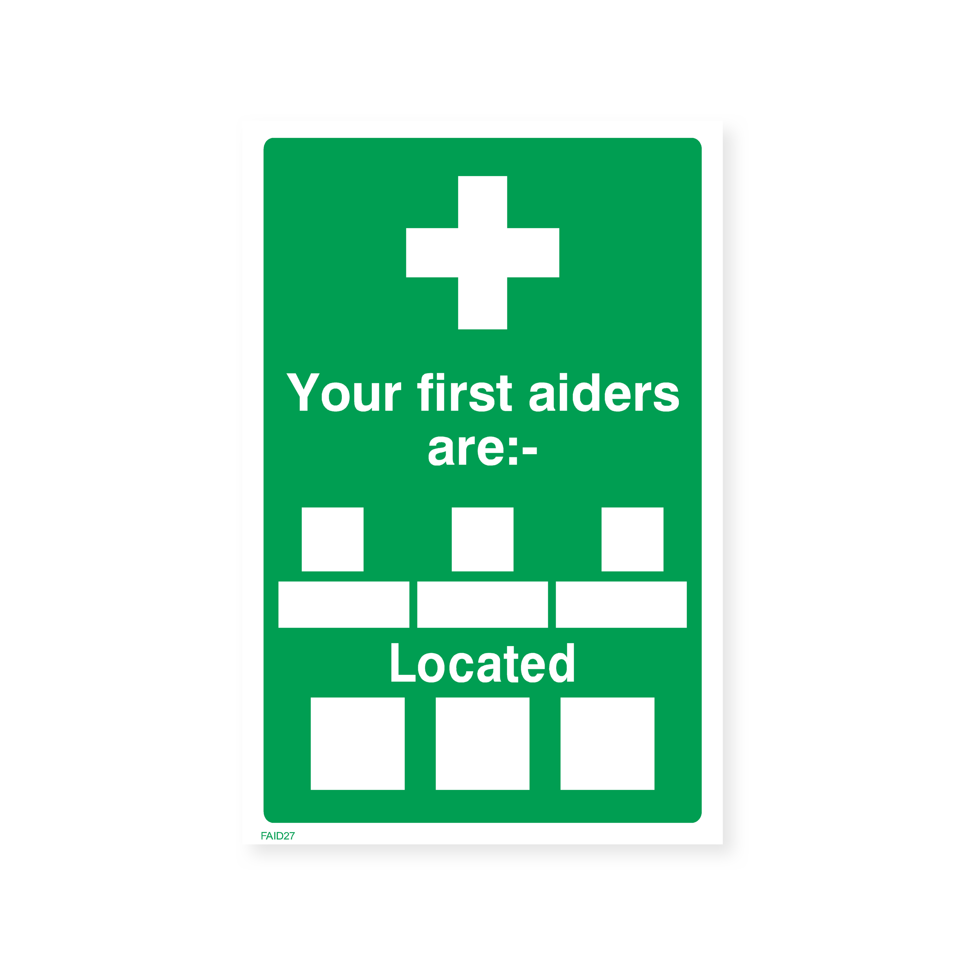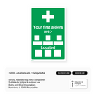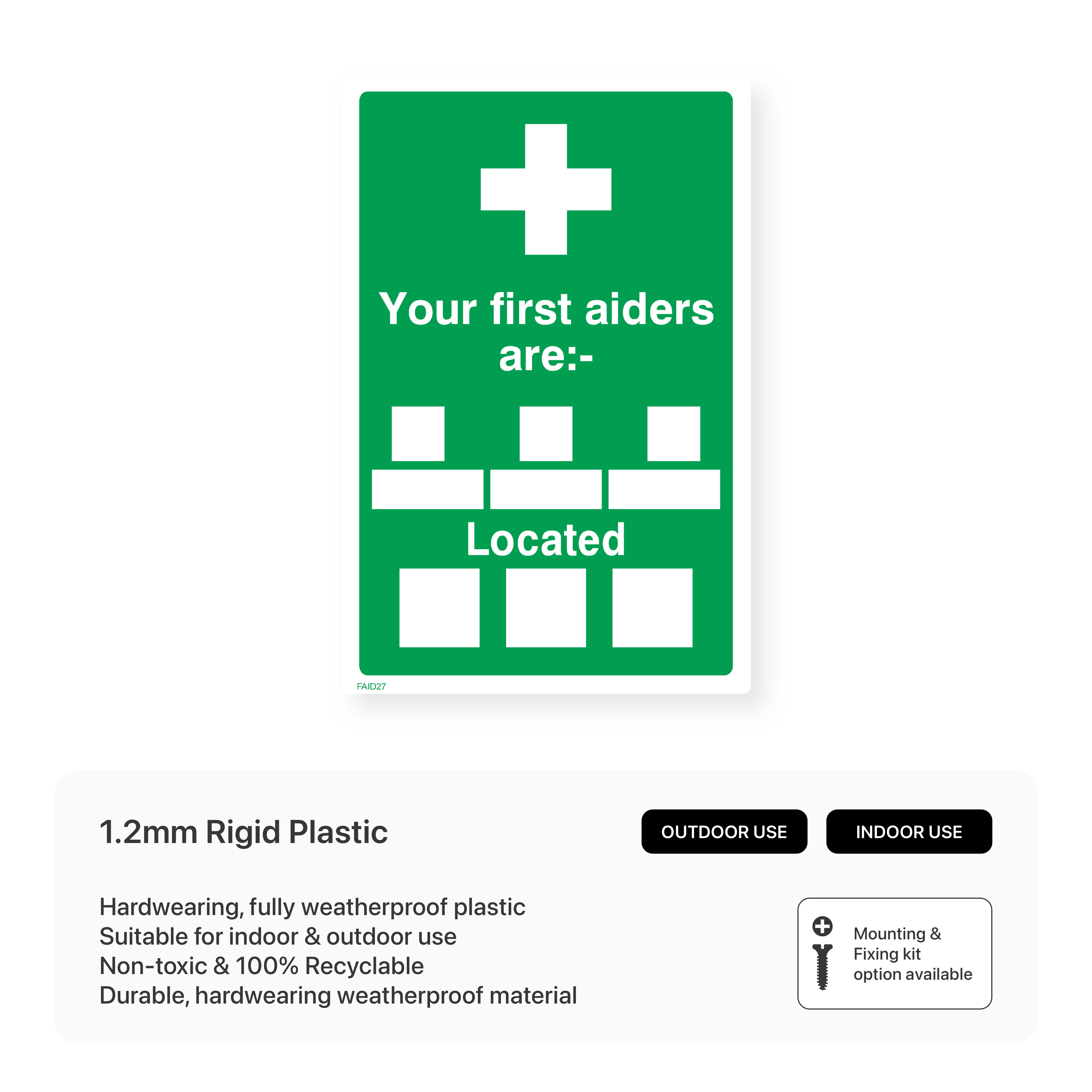 Inform individuals about the designated first aiders' locations with our "First aid - Your first aiders are located" sign. This sign ensures that individuals know where to find first aiders in case of an emergency, promoting a quick response and efficient medical attention.