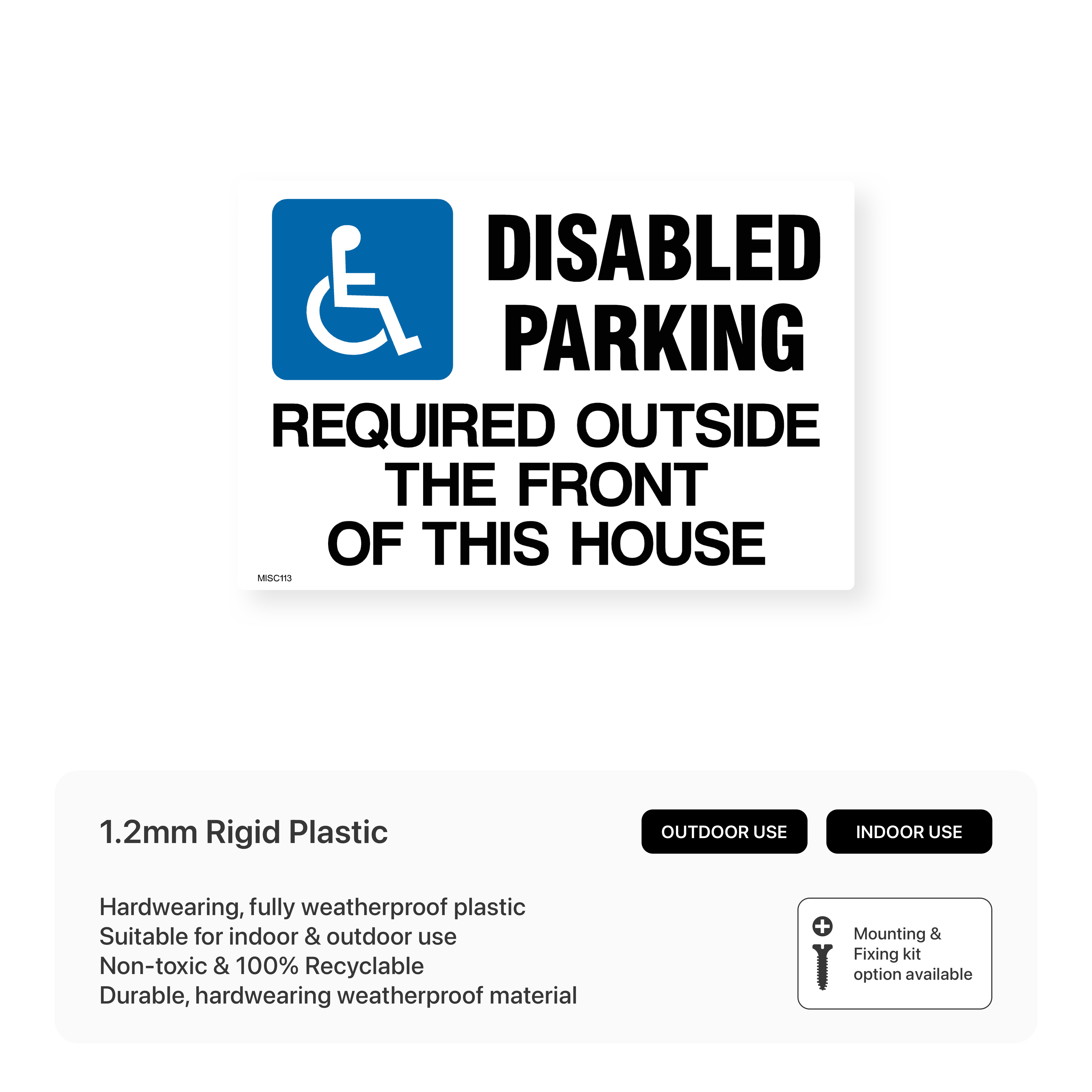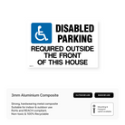 Clearly mark designated disabled parking spaces in front of your house with our "Disabled Parking Required" signs. Ensure accessibility and compliance with regulations. Available in various sizes and materials for maximum visibility.