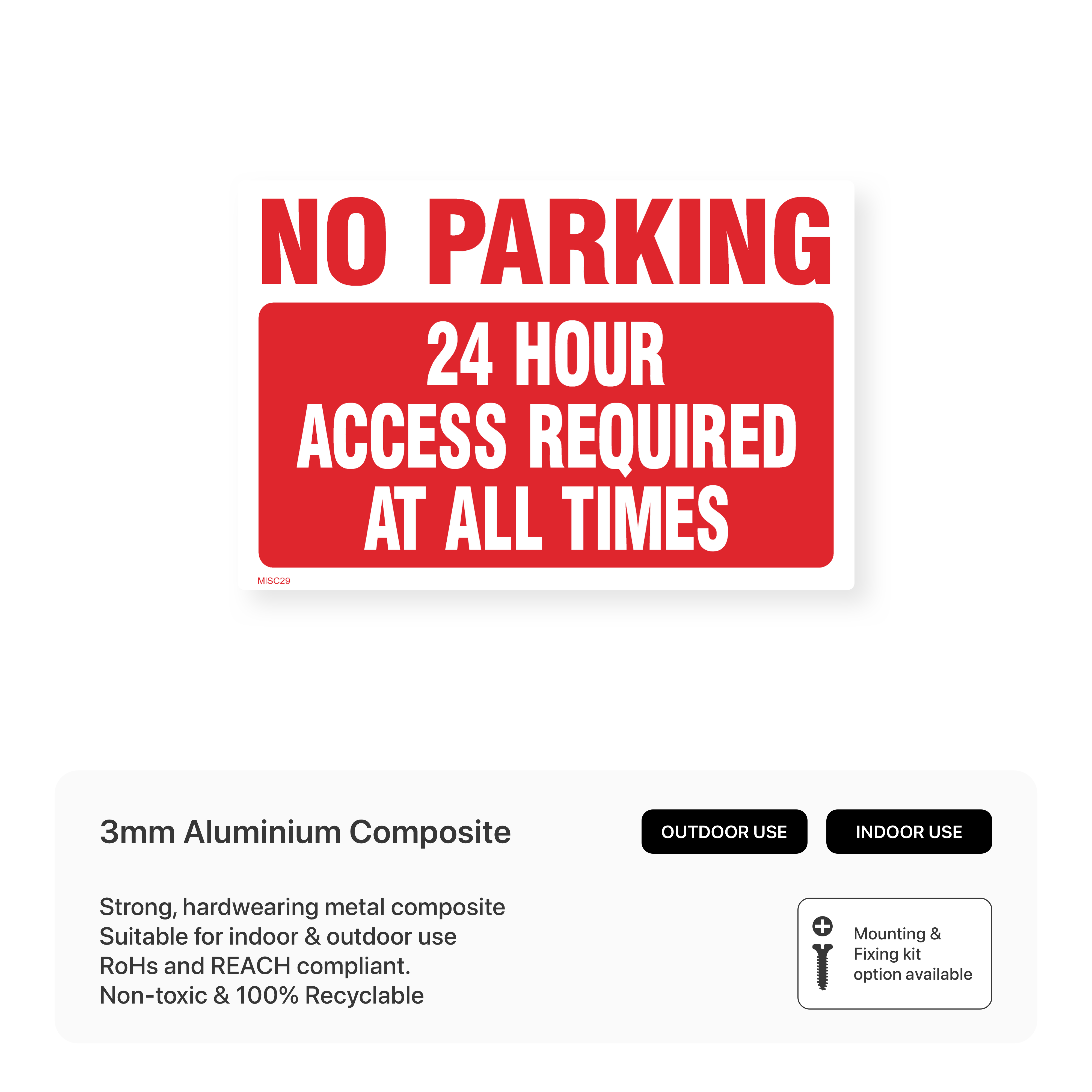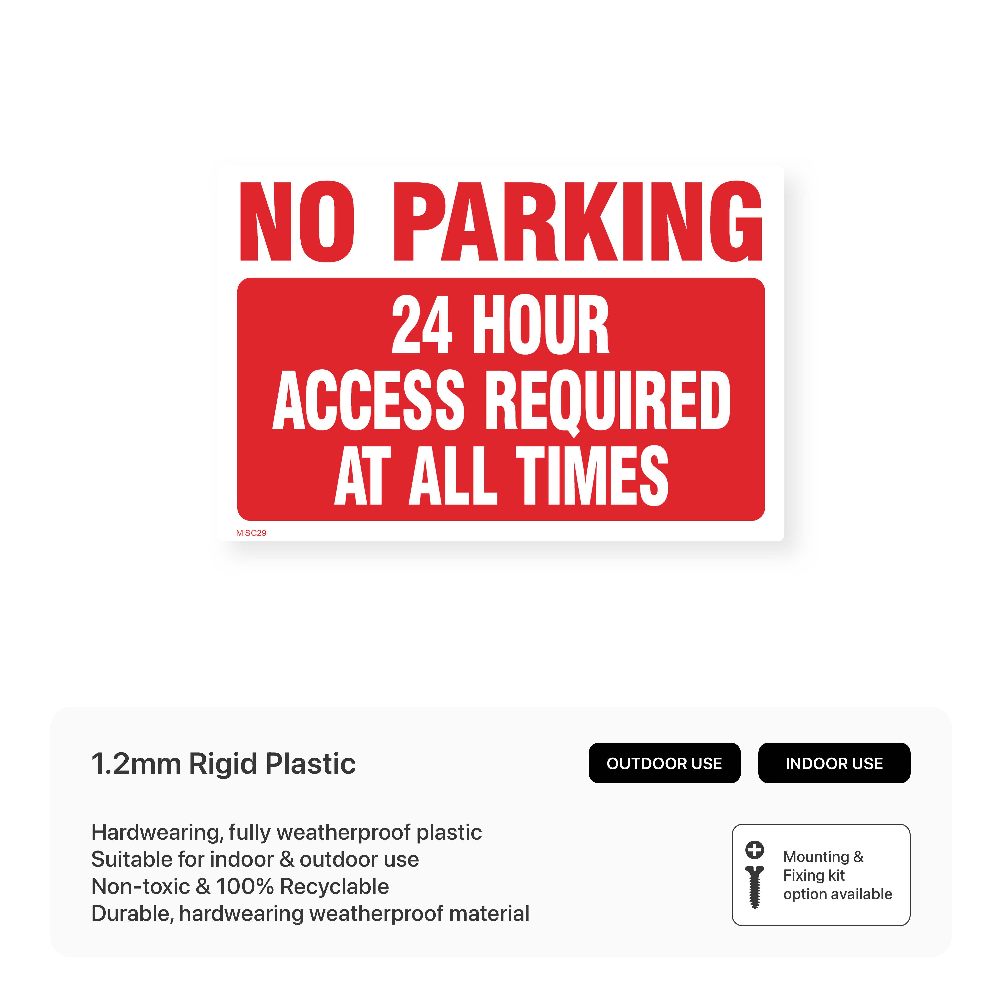 Prevent unauthorised parking and maintain clear access with this "No Parking - 24 Hour Access Required" sign. This sign is essential for emergency access routes, loading bays, and areas where vehicles need to be able to access the premises at all times.