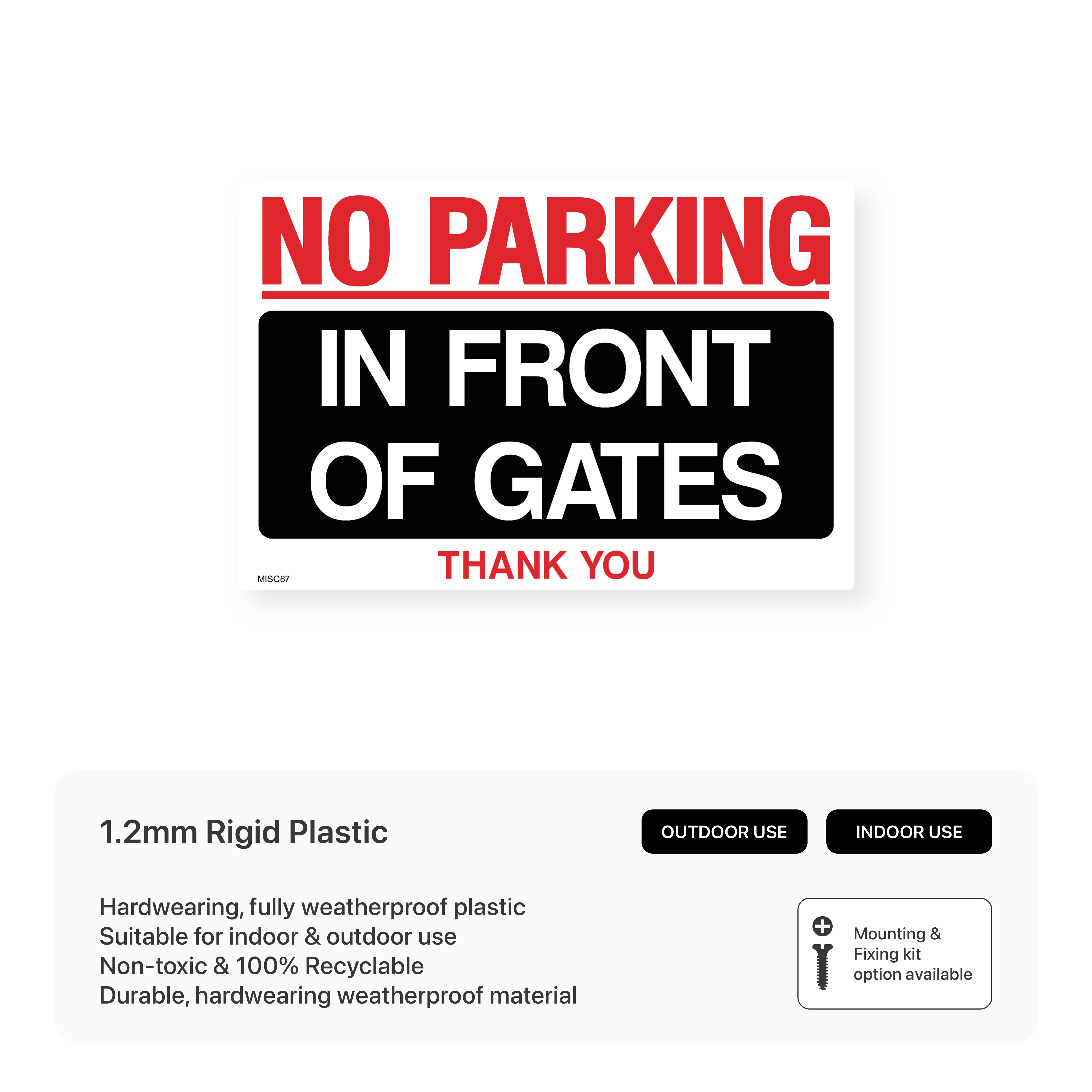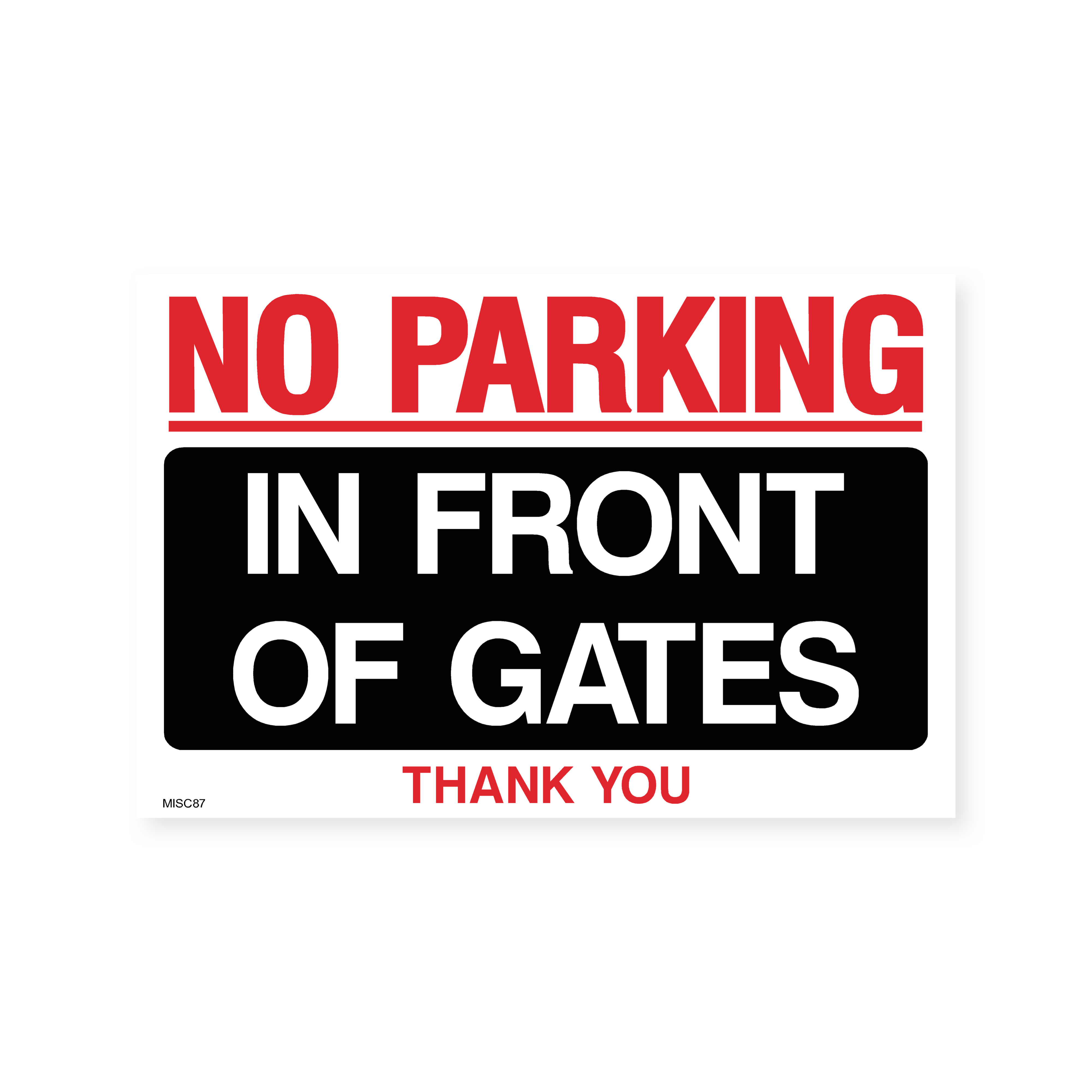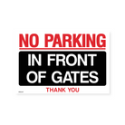 Maintain clear access and prevent obstructions with our "No Parking in Front of Gates" signs. These polite reminders help ensure smooth traffic flow and access for everyone. Available in various sizes and materials.