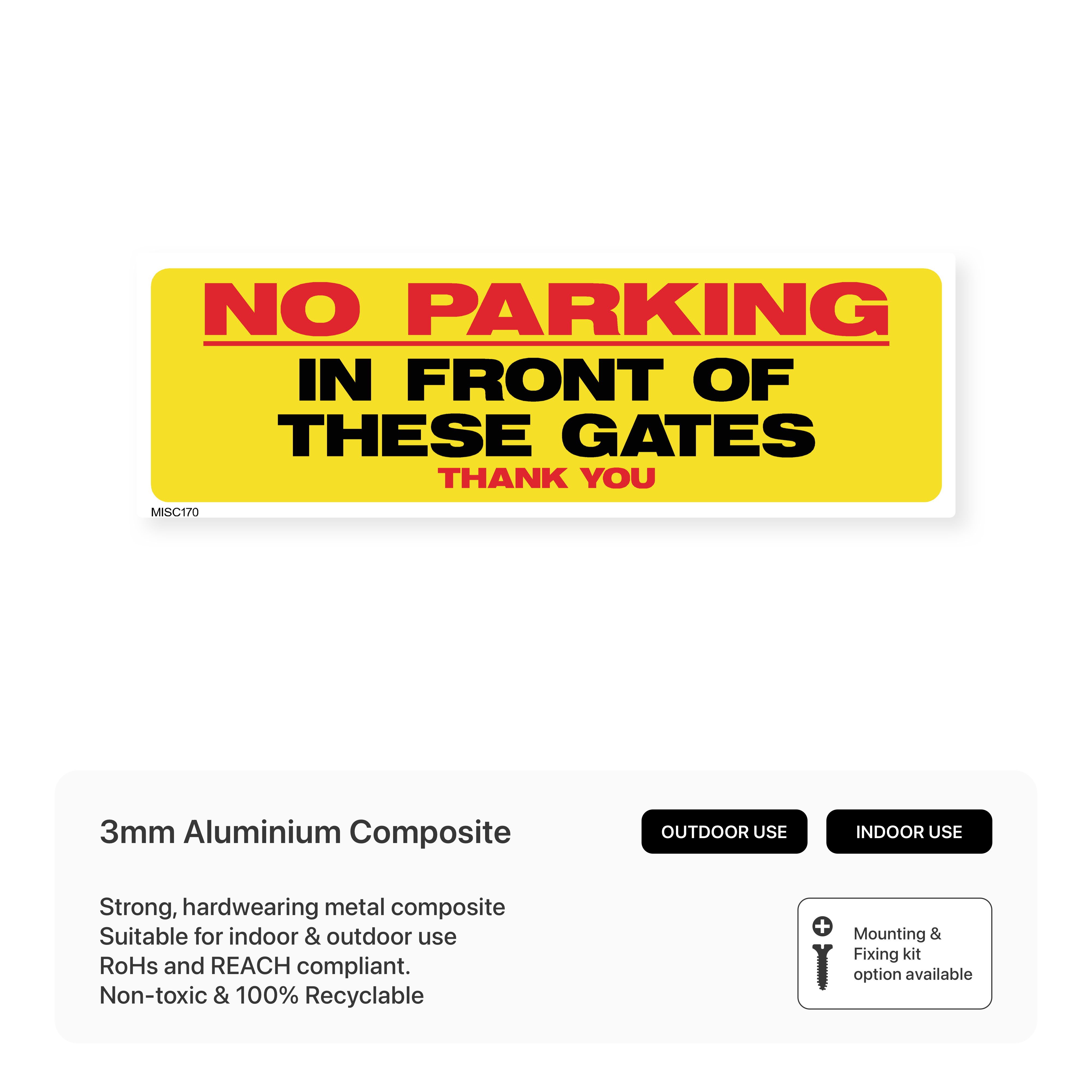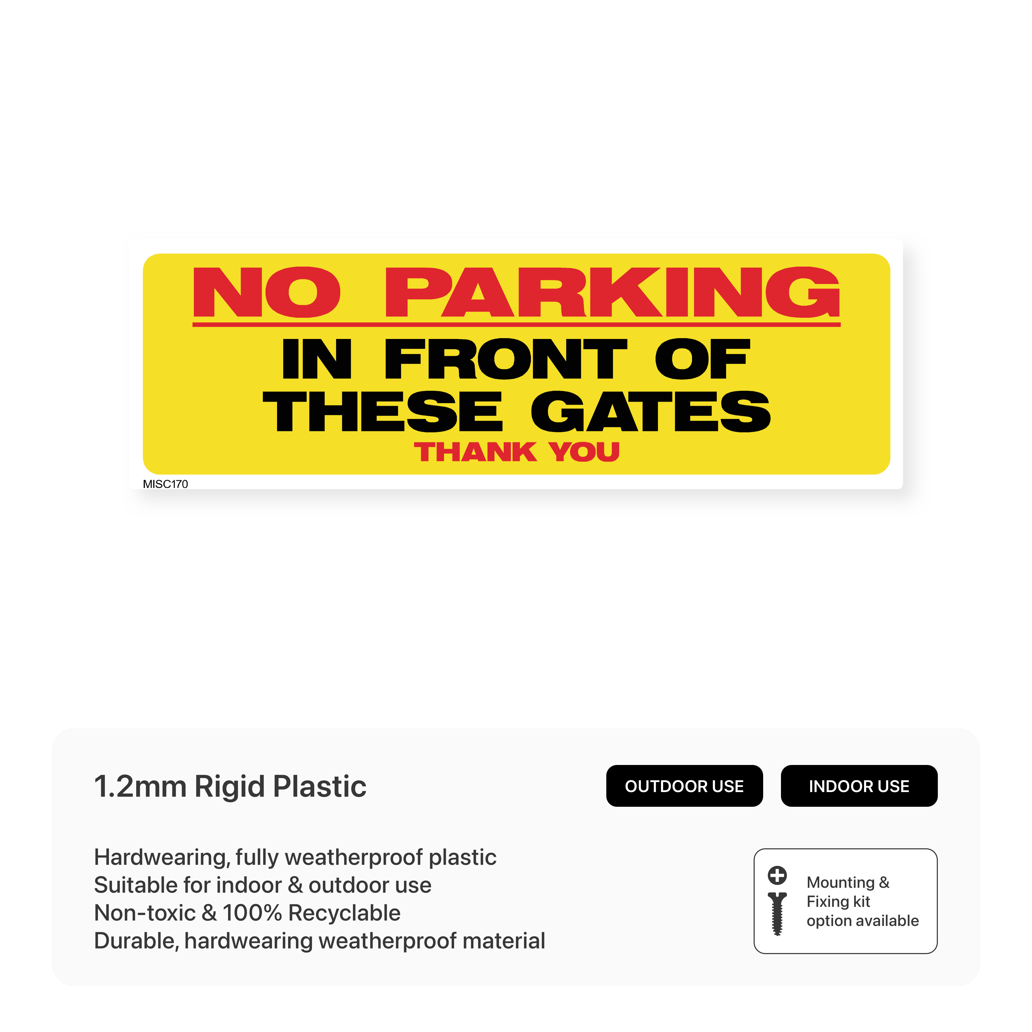 Prevent obstruction and maintain access with our "No Parking In Front of These Gates" signs. Clearly communicate parking restrictions and keep your gates accessible. Available in various sizes and materials.