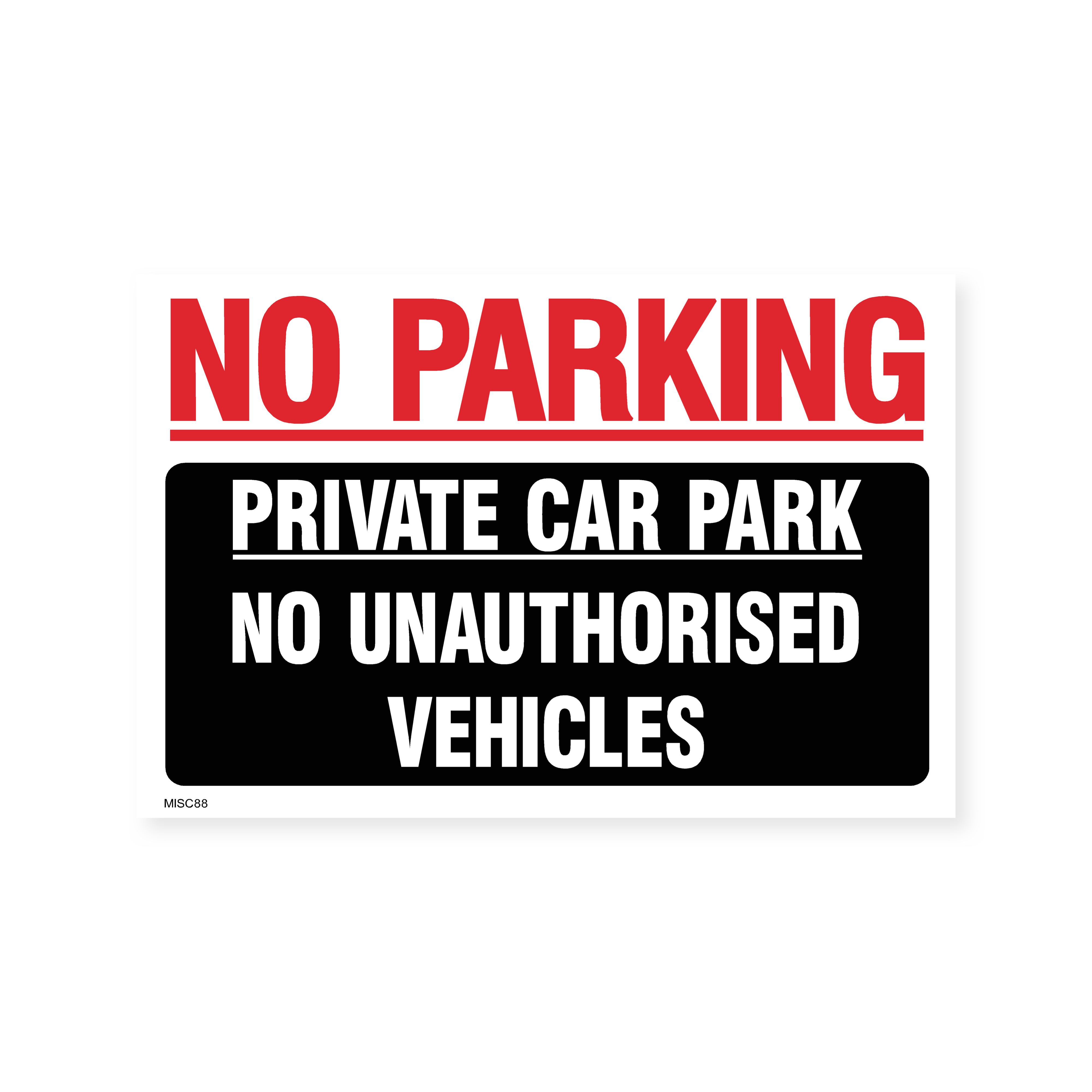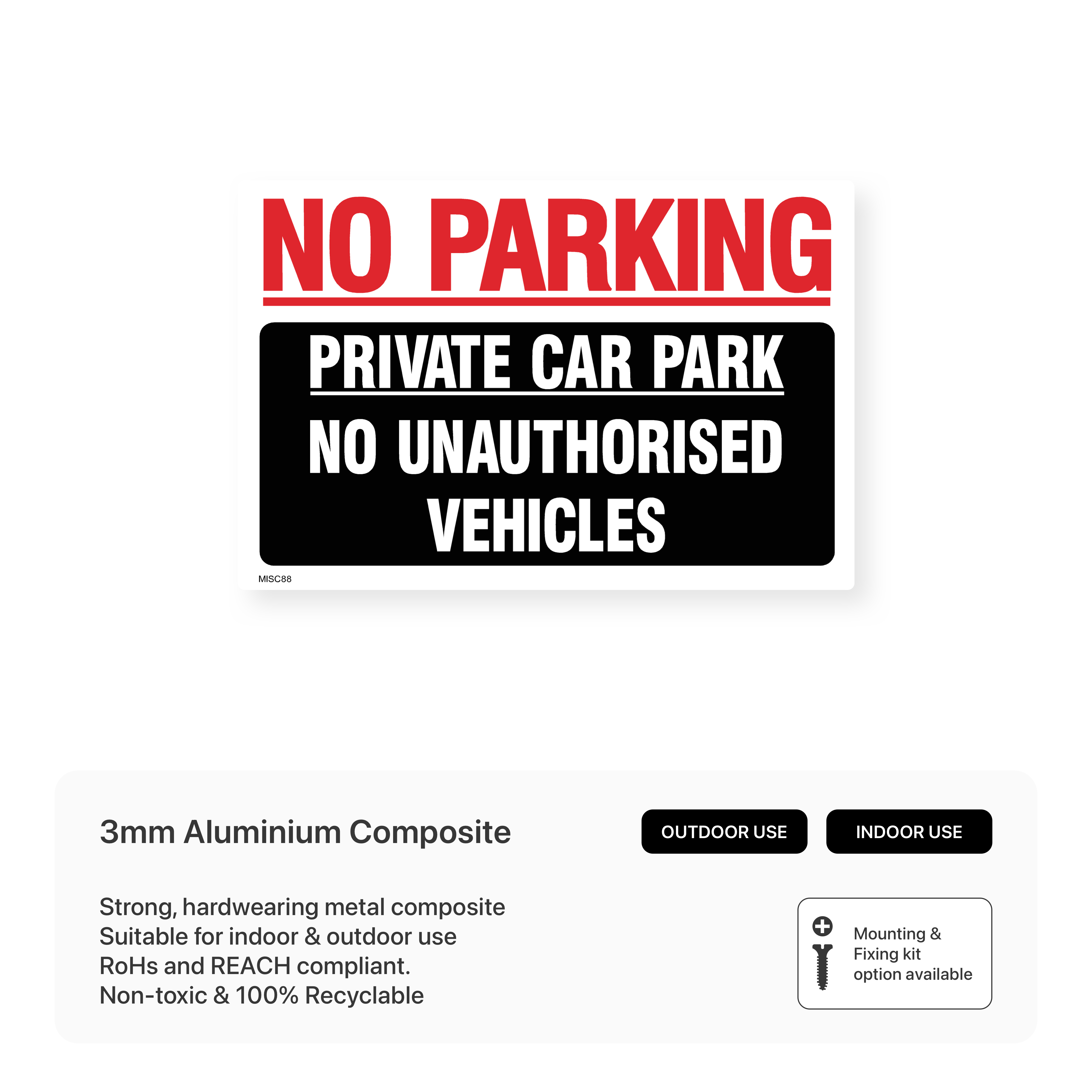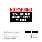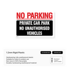 Clearly designate your private car park and prevent unauthorized parking with our durable "No Parking - Private Car Park" signs. Maintain control over your parking area and ensure spaces are available for authorised vehicles. Choose from a variety of sizes and materials to suit your needs.