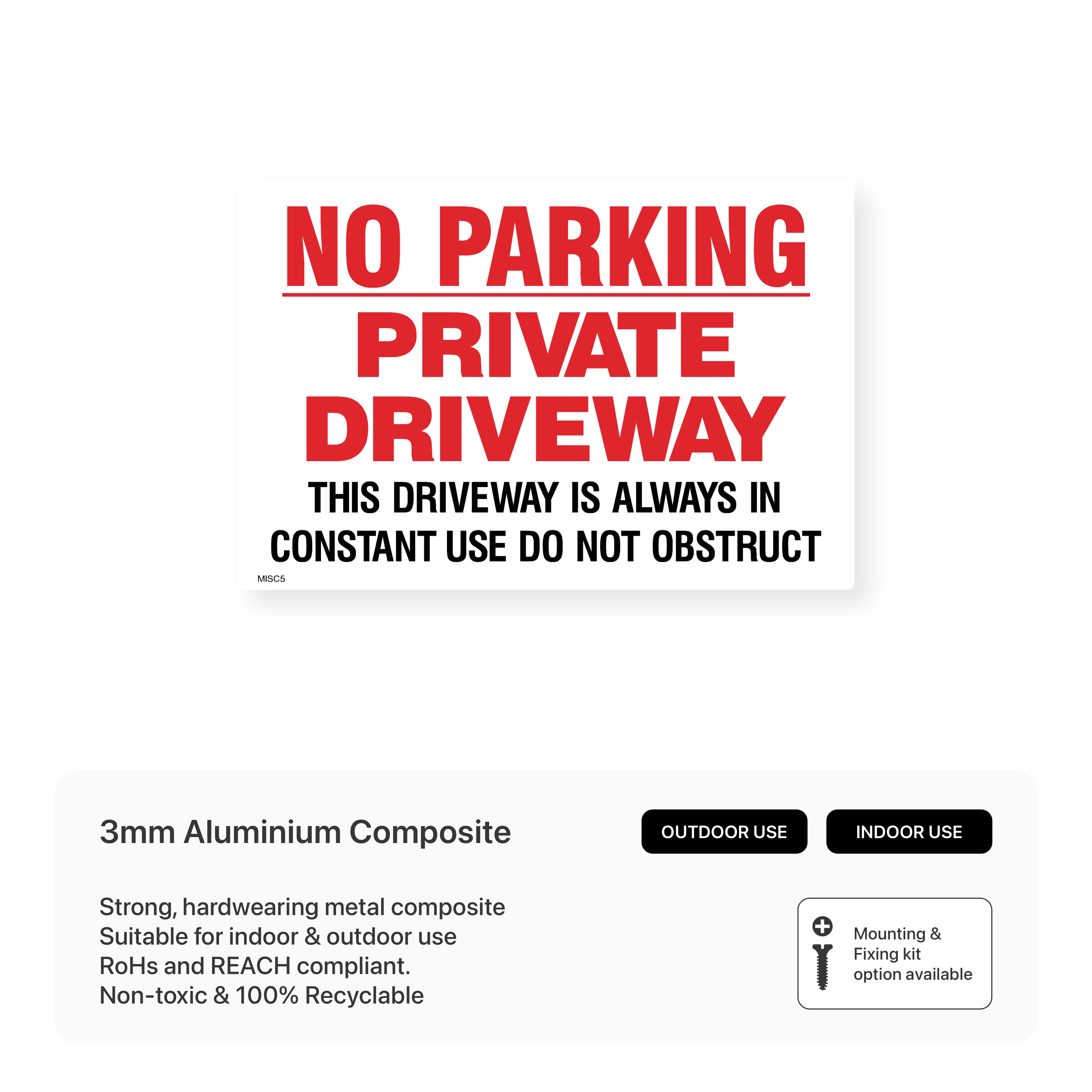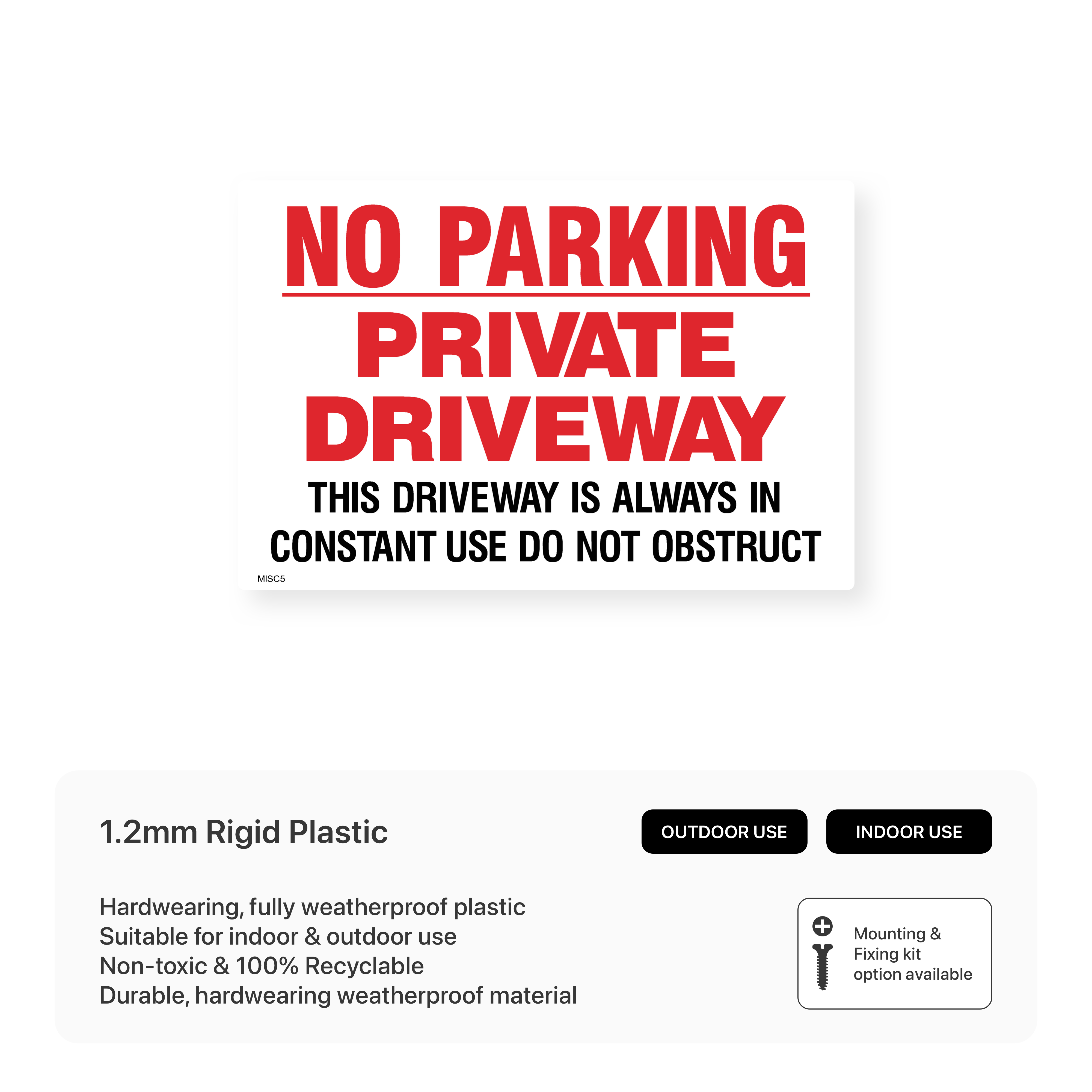 Clearly mark your private driveway and discourage unauthorised parking with this "No Parking - Private Driveway" sign. Emphasize the constant use of the driveway and the need to keep it clear for access. Available in multiple sizes and durable materials for indoor or outdoor use.