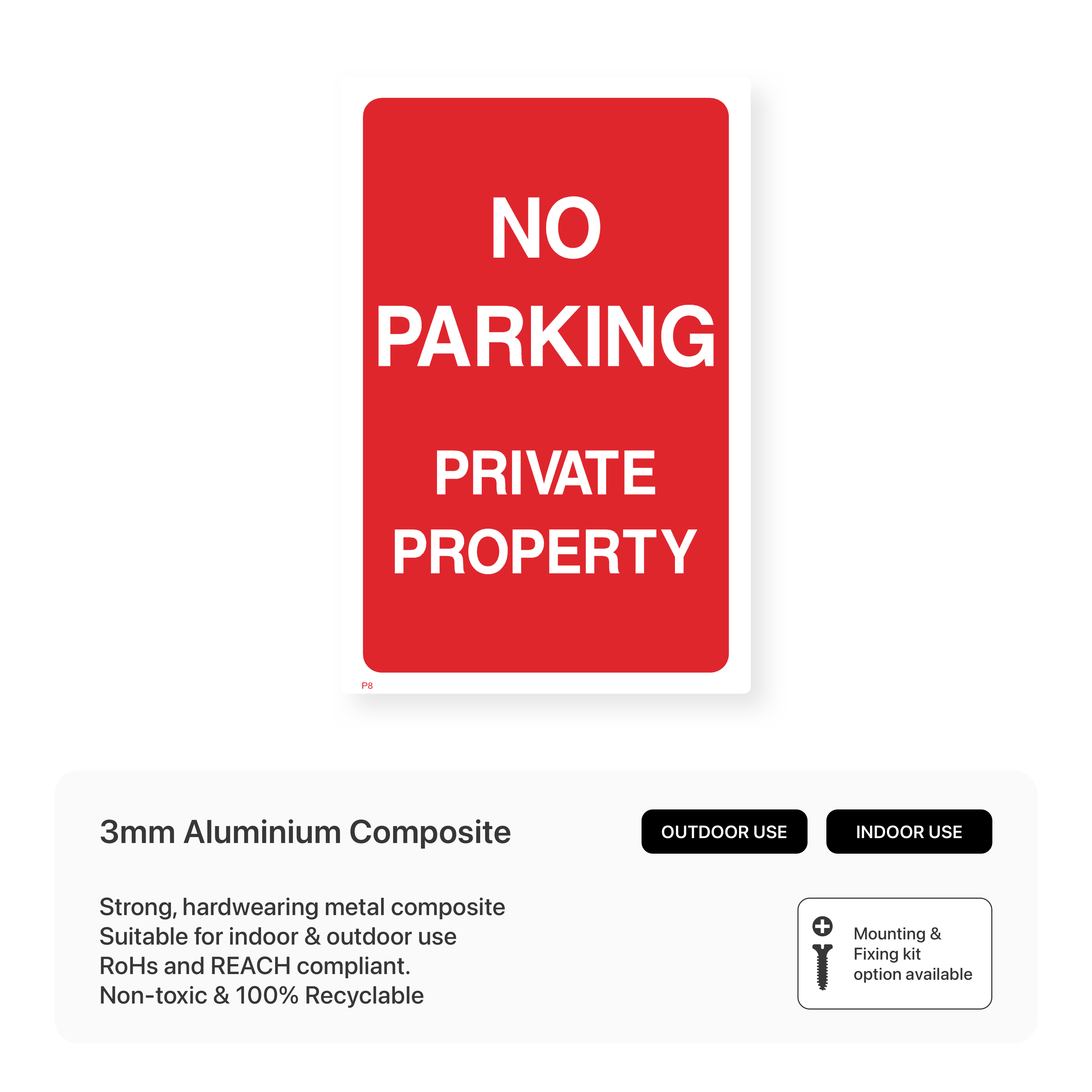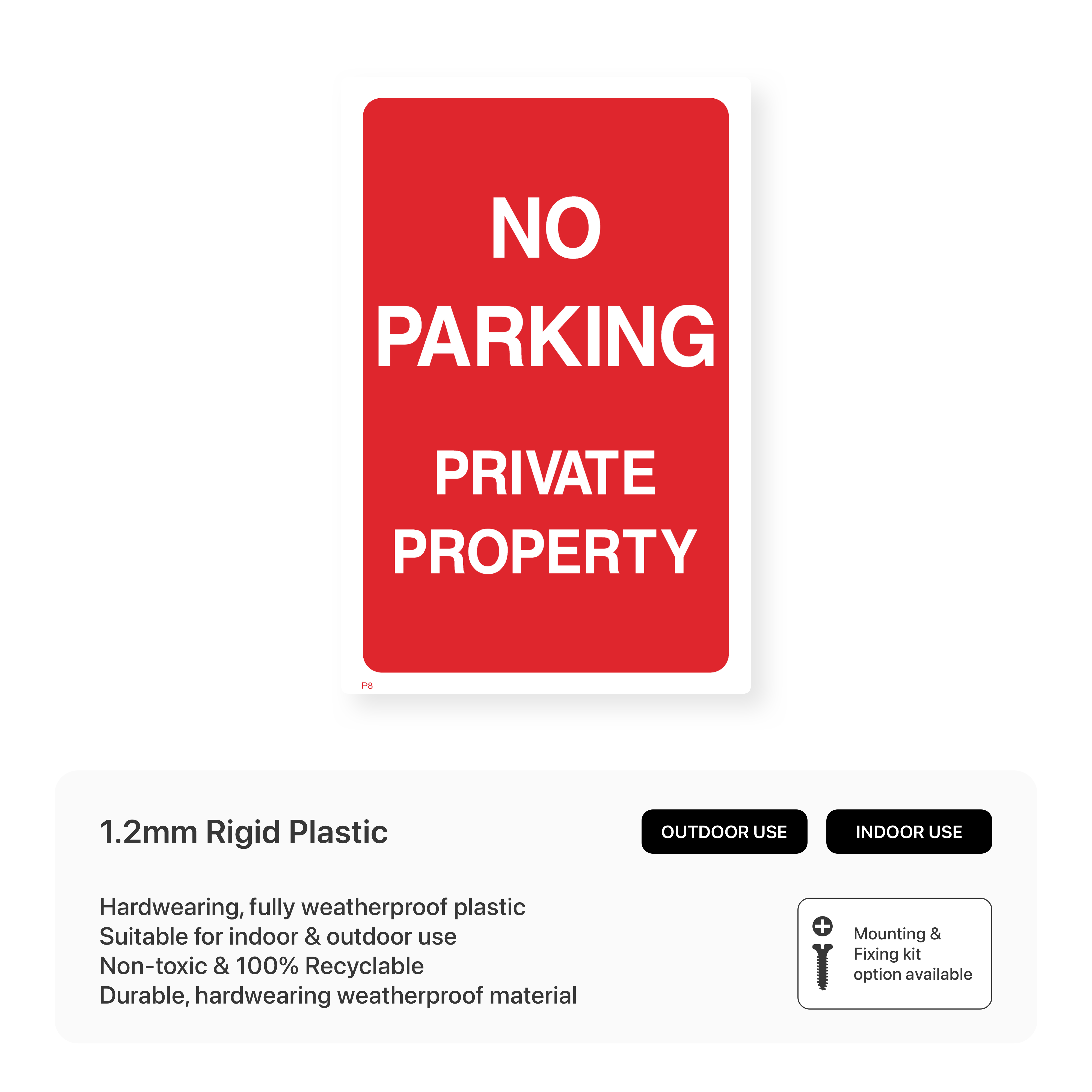 Deter unauthorised parking on your private property with our clear and concise "No Parking - Private Property" sign. This sign effectively communicates that parking is strictly prohibited, protecting your property from unwanted vehicles. Choose from various sizes and materials to suit your specific needs and maintain control over your parking areas.