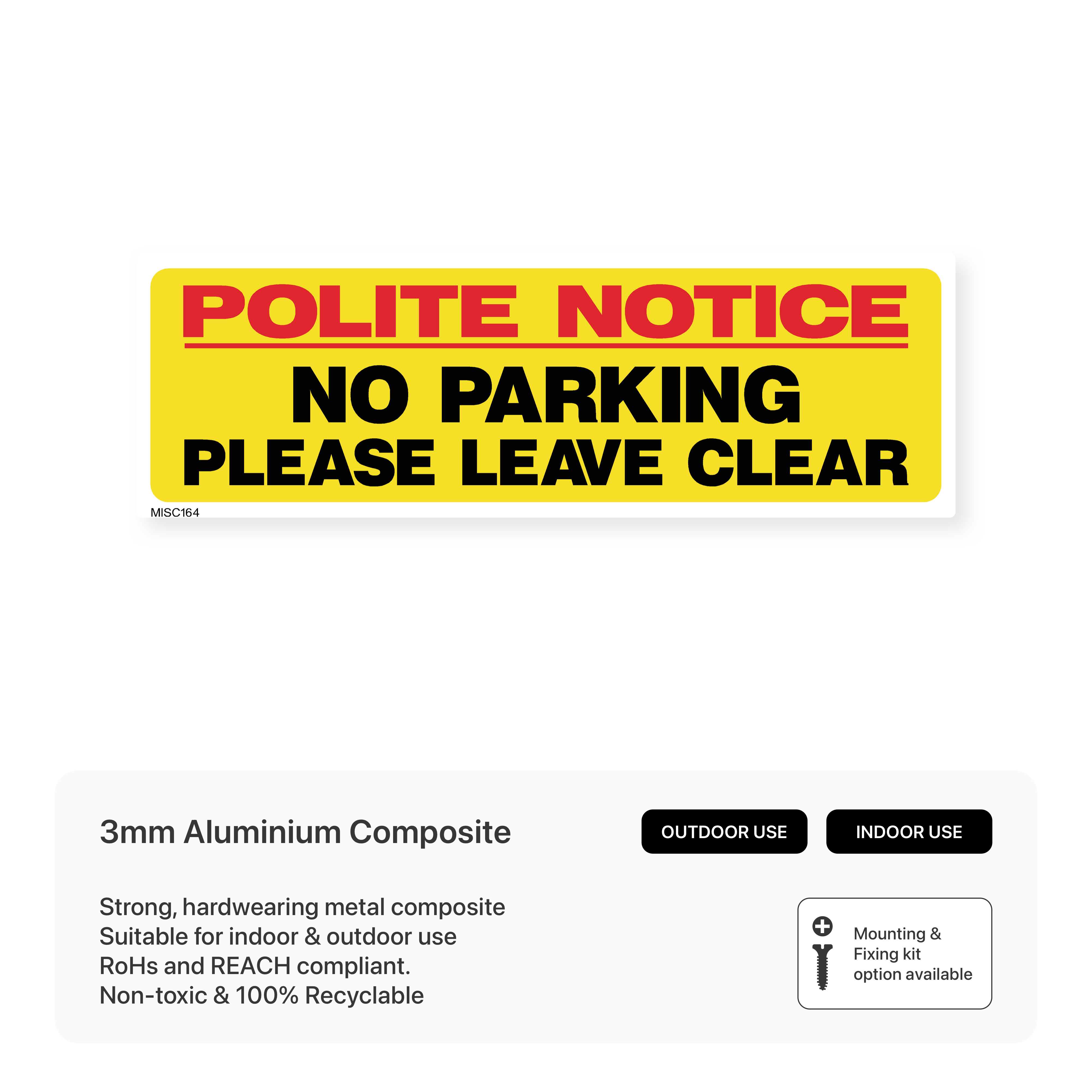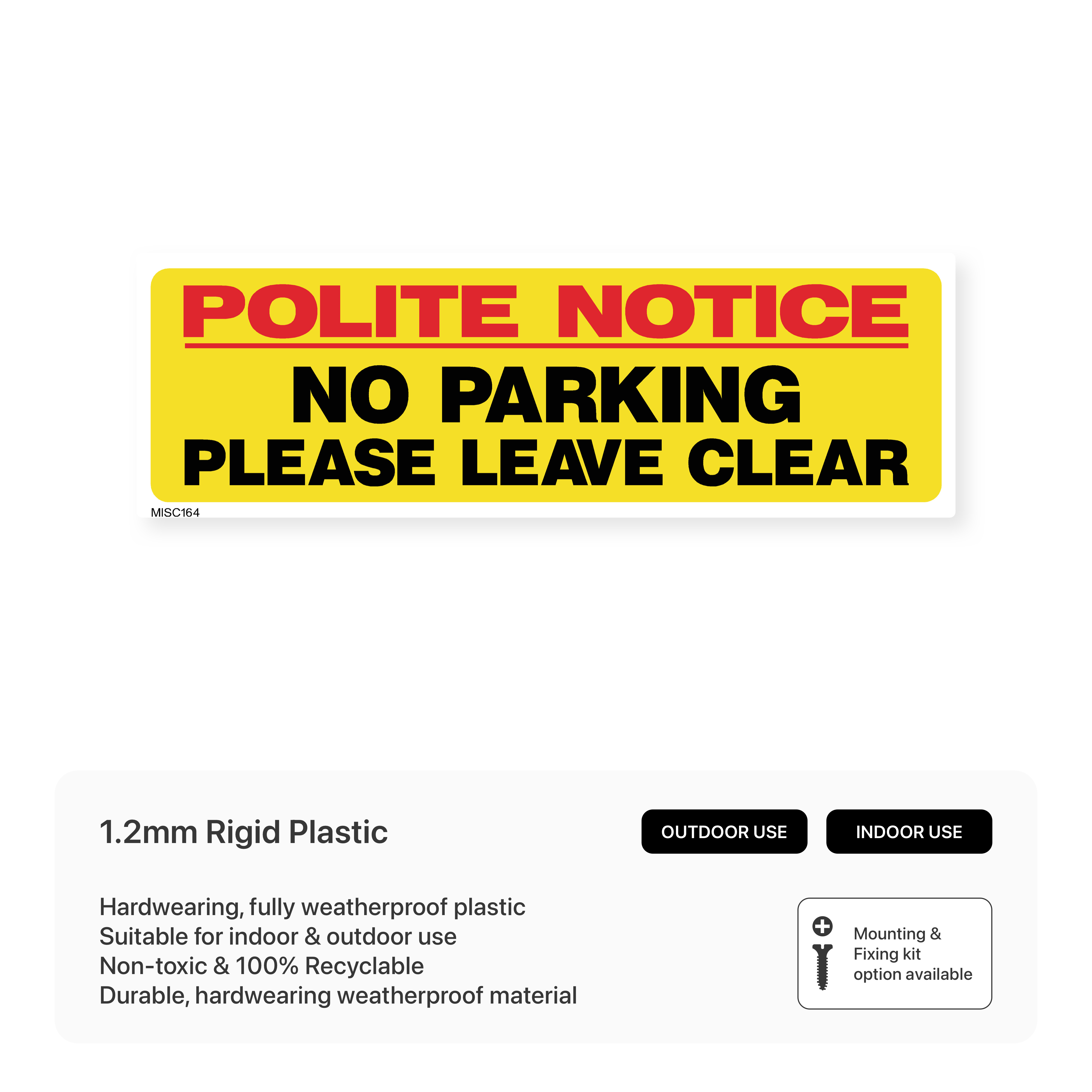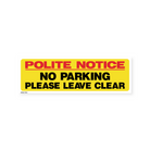 Politely request drivers not to park with our "Polite Notice - No Parking Please Leave Clear" signs. Perfect for areas where a friendly reminder is preferred.