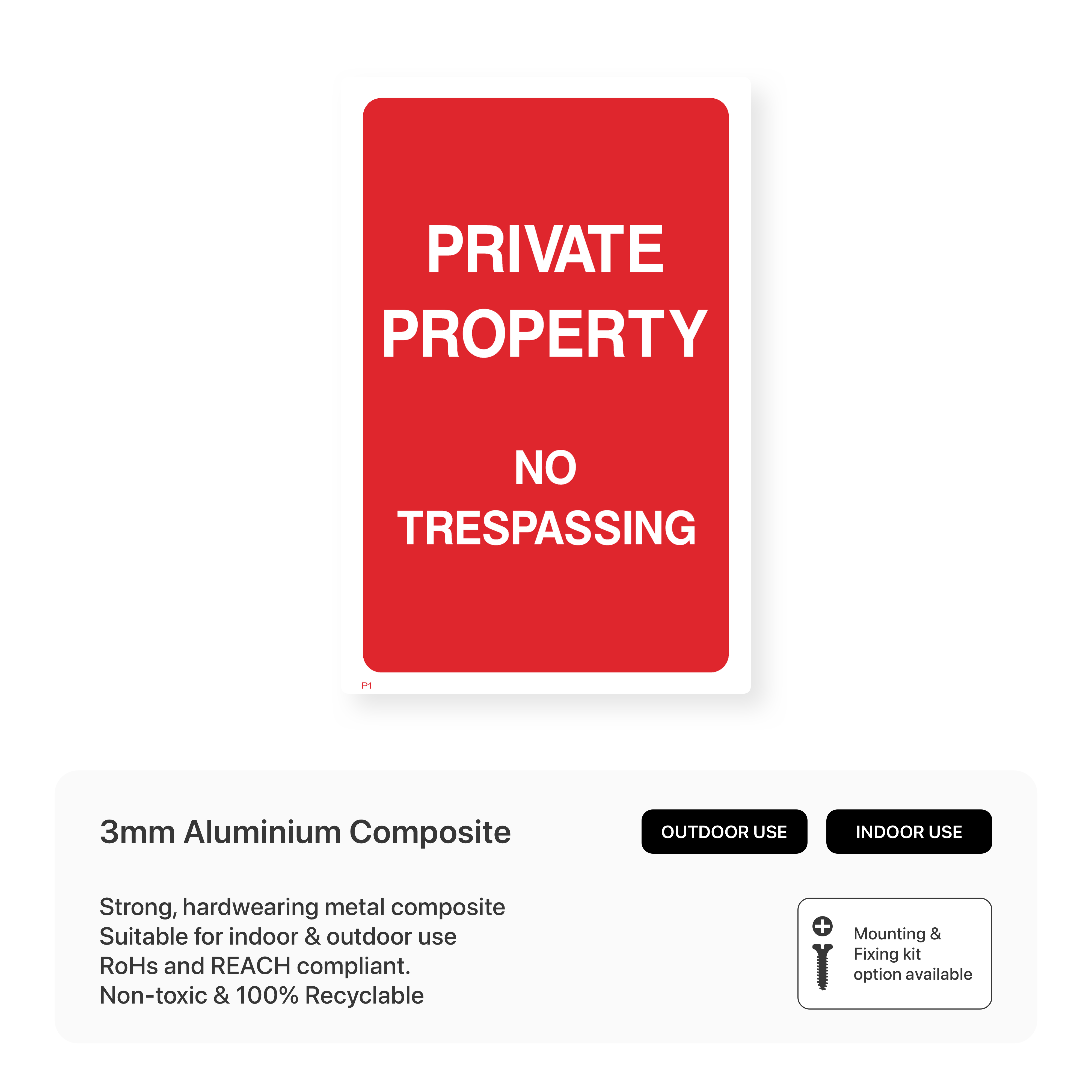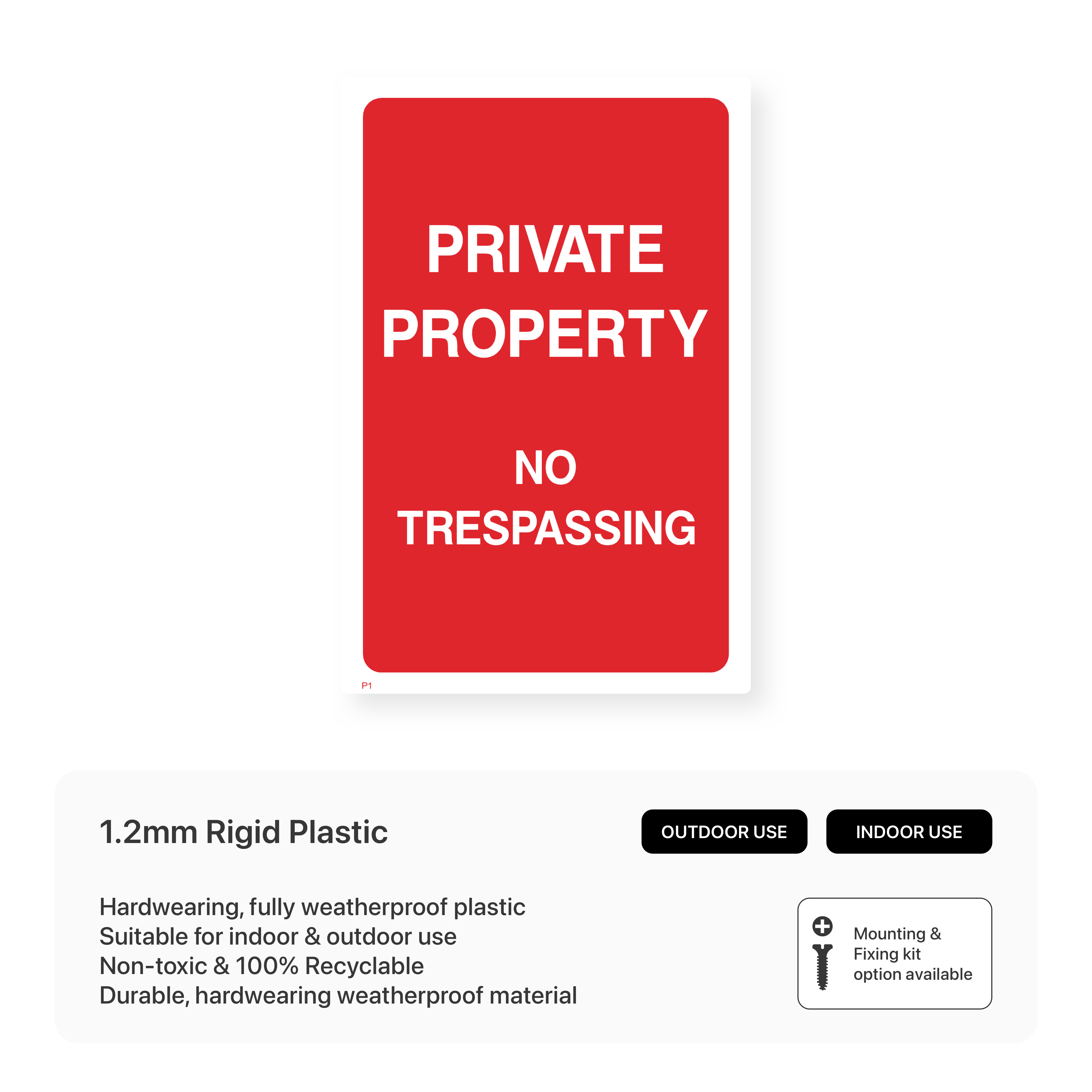 Protect your property with our clear and durable "Private Property - No Trespassing" sign. This sign clearly marks private areas and deters unauthorised entry. Available in various sizes and materials, this sign is a simple yet effective way to safeguard your premises.