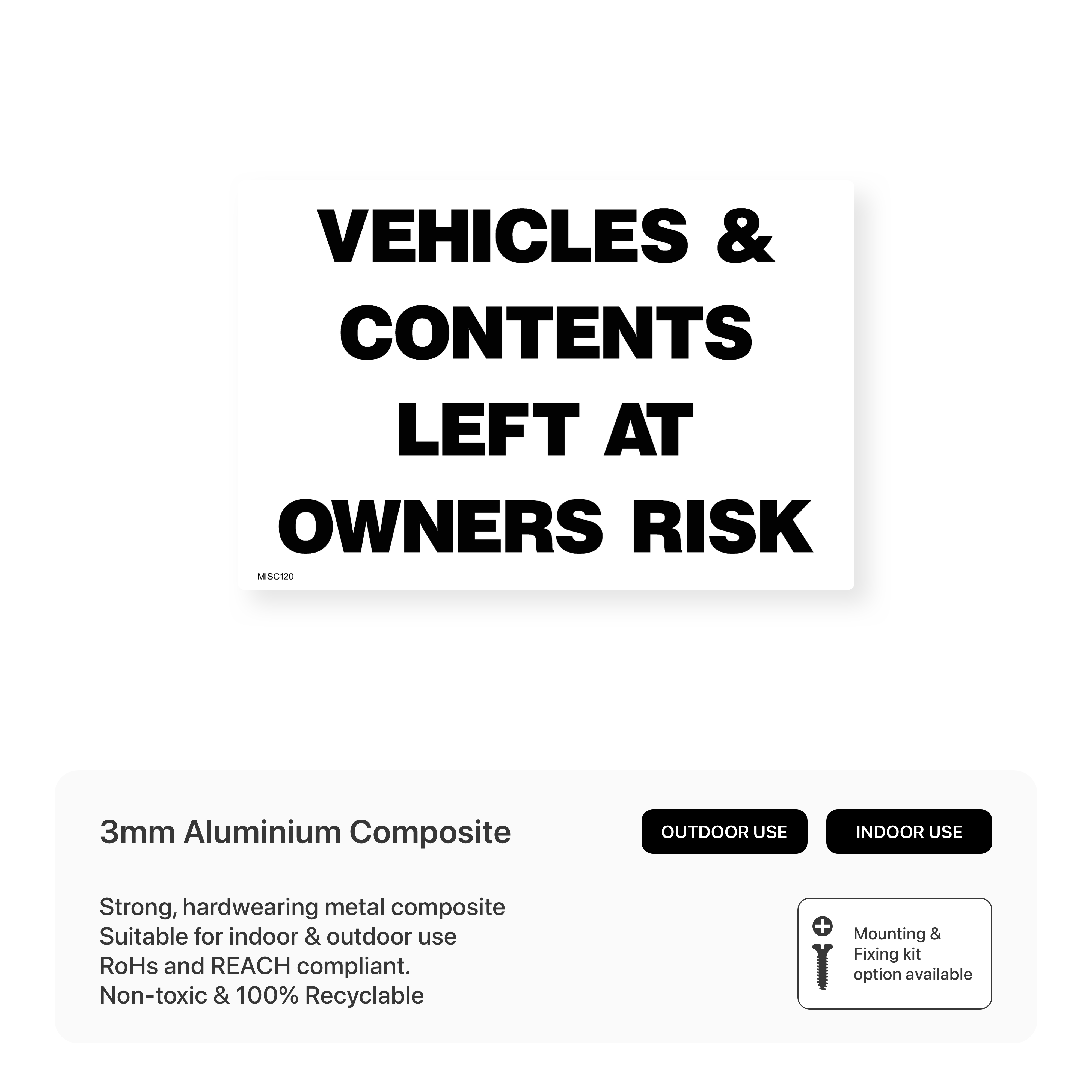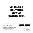 Inform drivers that they park at their own risk with our "Vehicles & Contents Left at Owner's Risk" signs. Clearly communicate that the management is not responsible for any loss or damage to vehicles or belongings. Available in various sizes and materials.