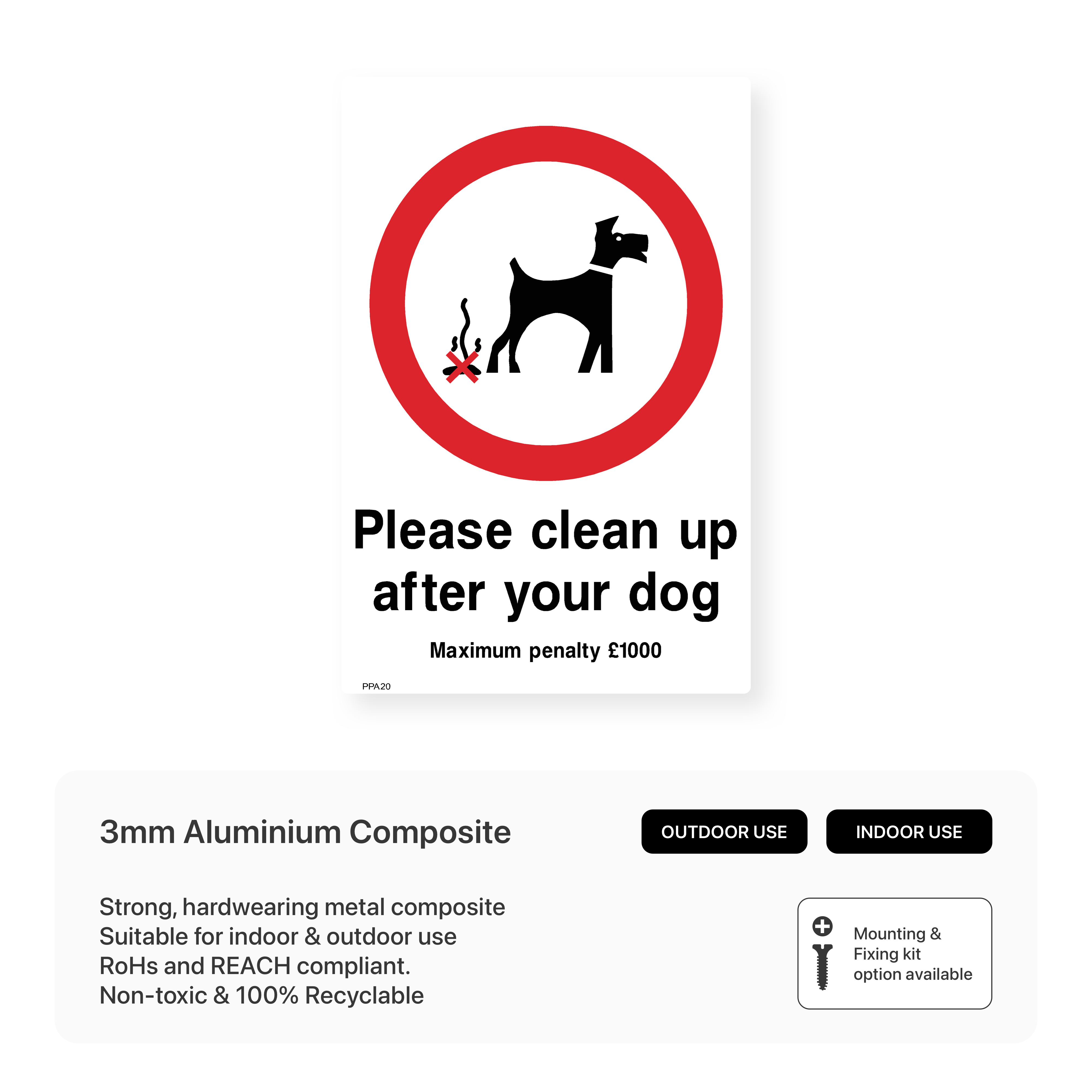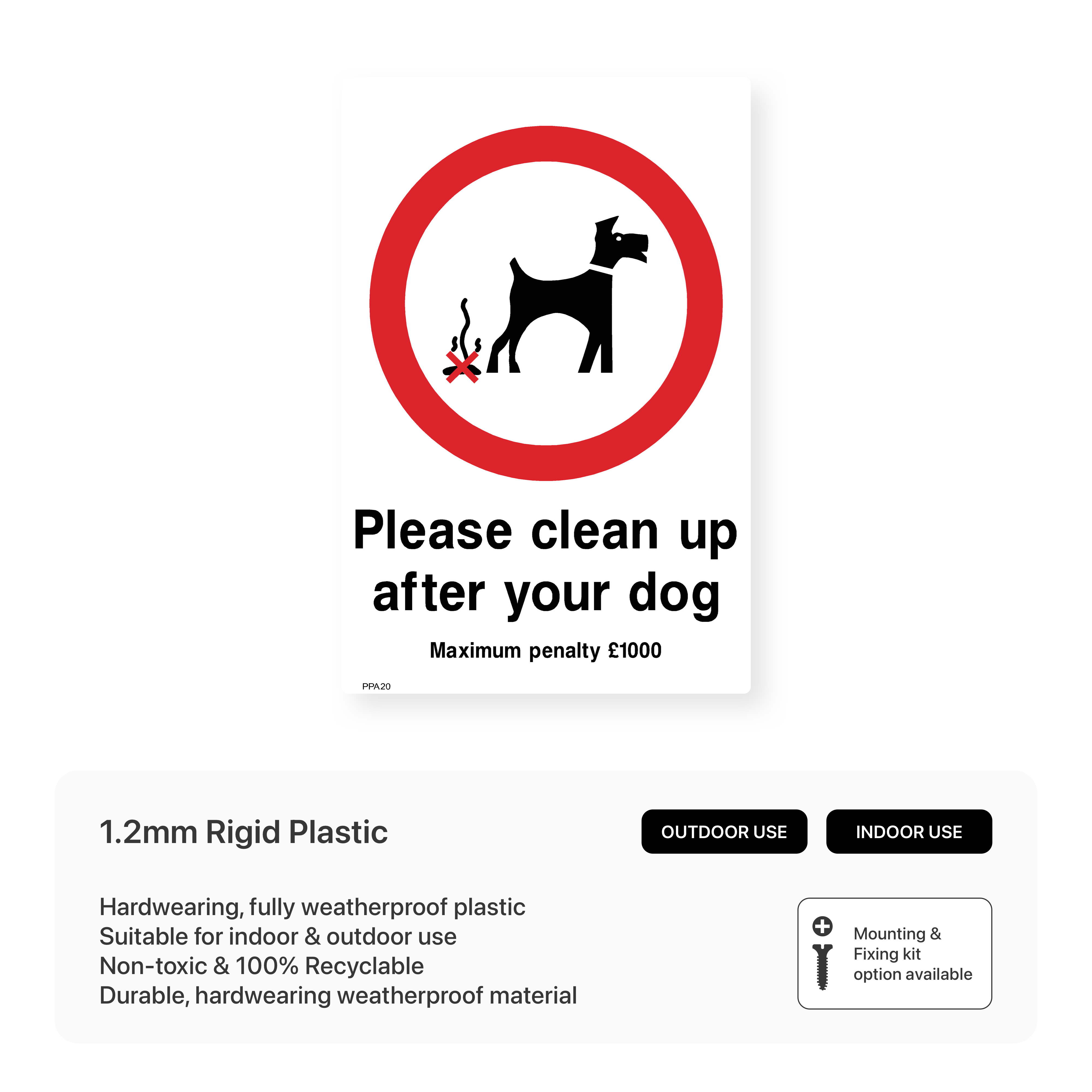 Reinforce your commitment to cleanliness with our "Please Clean Up After Your Dog" sign, highlighting a £1000 penalty. This sign acts as a strong deterrent against dog fouling in public areas.