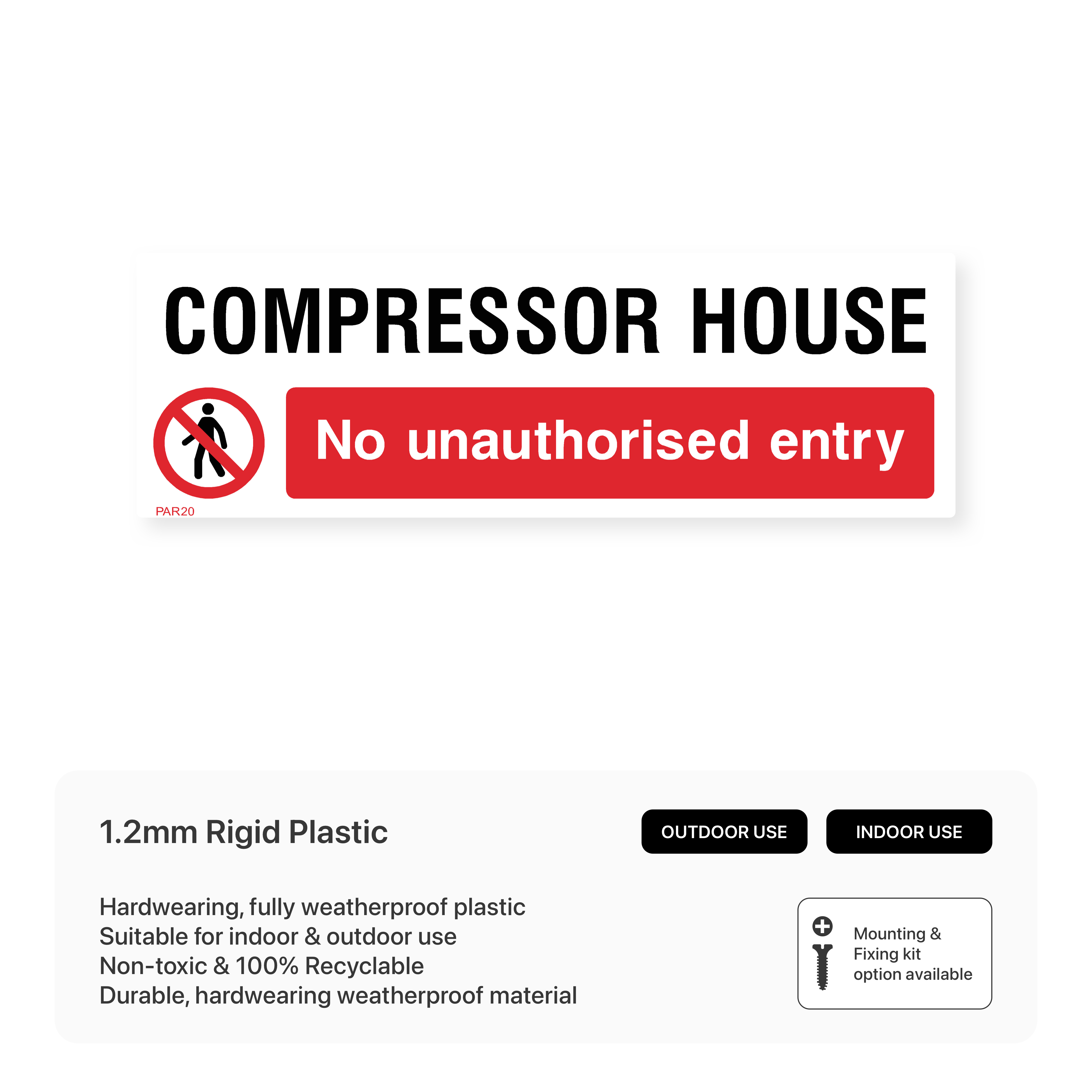 Restrict access to the compressor house and maintain safety with our "COMPRESSOR HOUSE - No Unauthorised Entry" sign. This sign clearly indicates that entry is limited to authorised personnel only, preventing accidents and ensuring proper operation of the equipment. Choose from various sizes and materials to suit your specific needs.
