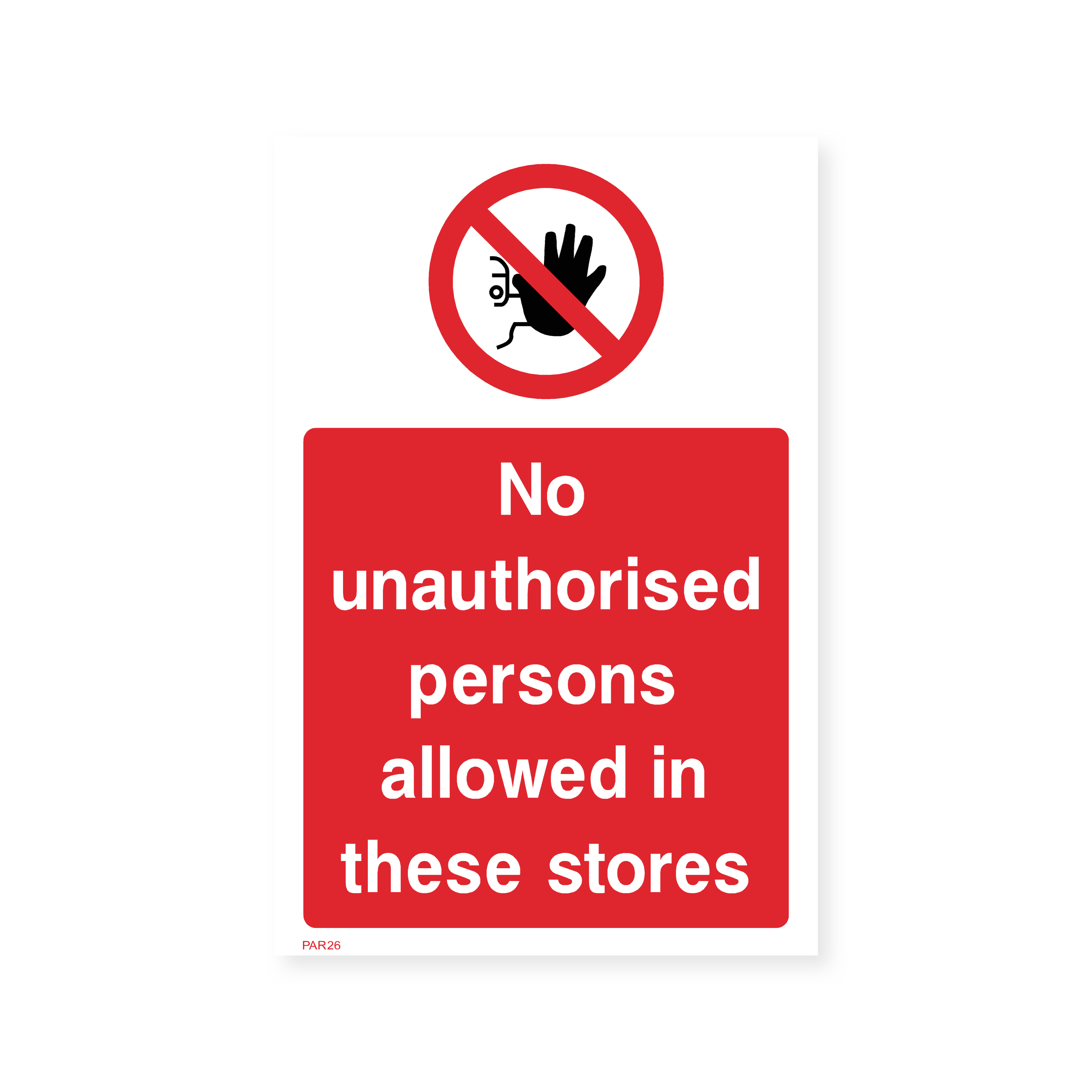 Protect your inventory and restrict access to storage areas with our "No Unauthorised Persons Allowed in These Stores" portrait sign. This sign clearly communicates that entry is limited to authorised personnel only, preventing theft and ensuring the security of your goods. Choose from various sizes and materials to suit your specific needs.
