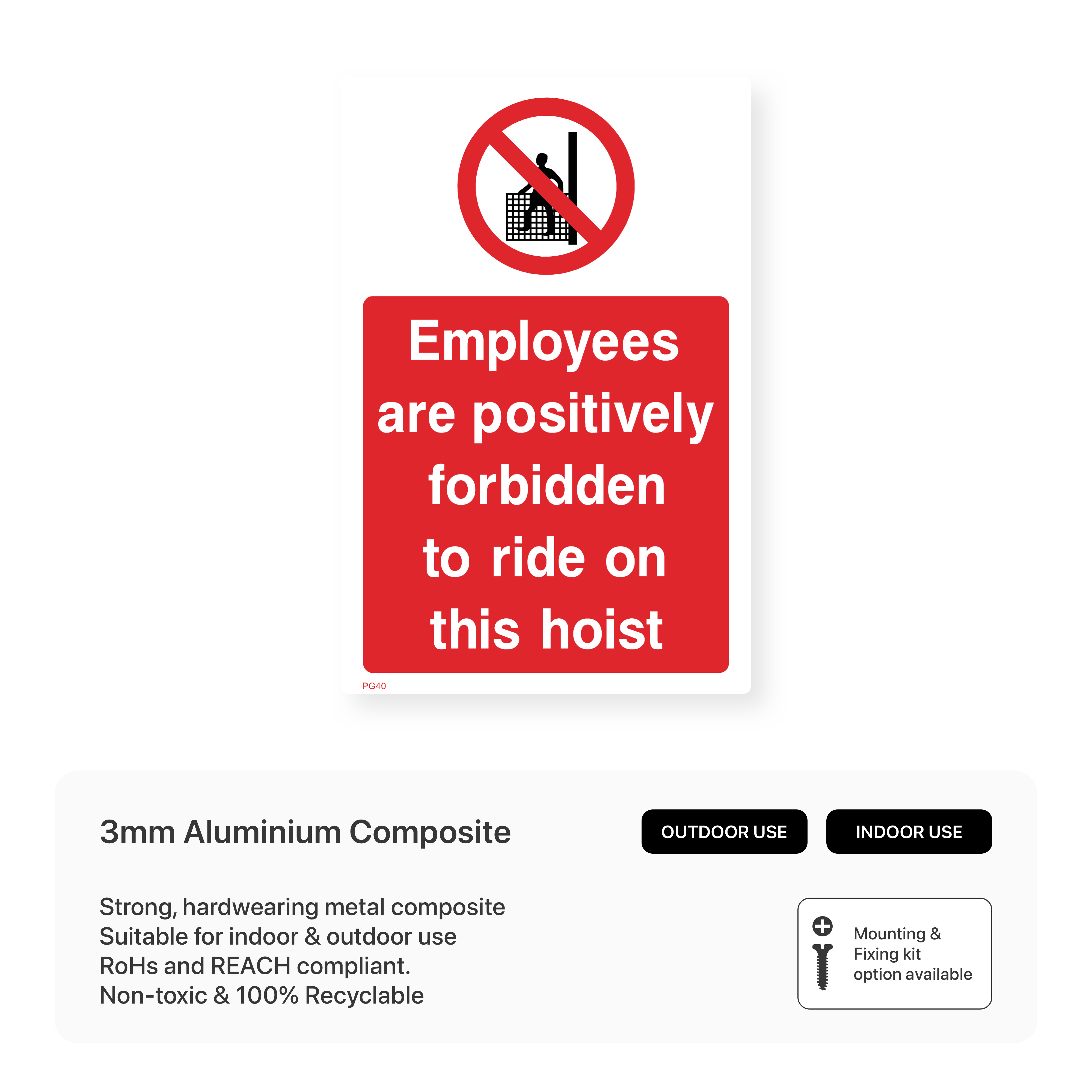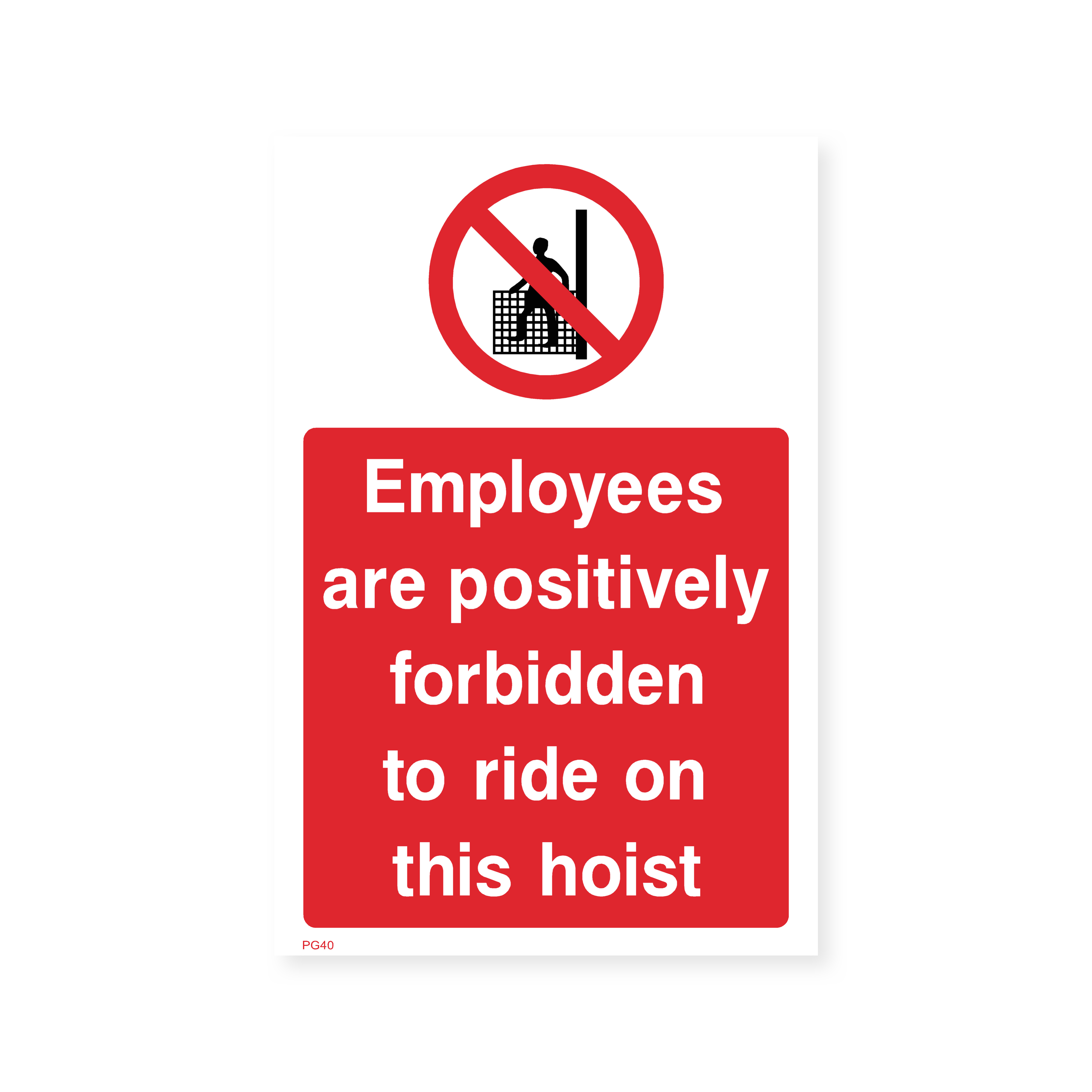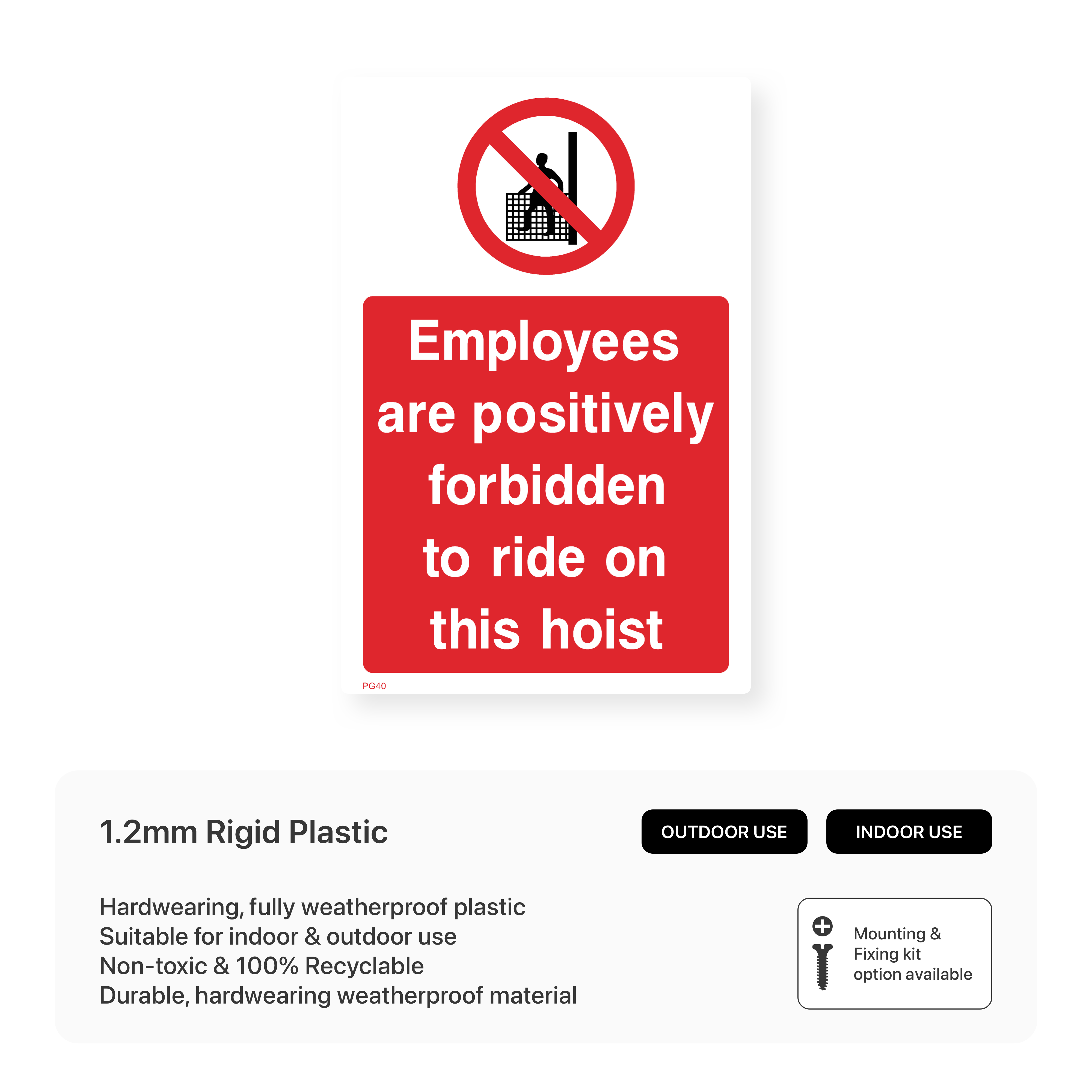 Prioritise employee safety with our "Employees are Positively Forbidden to Ride on This Hoist" portrait sign. This sign clearly prohibits unauthorised use of hoists, preventing accidents and injuries. Available in various sizes and materials, it is suitable for construction sites, warehouses, and other industrial settings where hoists are used.