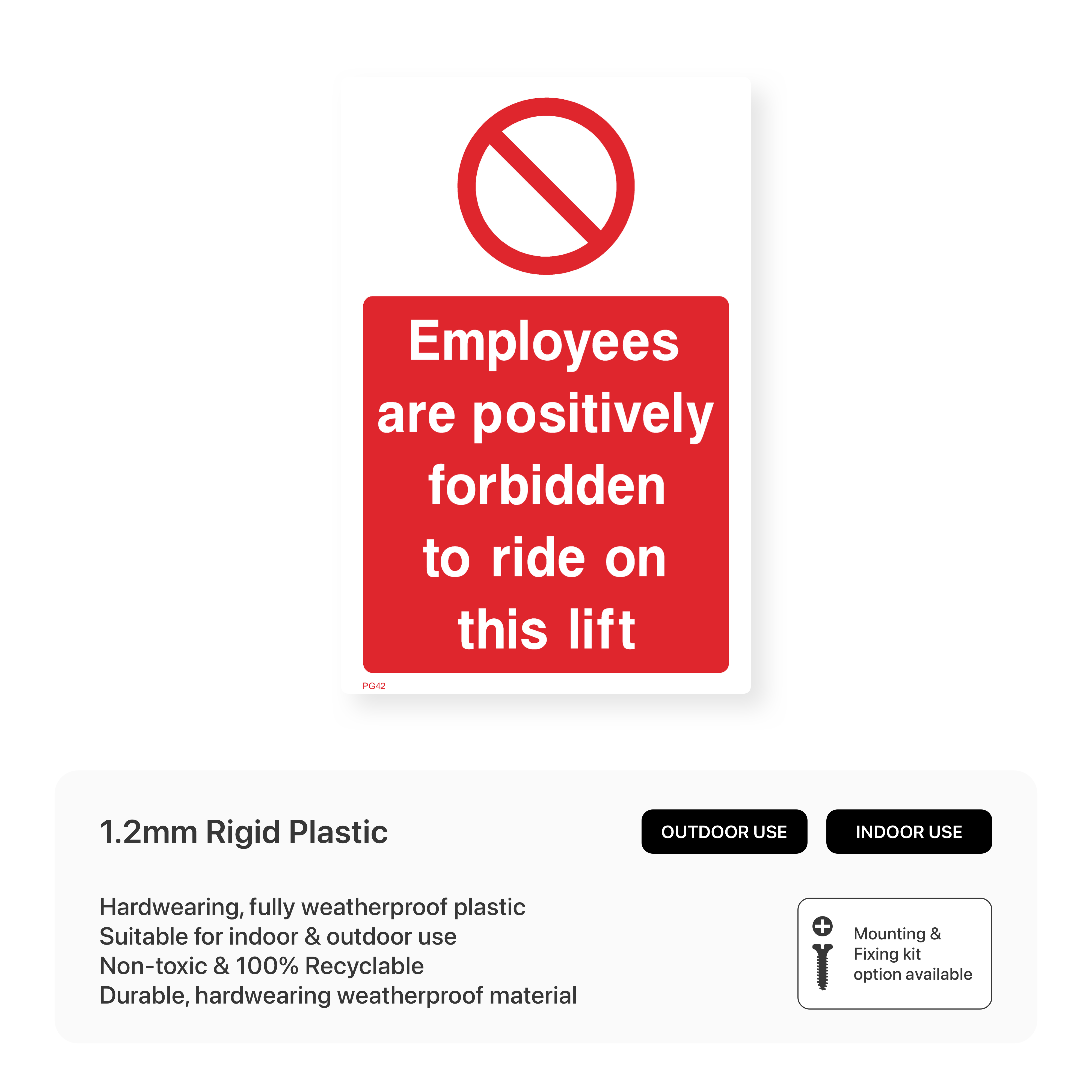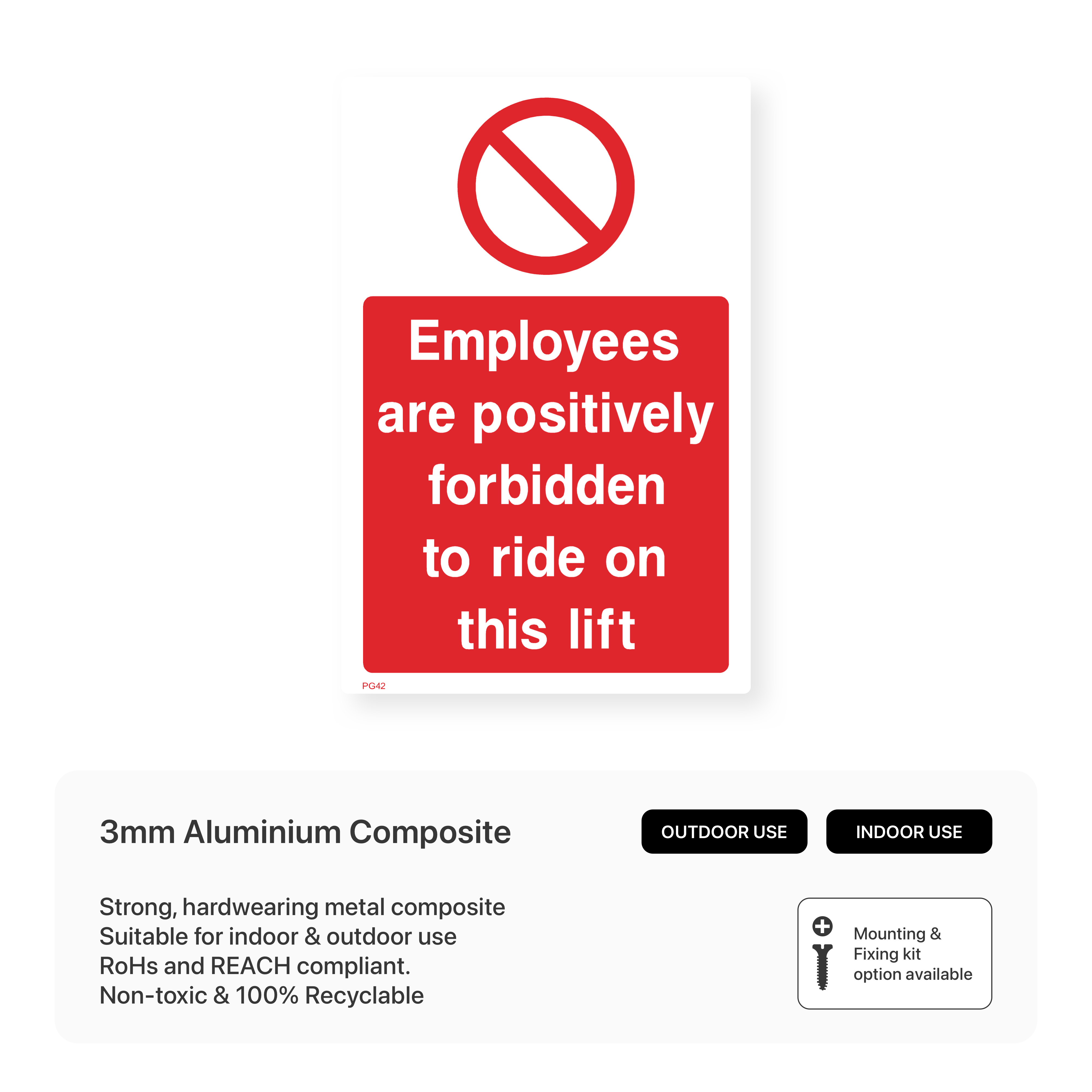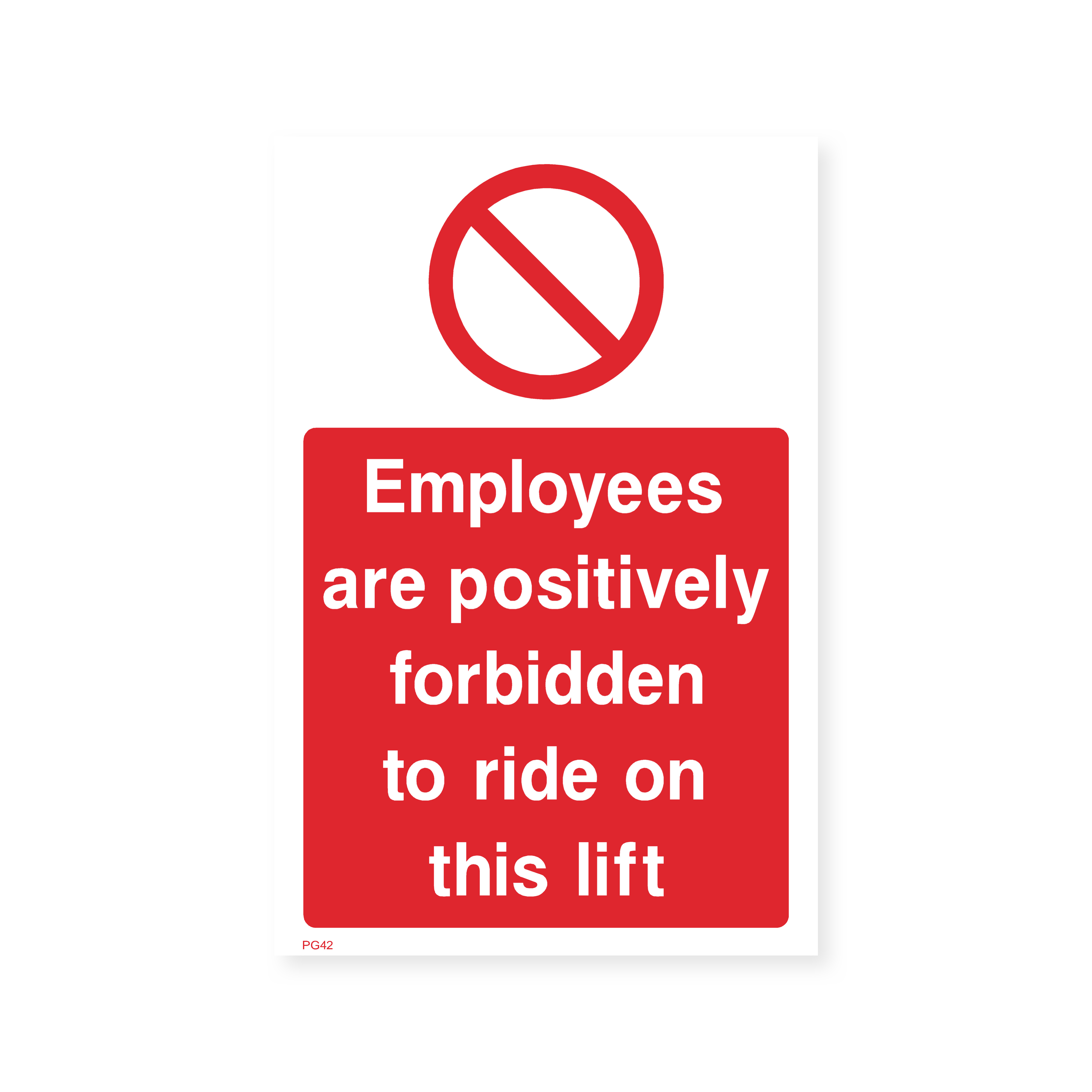 Ensure safety in your workplace with our "Employees are Positively Forbidden to Ride This Lift" portrait sign. Designed for optimal visibility, this sign clearly prohibits unauthorised use of lifts, preventing accidents and ensuring proper operation. Available in various sizes and materials, it is suitable for commercial and industrial buildings.