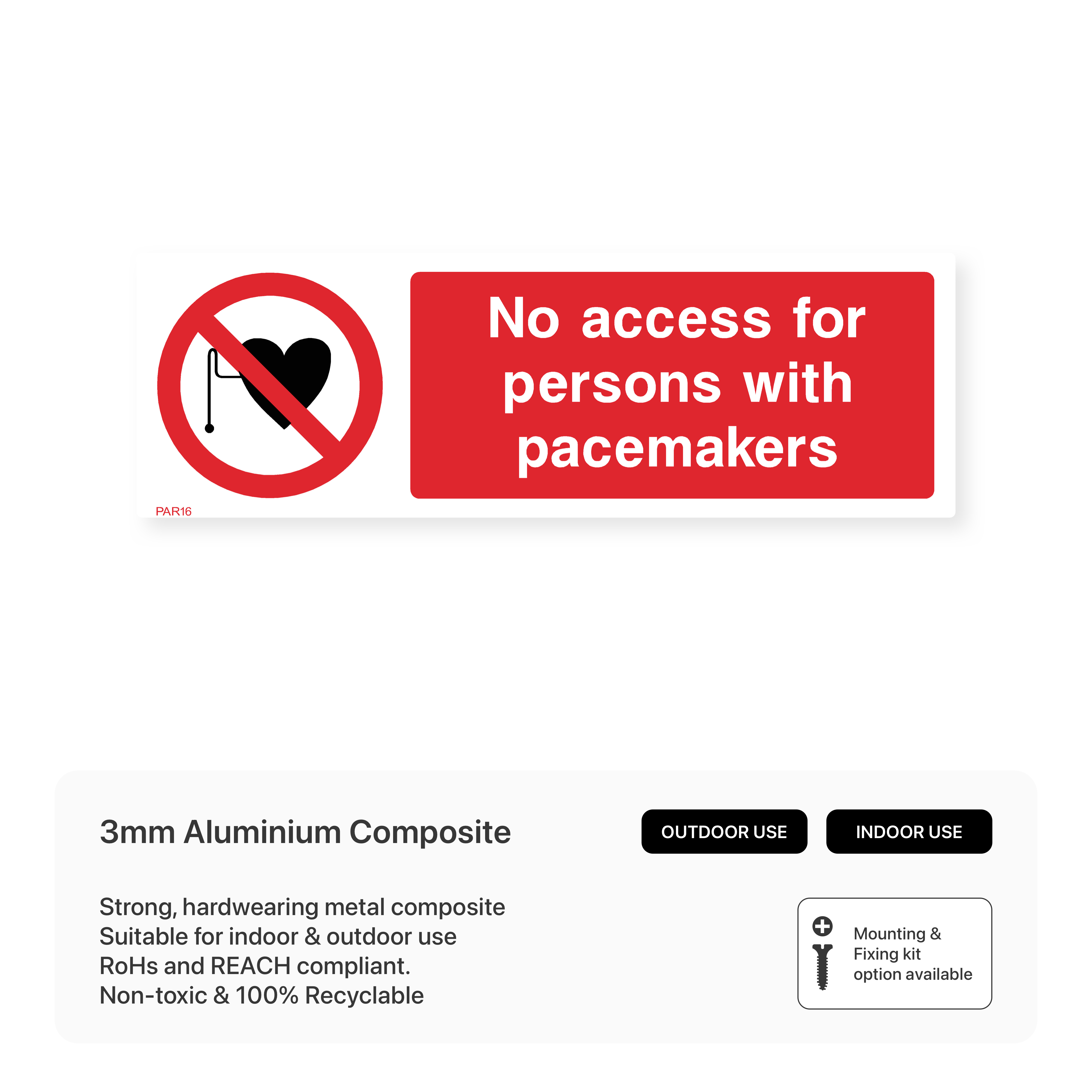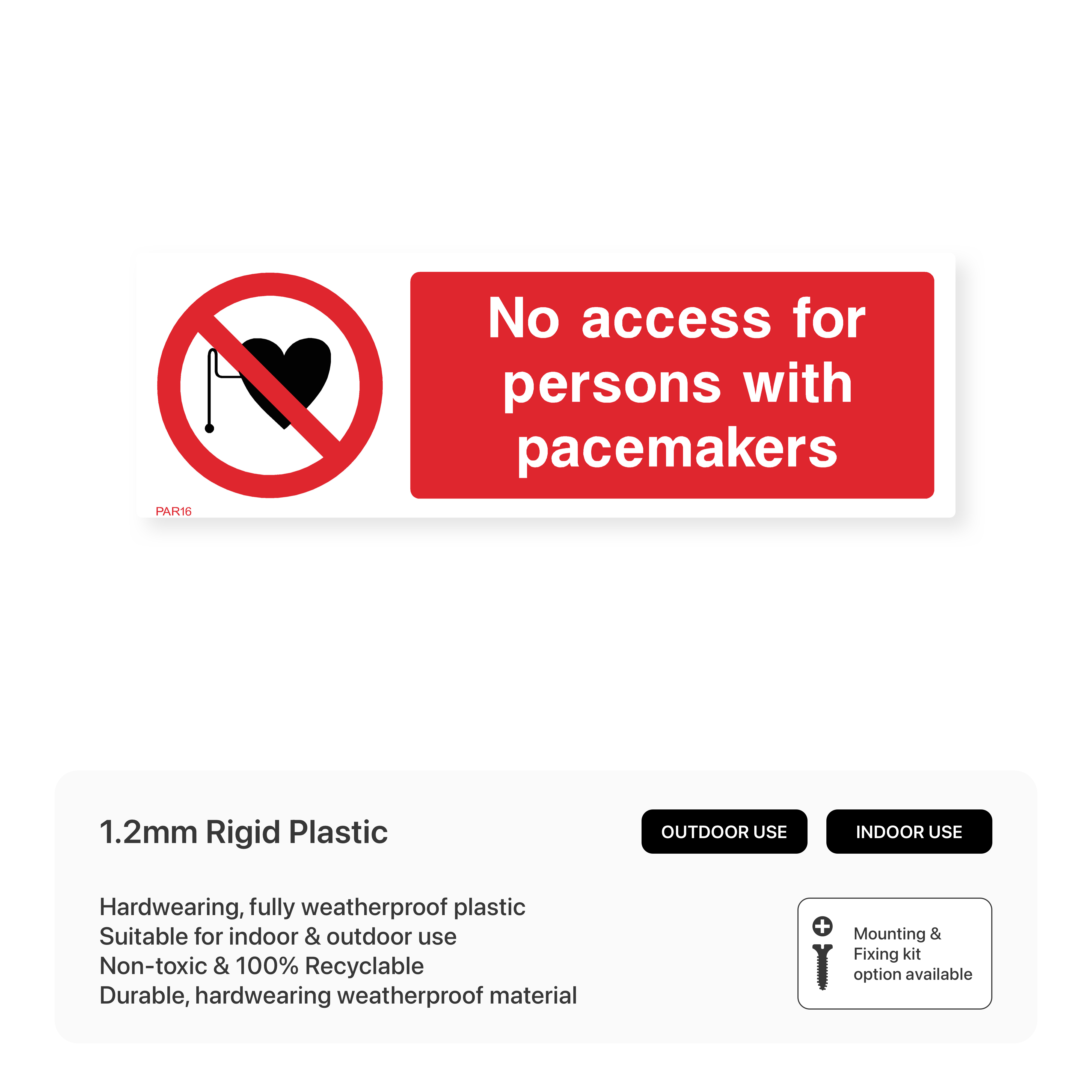 Prioritise safety in your workplace with our "No Access for Persons with Pacemakers" sign. This sign clearly warns individuals with pacemakers of potential electromagnetic interference in designated areas. Choose from various sizes and materials to ensure the well-being of your employees and visitors.
