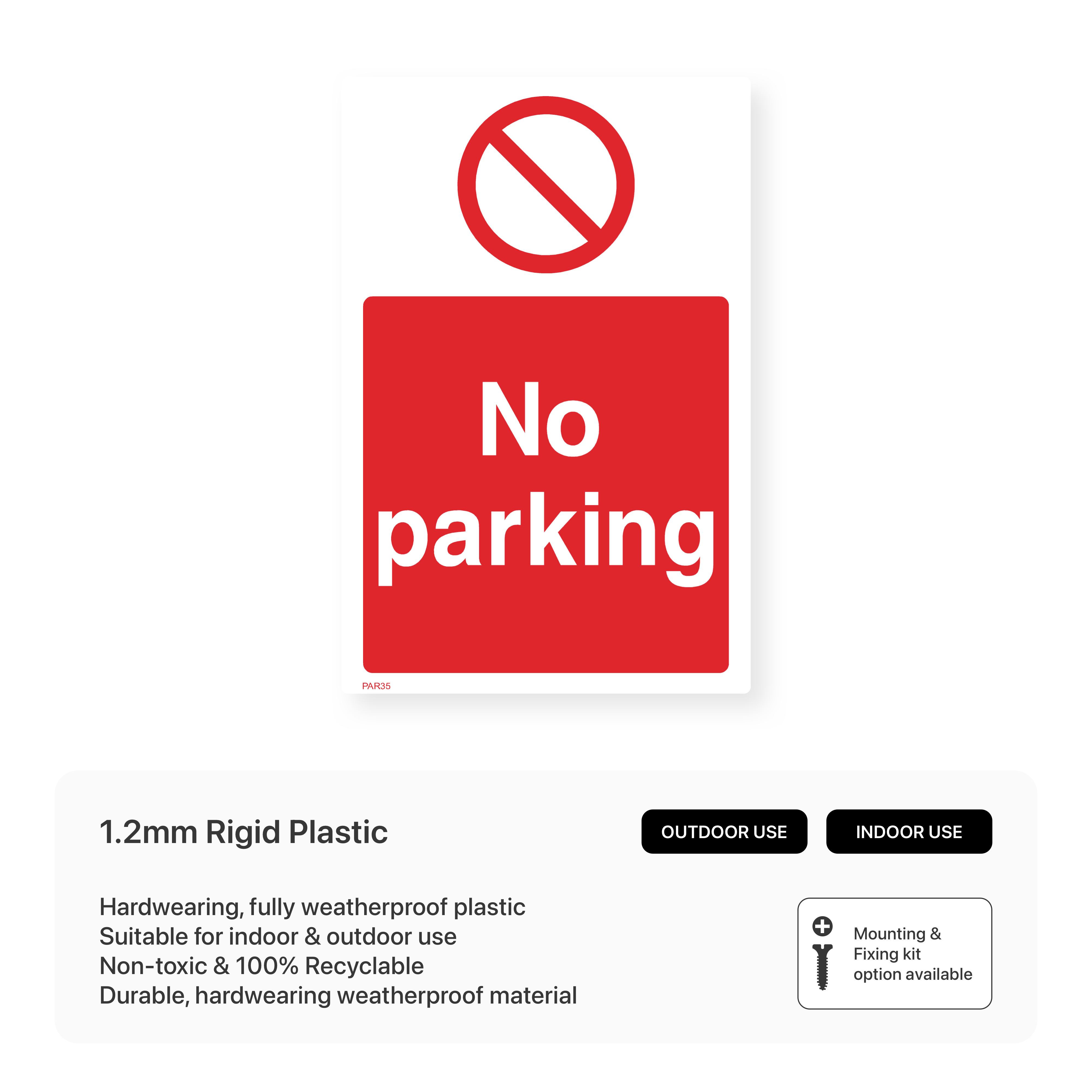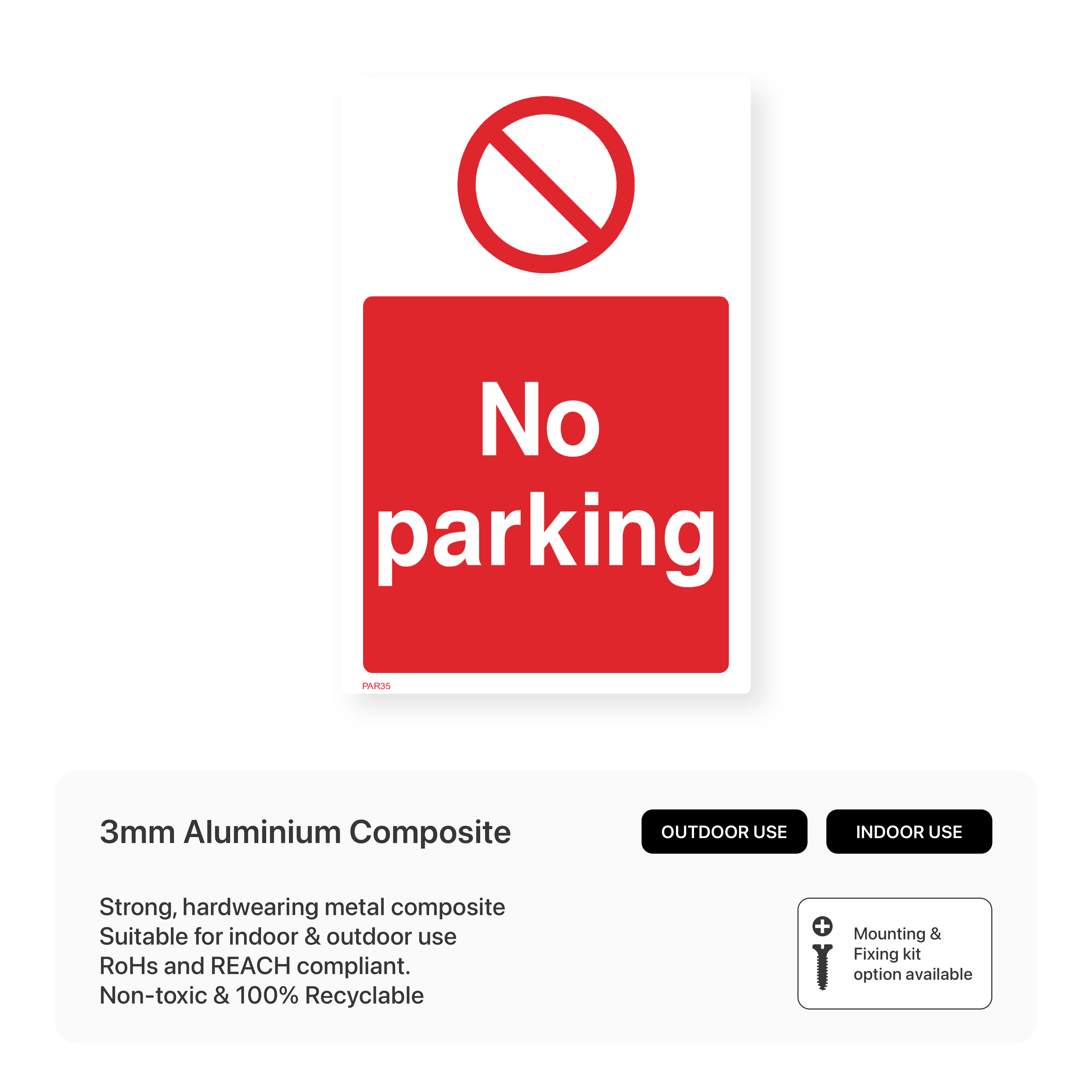 Clearly communicate parking restrictions with our "No Parking" portrait sign. This sign effectively deters unauthorised parking and helps maintain order in your designated areas. Choose from various sizes and materials to suit your specific needs.