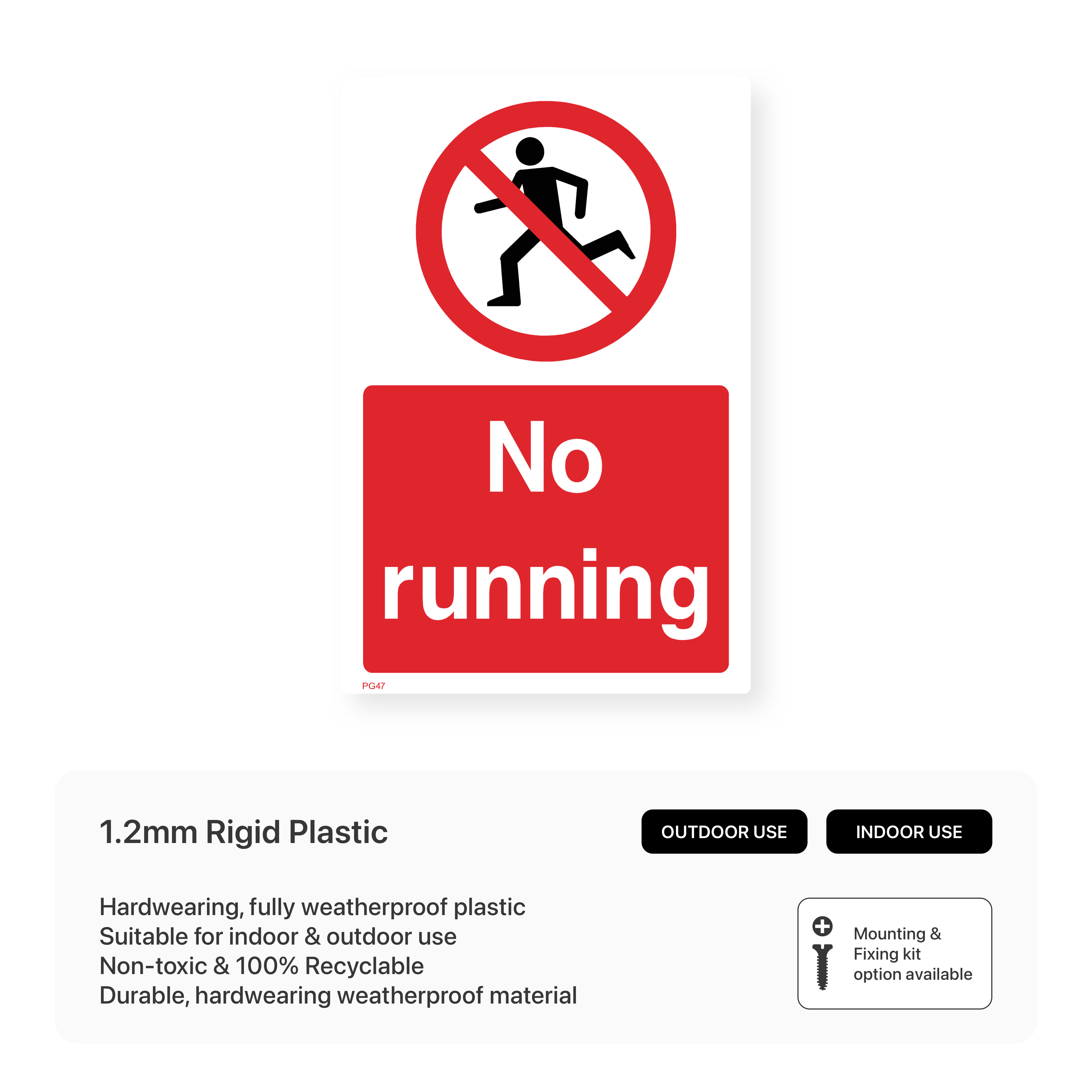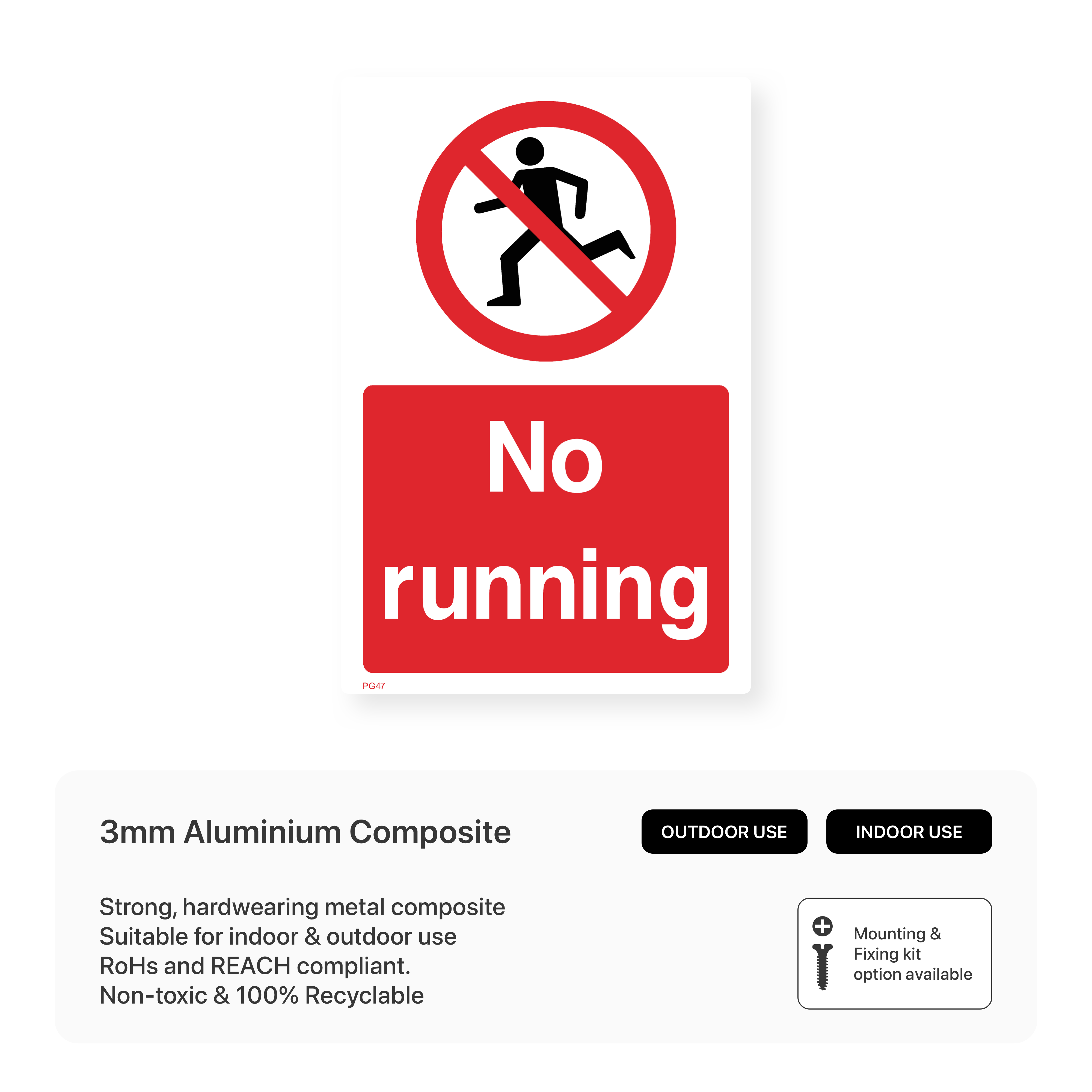 Prevent accidents and maintain order with our "No Running" portrait sign. Designed for optimal visibility, this sign clearly communicates the prohibition of running in designated areas, reducing the risk of collisions and injuries. Available in various sizes and materials, it is suitable for workplaces, schools, and other areas where running may be hazardous.