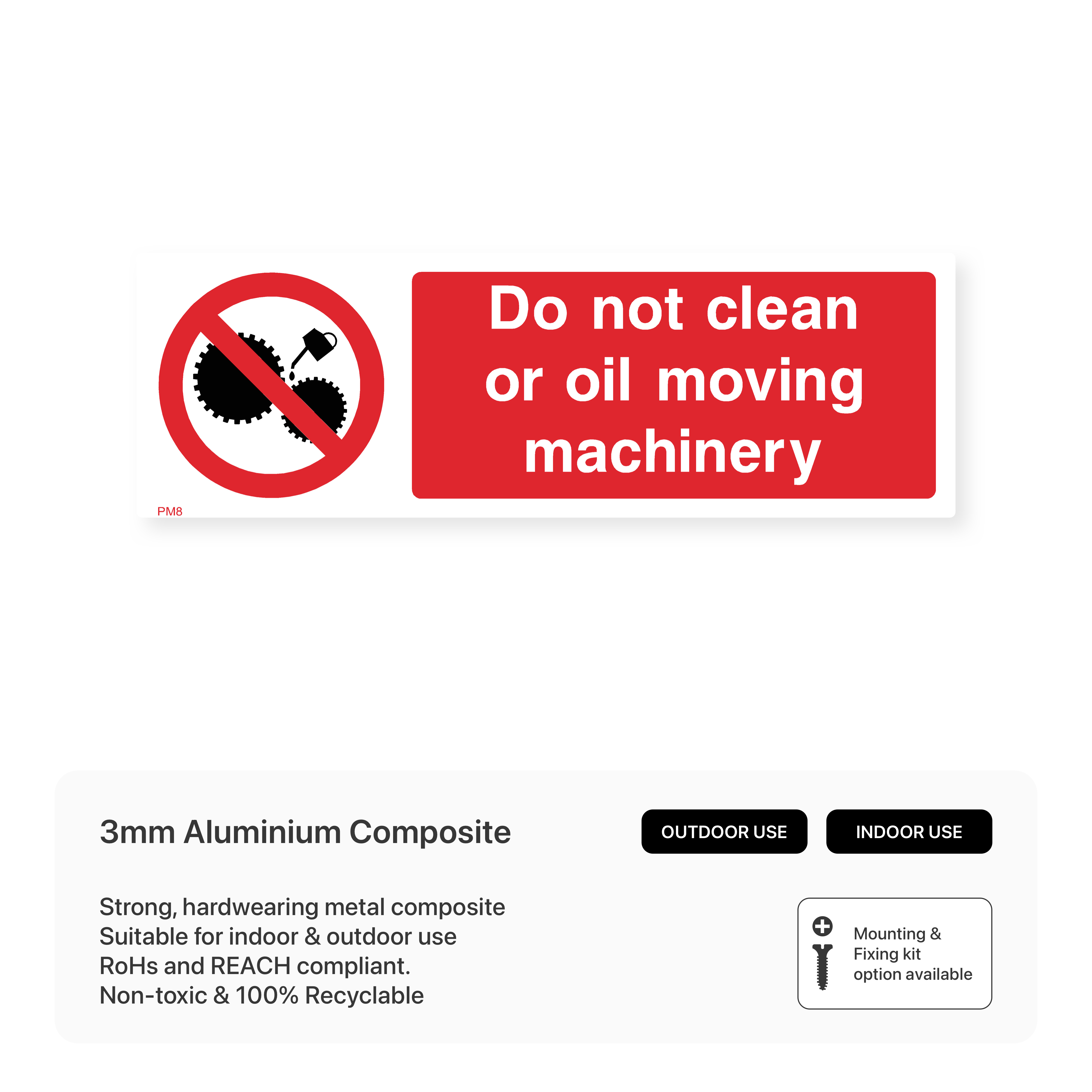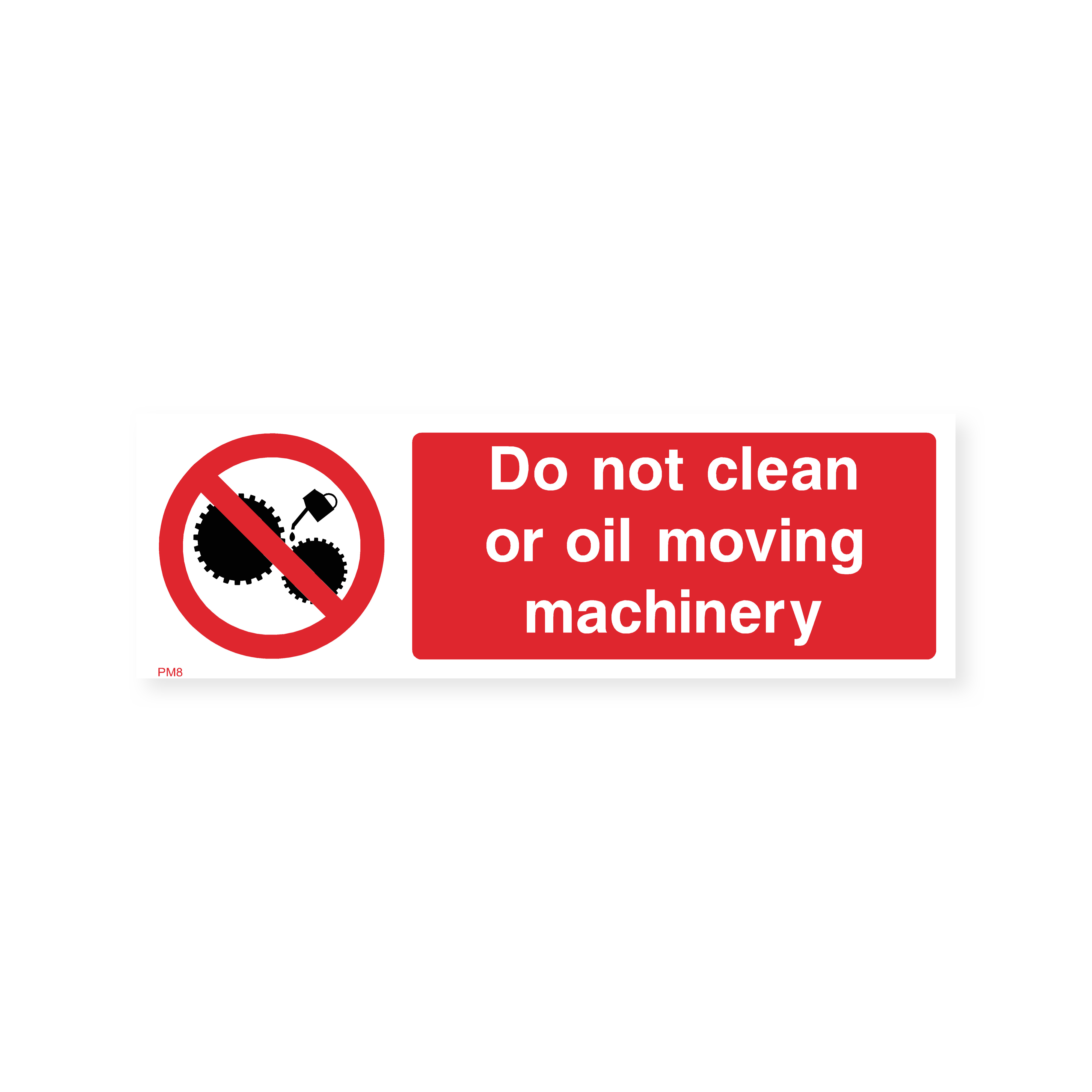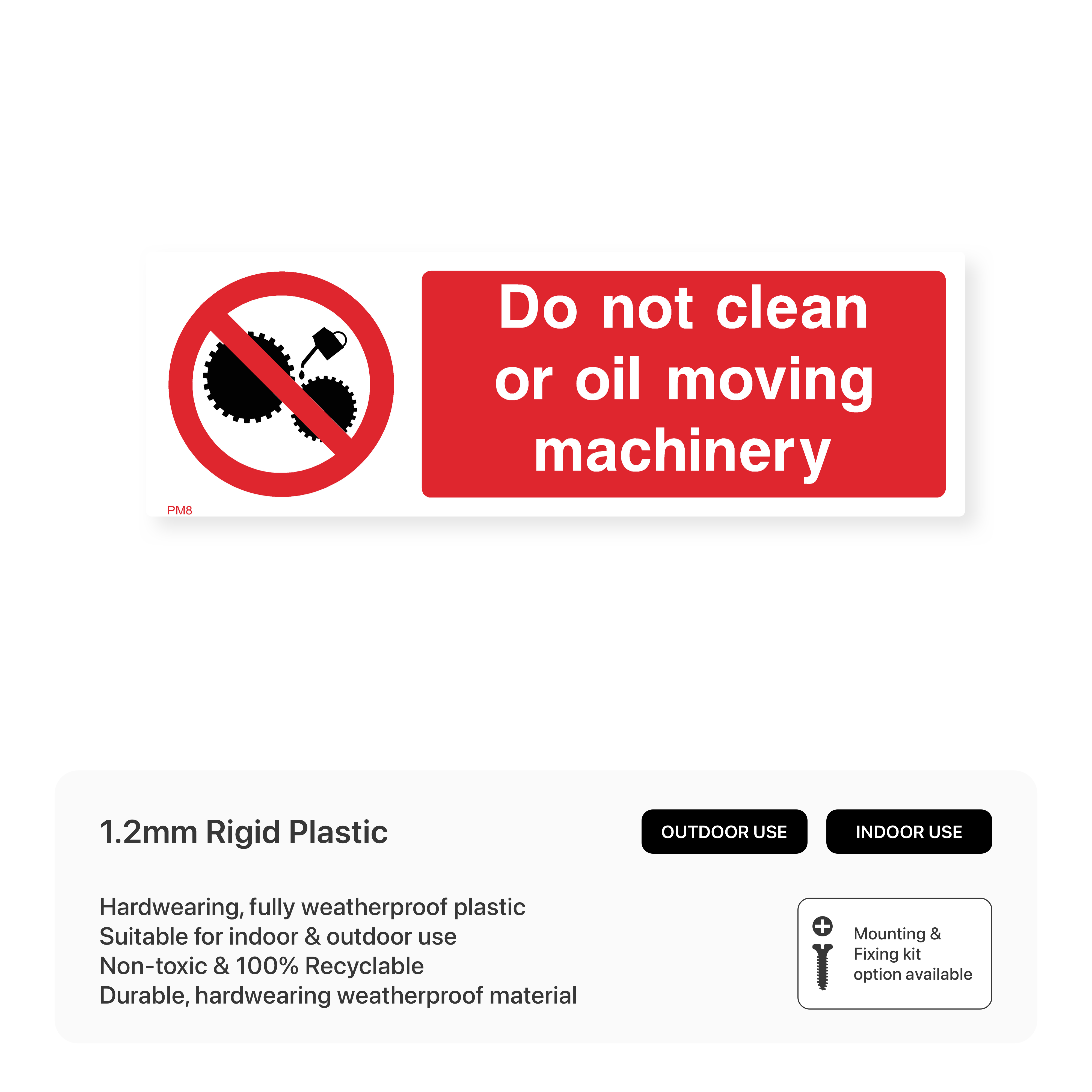 Prioritise safety and prevent accidents with our "Do Not Clean or Oil Moving Machinery" sign. This sign clearly communicates the dangers of cleaning or oiling machinery while it is in motion. Choose from various sizes and materials to suit your specific needs.