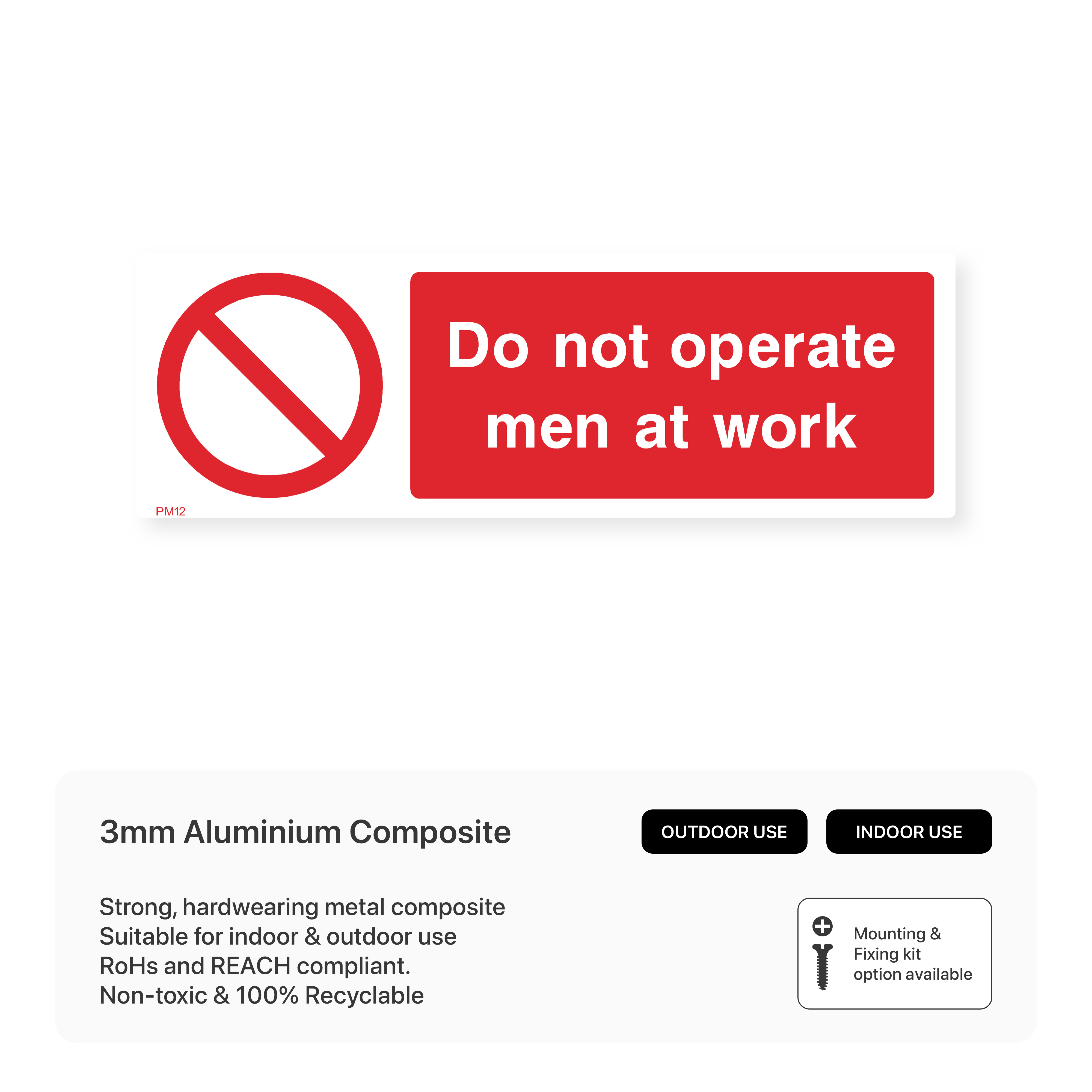 Prevent accidents during maintenance or repairs with our "Do Not Operate - Men at Work" sign. This sign clearly communicates that machinery is being worked on and should not be operated, ensuring the safety of maintenance personnel. Choose from various sizes and materials to suit your specific needs.