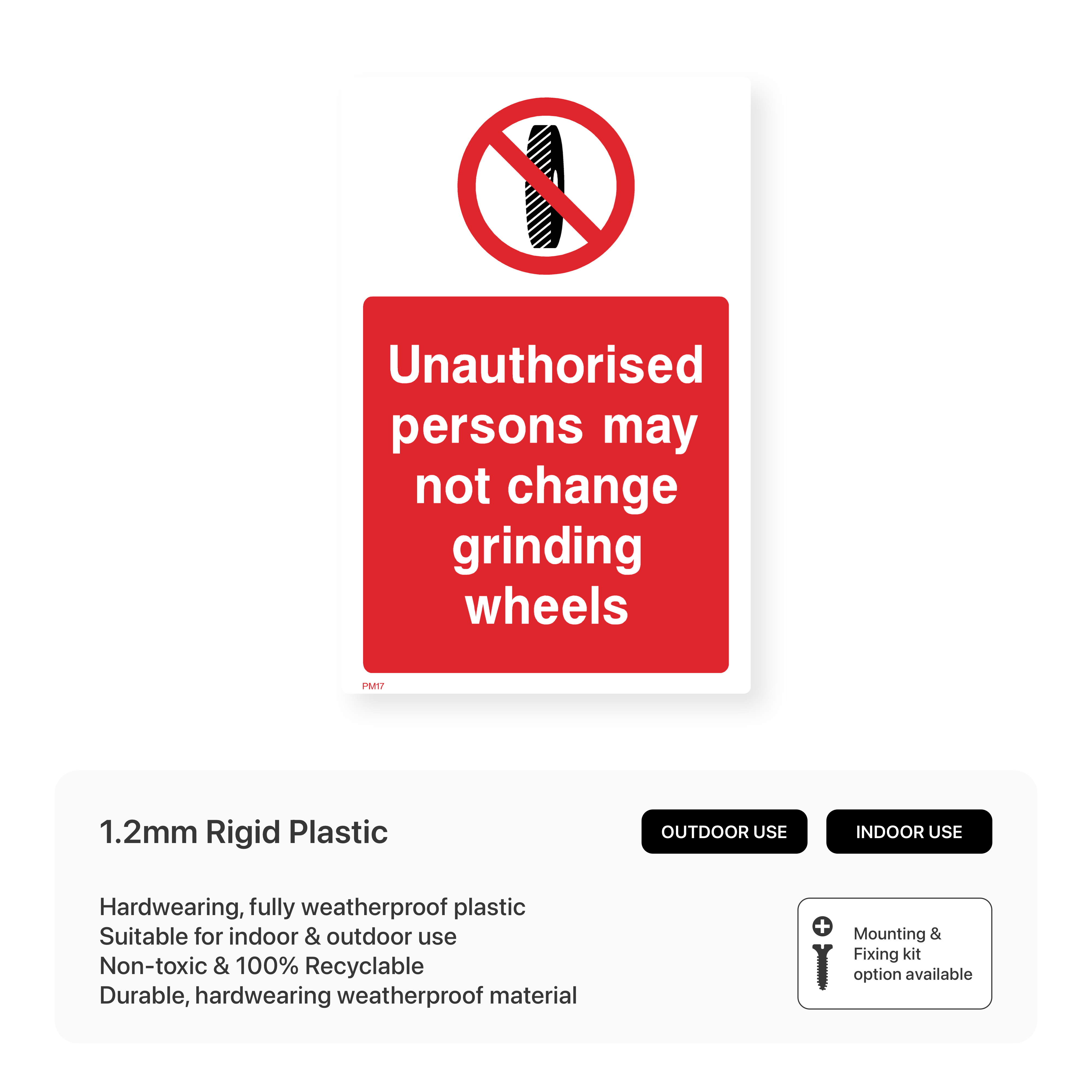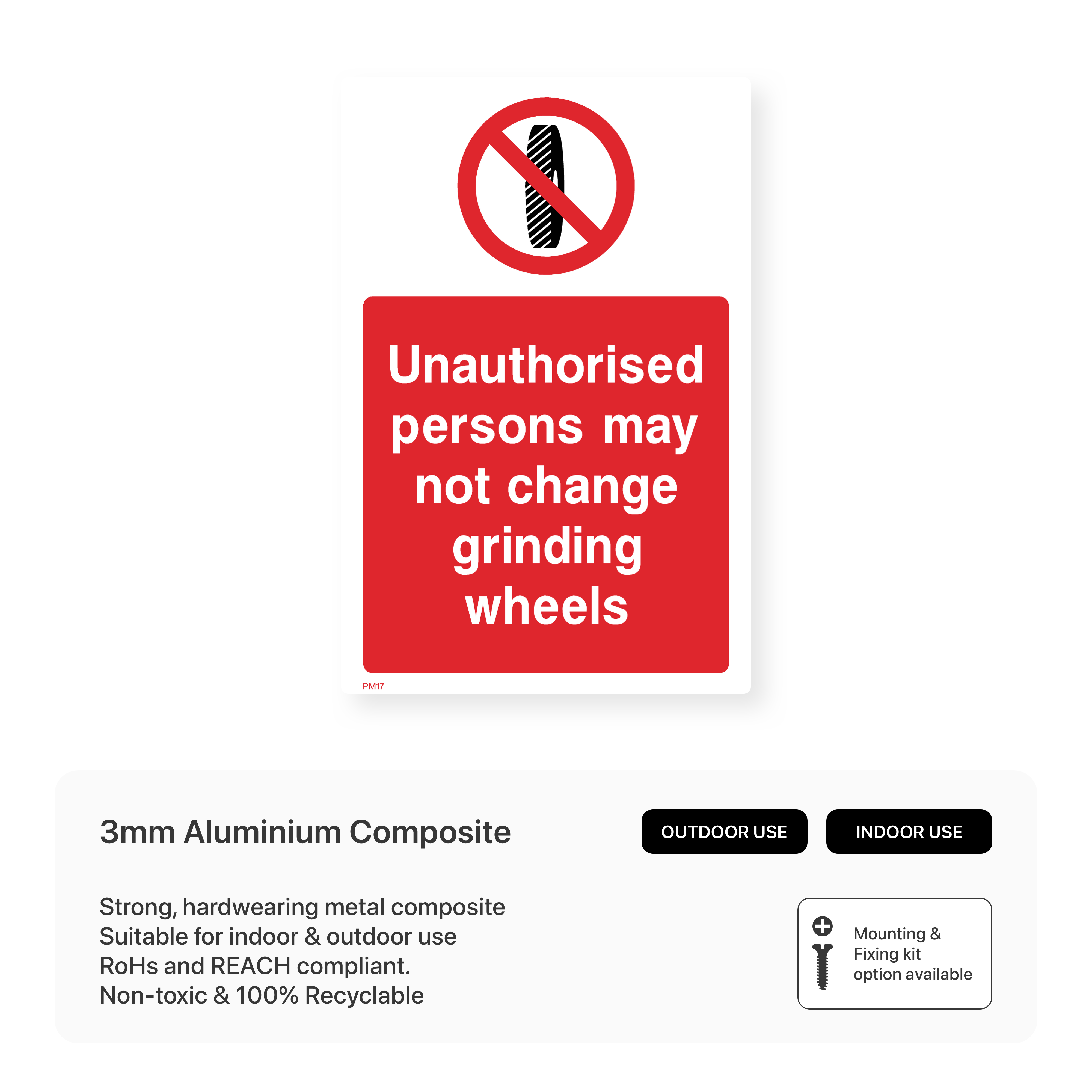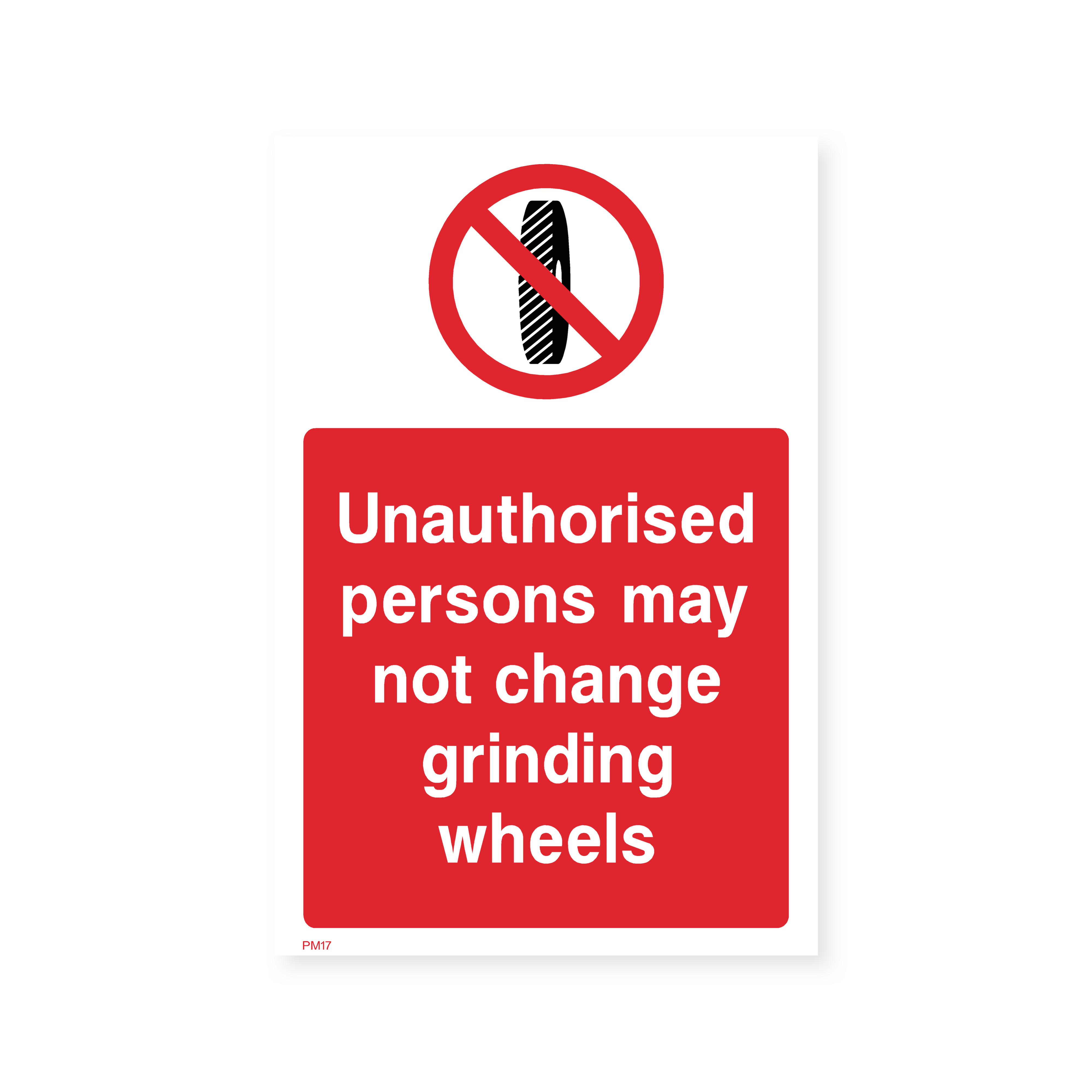 Ensure proper maintenance and prevent accidents with our "Unauthorised Persons May Not Change Grinding Wheels" portrait sign. This sign clearly communicates that only authorised personnel are allowed to change grinding wheels, reducing the risk of improper installation and potential hazards.