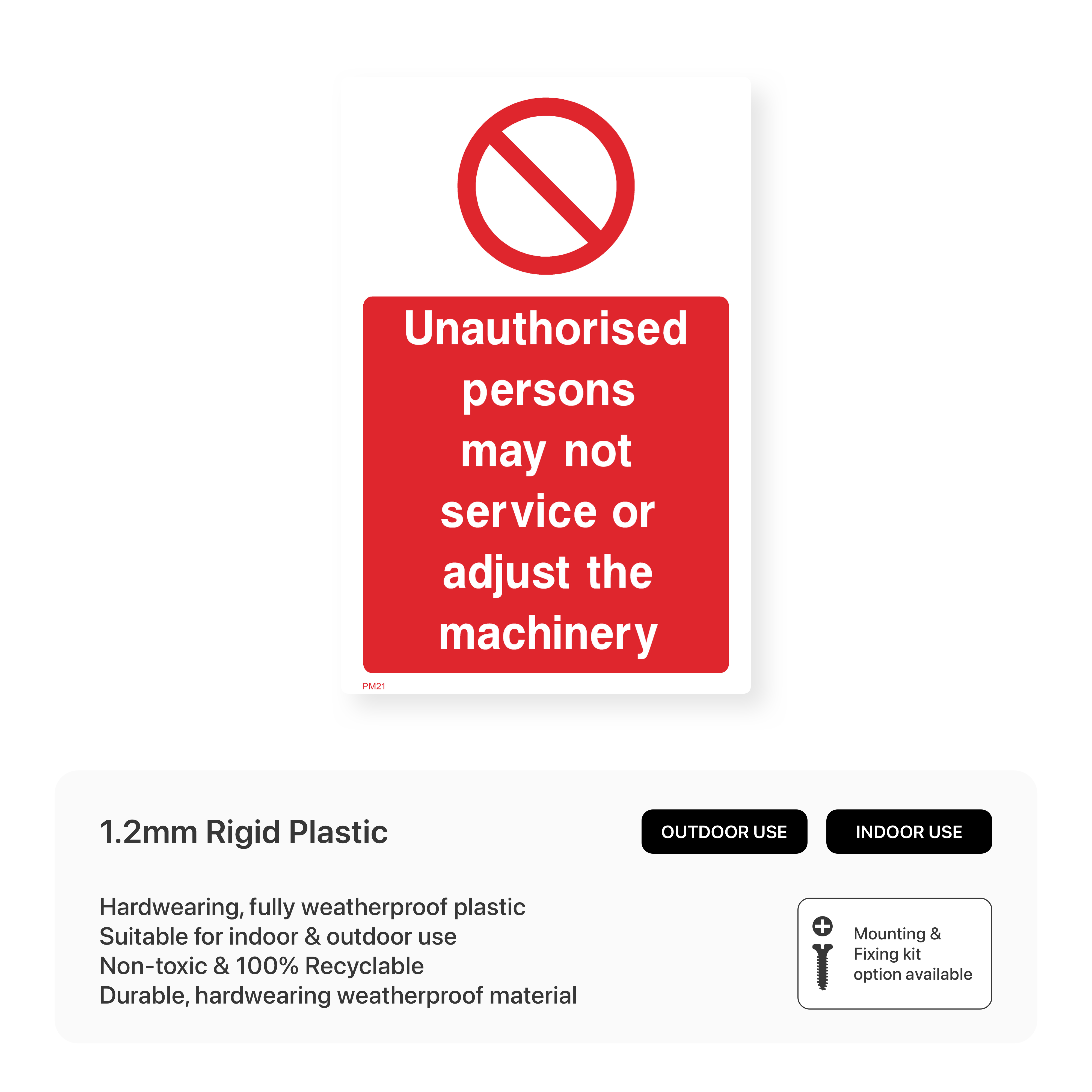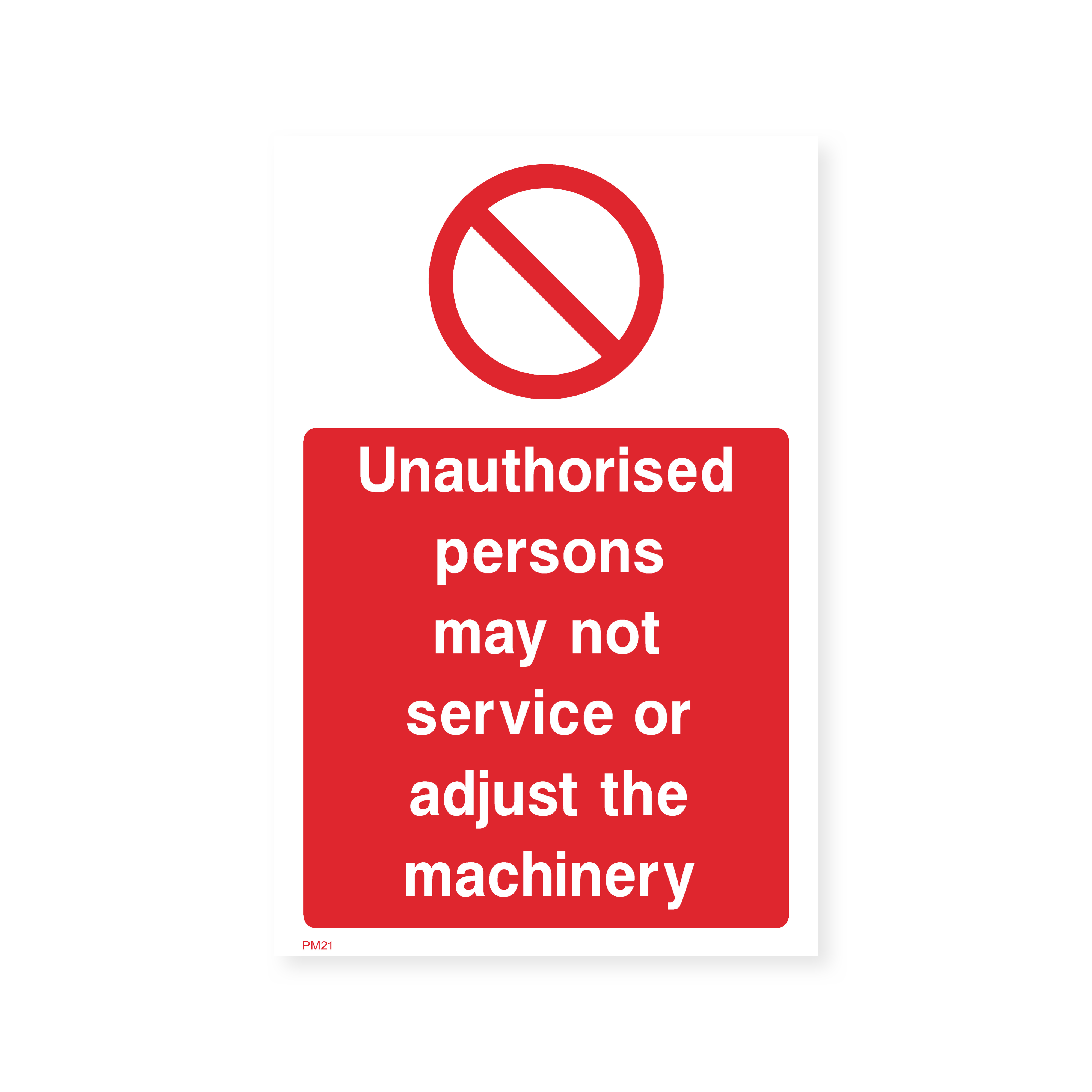 Ensure proper maintenance and safety with our "Unauthorised Persons May Not Service or Adjust the Machinery" portrait sign. Designed for optimal visibility, this sign clearly restricts machinery maintenance and adjustments to authorised personnel only, preventing accidents and ensuring equipment longevity.