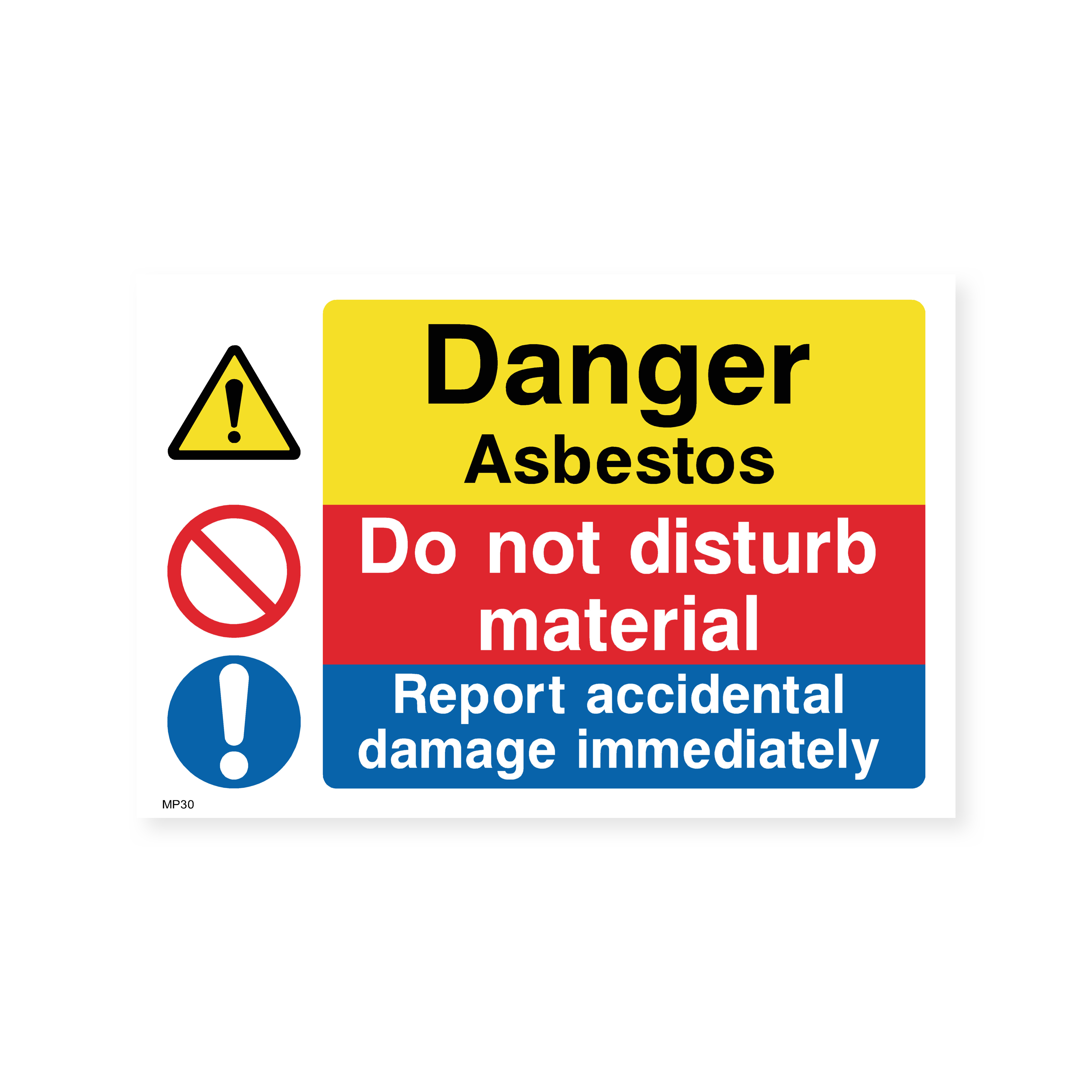 Prevent exposure to hazardous asbestos with this critical safety sign. It clearly warns against disturbing asbestos-containing materials and emphasizes the importance of reporting any accidental damage for prompt remediation. Ideal for construction sites, industrial facilities, and any environment where asbestos may be present.
