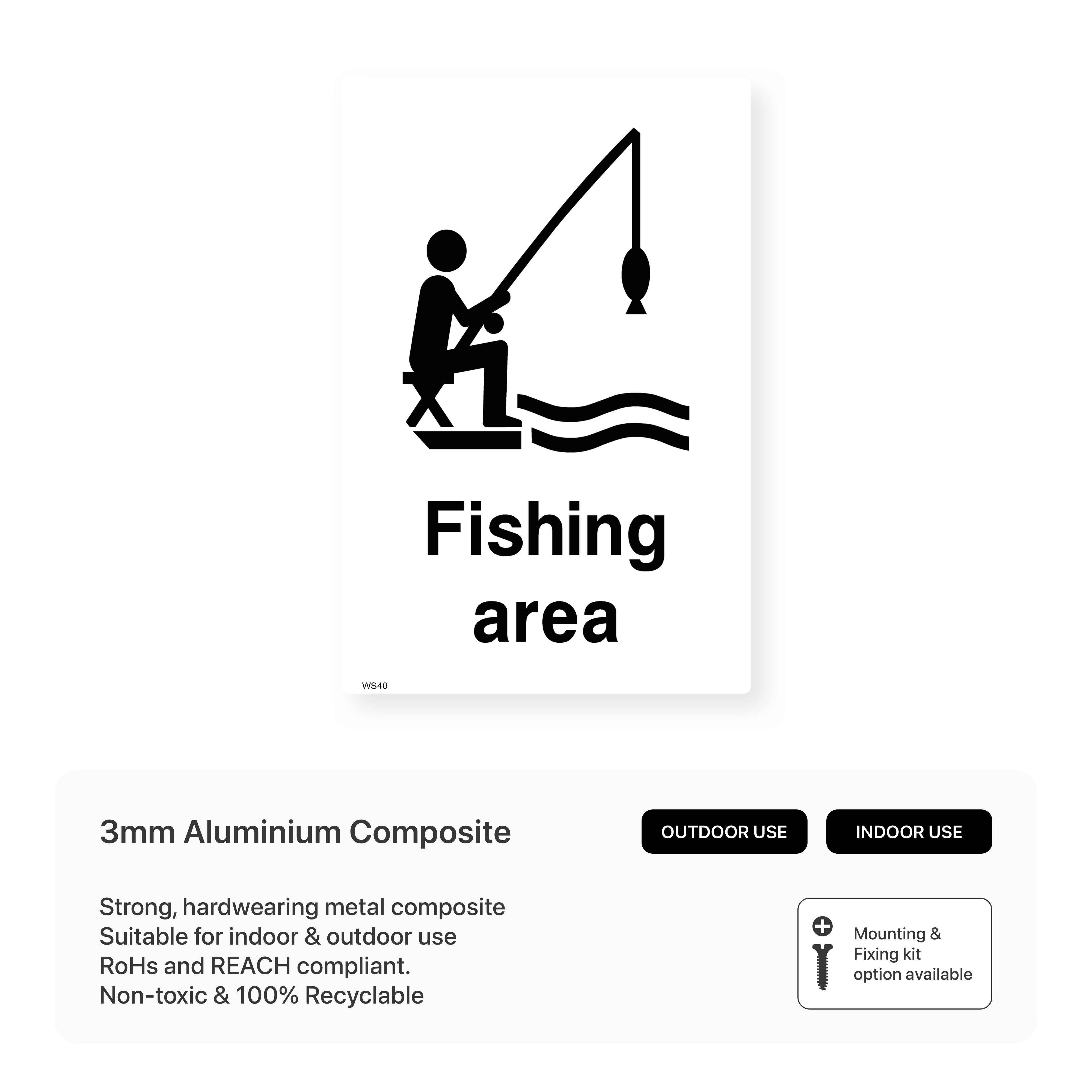 Clearly define fishing zones and promote responsible angling with our "Fishing Area" sign. Helps to prevent conflicts between anglers and other water users, ensuring a safe and enjoyable experience for everyone. Available in a range of sizes to suit different locations.